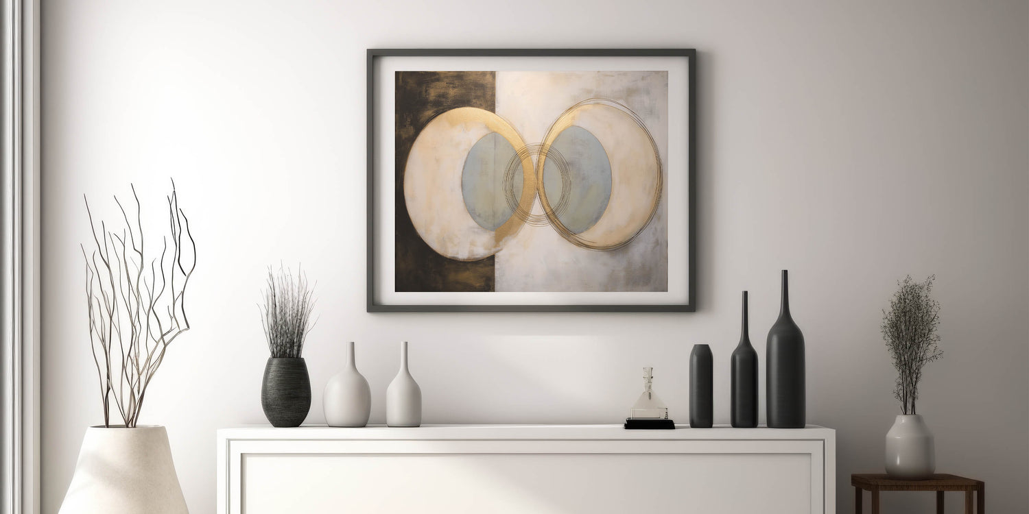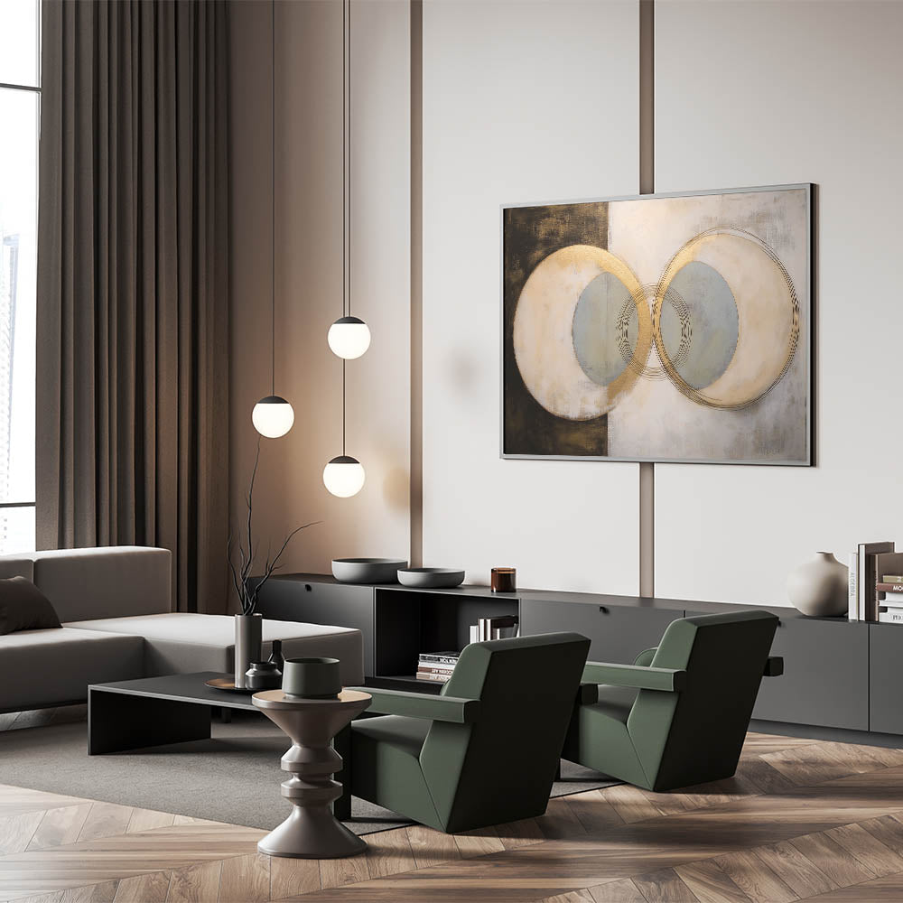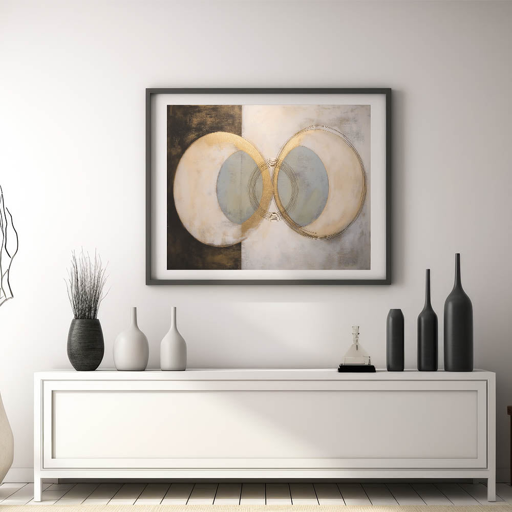 Enhance your space with this captivating geometric abstract wall art, featuring overlapping circular designs in gold, beige, and muted gray tones. This sophisticated artwork blends contemporary aesthetics with subtle textures, creating an elegant and harmonious visual effect. Its versatile design makes it perfect for adding warmth and style to living rooms, bedrooms, offices, or hallways.