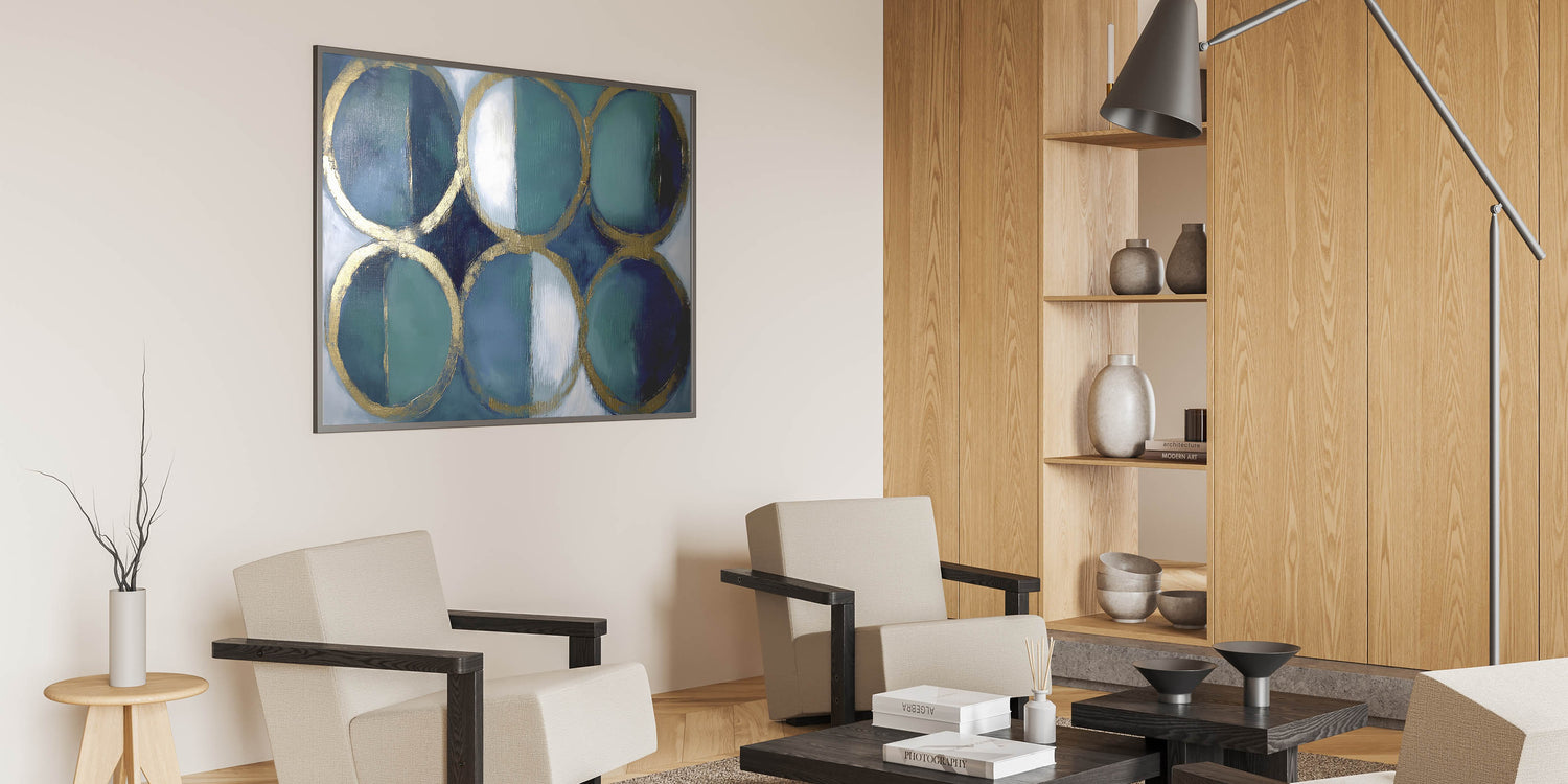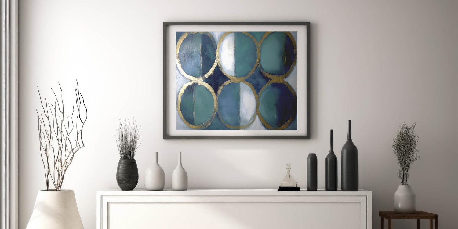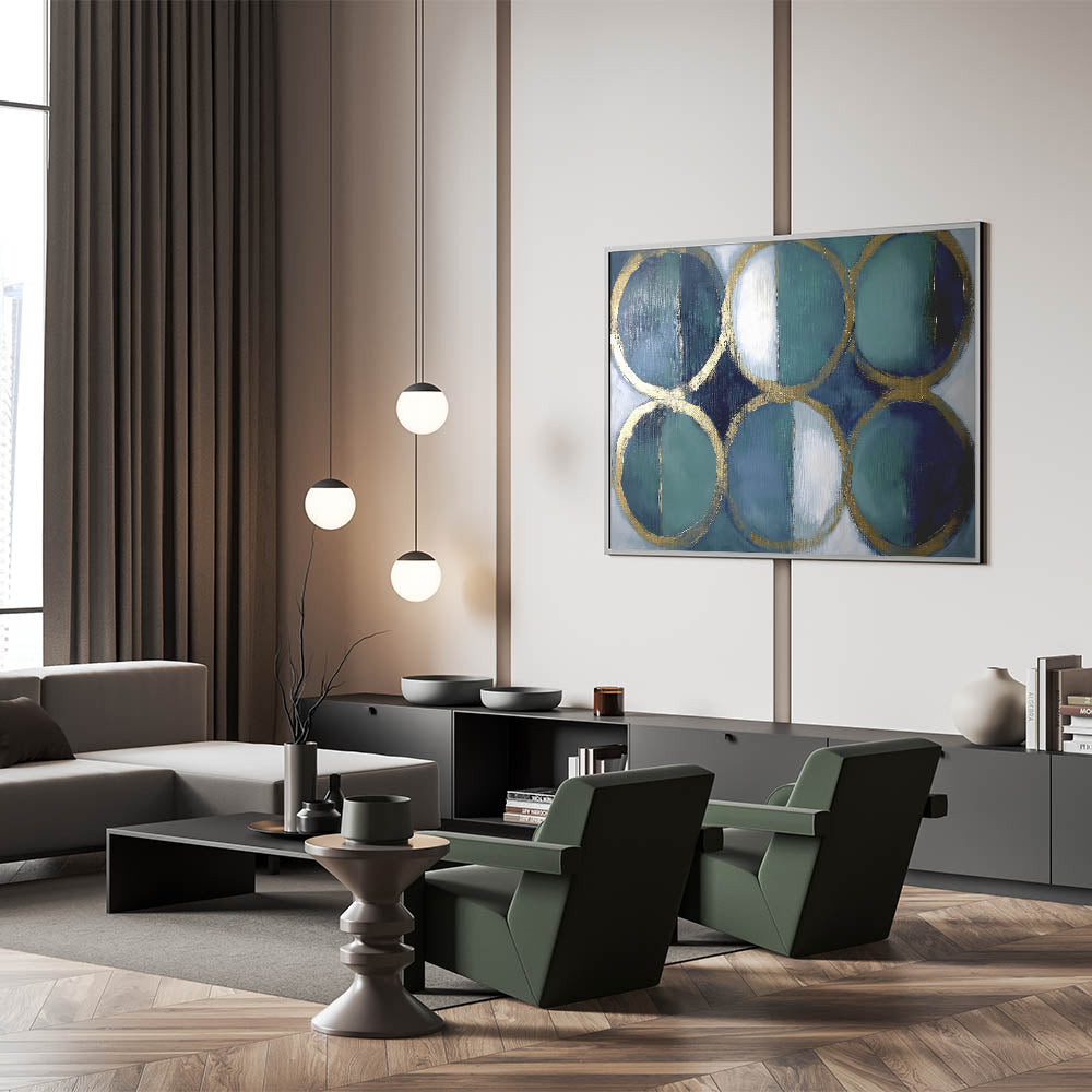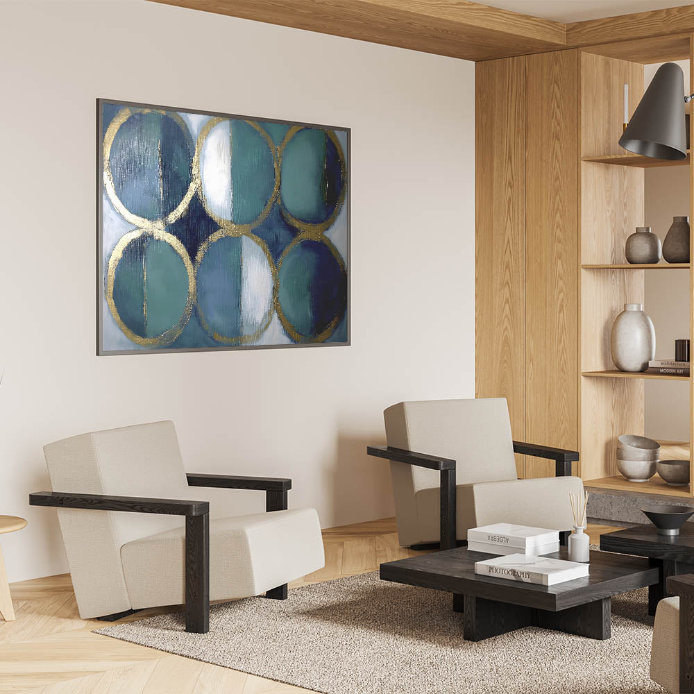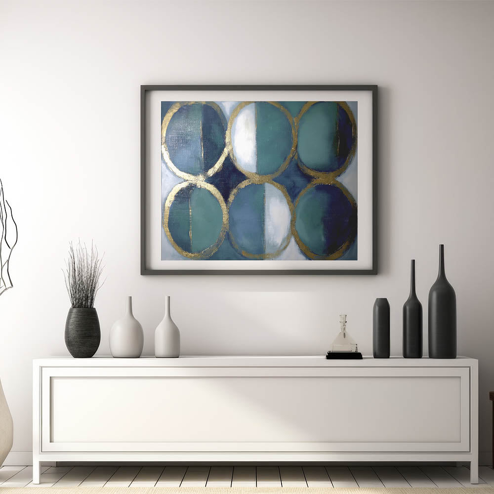 Make a bold statement with this captivating Abstract Geometric Painting, a perfect addition to modern interiors. This artwork features a mesmerizing composition of interconnected circles in shades of teal and navy, highlighted with shimmering gold accents. The geometric patterns bring a sense of harmony and balance, making it ideal for any stylish space.