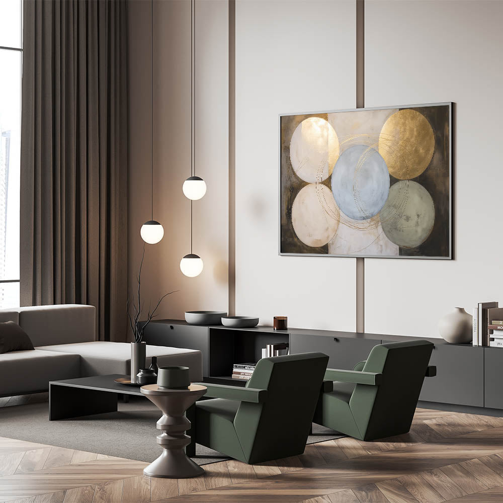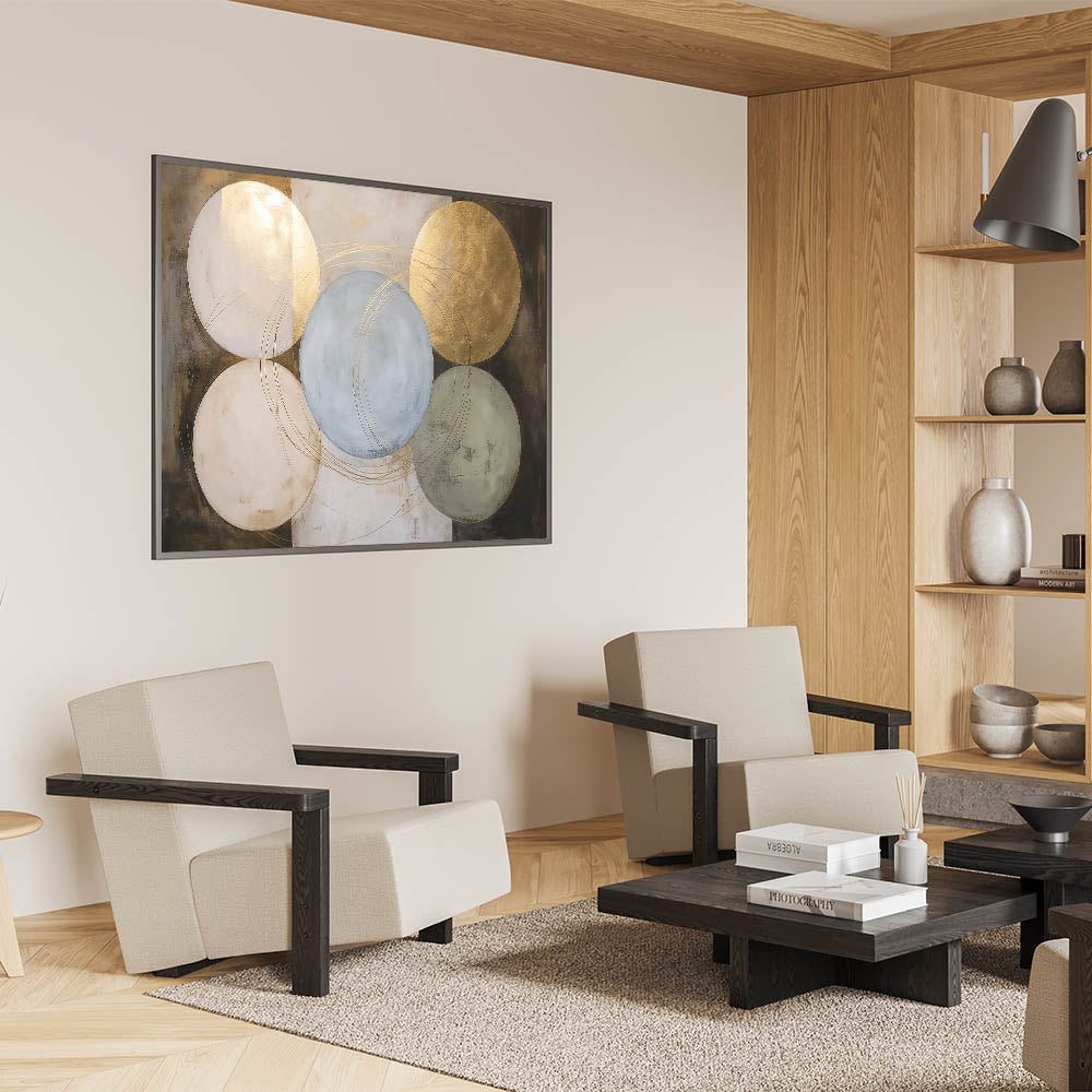 This geometric shapes artwork combines contemporary art pieces with classic circular patterns, creating a captivating focal point for your walls. Its rich palette and refined design make it an excellent choice for modern home decor or as a standout centerpiece in professional spaces.