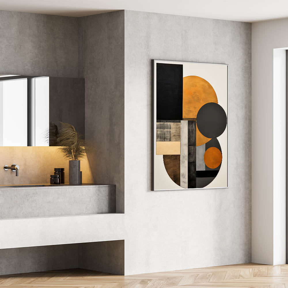 Add a striking focal point to your home with this modern abstract geometric wall art, featuring a bold combination of black, gold, gray, and burnt orange. The layered circles and rectangles create a dynamic visual arrangement that adds both depth and sophistication to any contemporary space. With its unique color palette and geometric shapes, this artwork is perfect for minimalist or modern interiors looking to make a bold artistic statement.