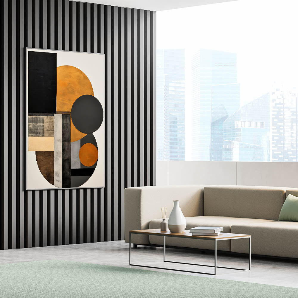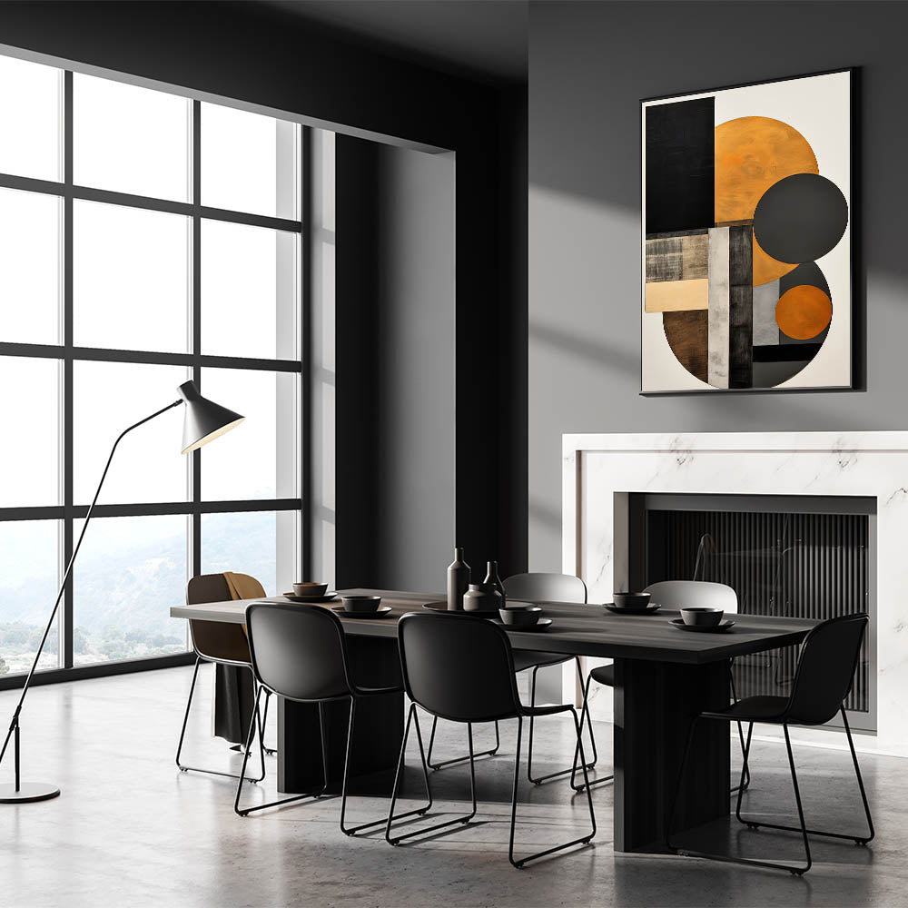 This artwork is ideal for those seeking a modern and sophisticated wall piece that combines bold colors with geometric precision. The warm tones of burnt orange and gold contrast beautifully with the sleek black and gray, making it a versatile addition to any space aiming for a balance of creativity and elegance.