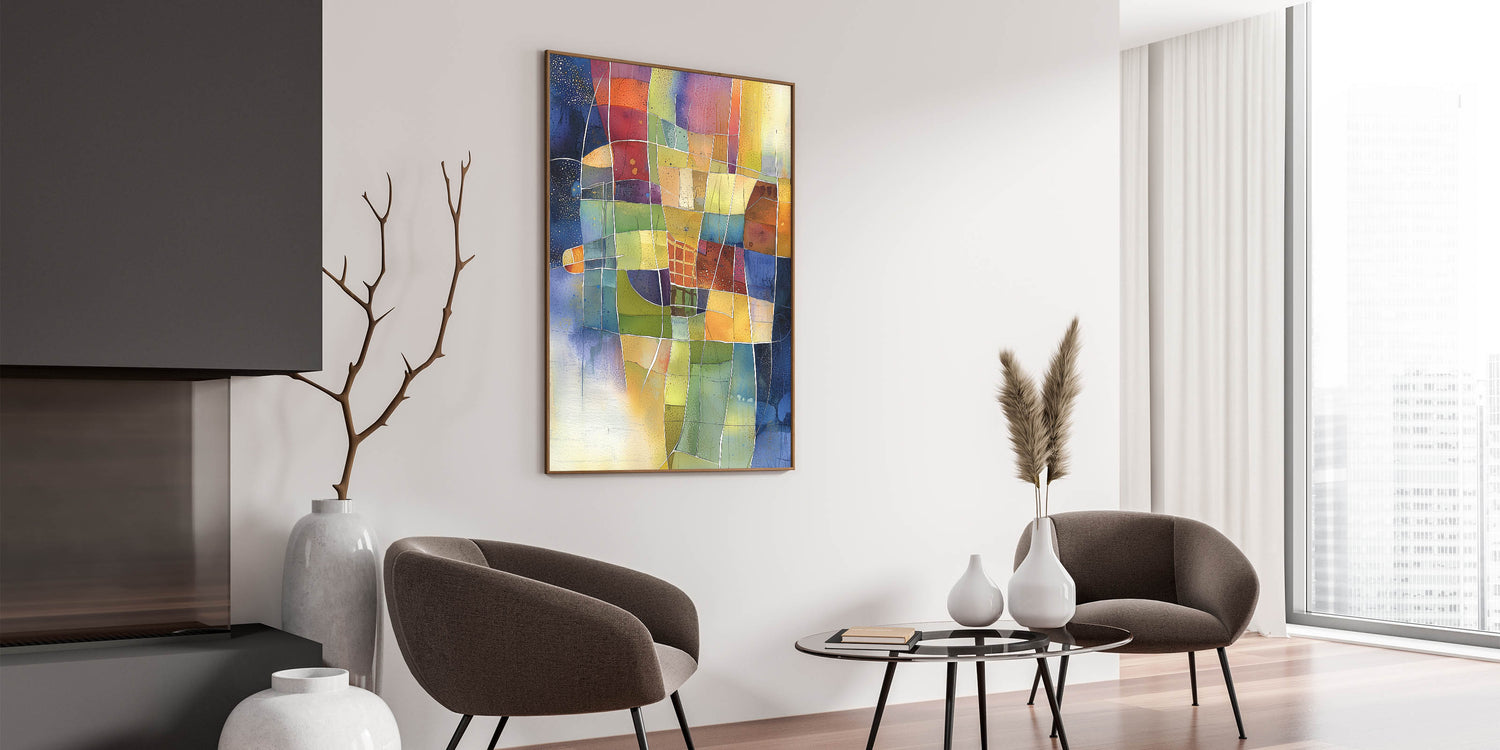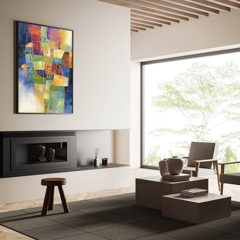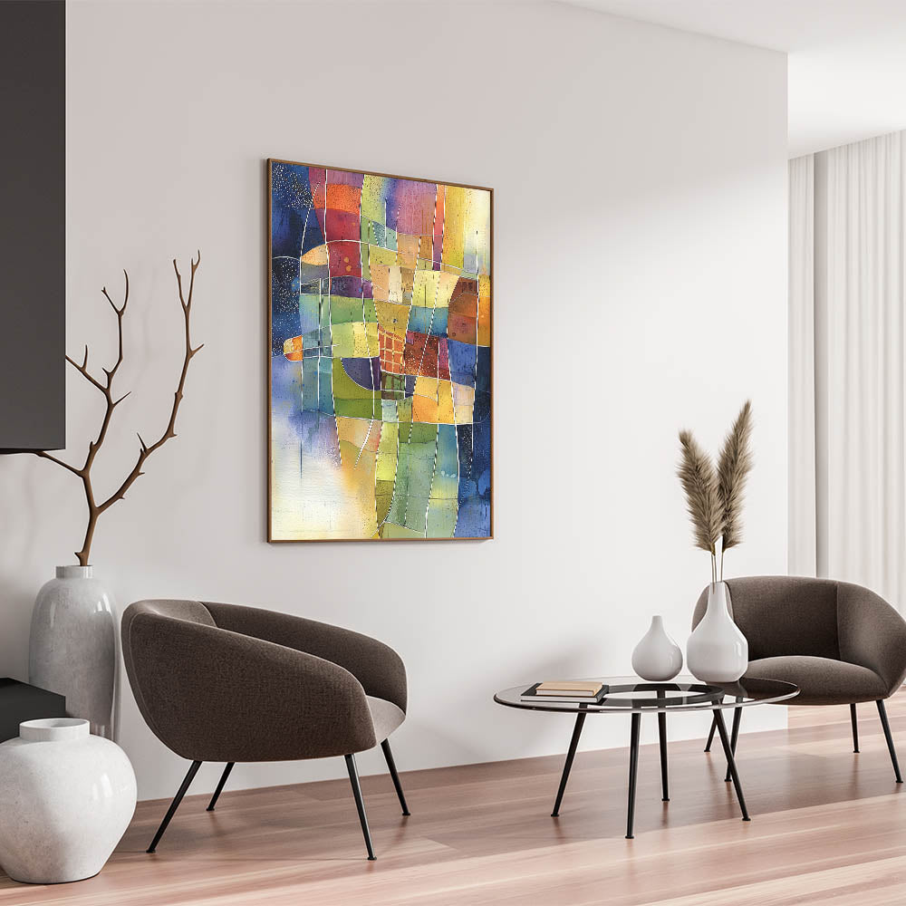 Enhance your space with this Abstract Geometric Wall Art, a vibrant mosaic of colors and textures. This dynamic composition blends rich hues of blue, green, orange, yellow, and red into an intricate grid of abstract shapes. The layered design and flowing lines create a sense of movement, making it a perfect centerpiece for modern and eclectic interiors.