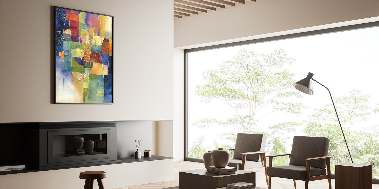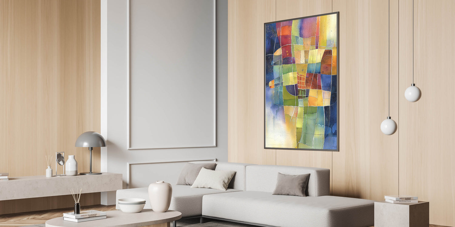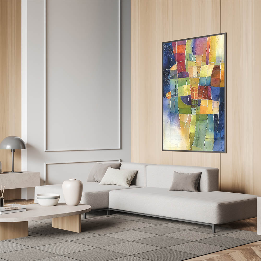 Enhance your space with this Abstract Geometric Wall Art, a vibrant mosaic of colors and textures. This dynamic composition blends rich hues of blue, green, orange, yellow, and red into an intricate grid of abstract shapes. The layered design and flowing lines create a sense of movement, making it a perfect centerpiece for modern and eclectic interiors.