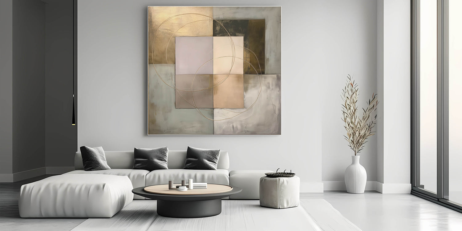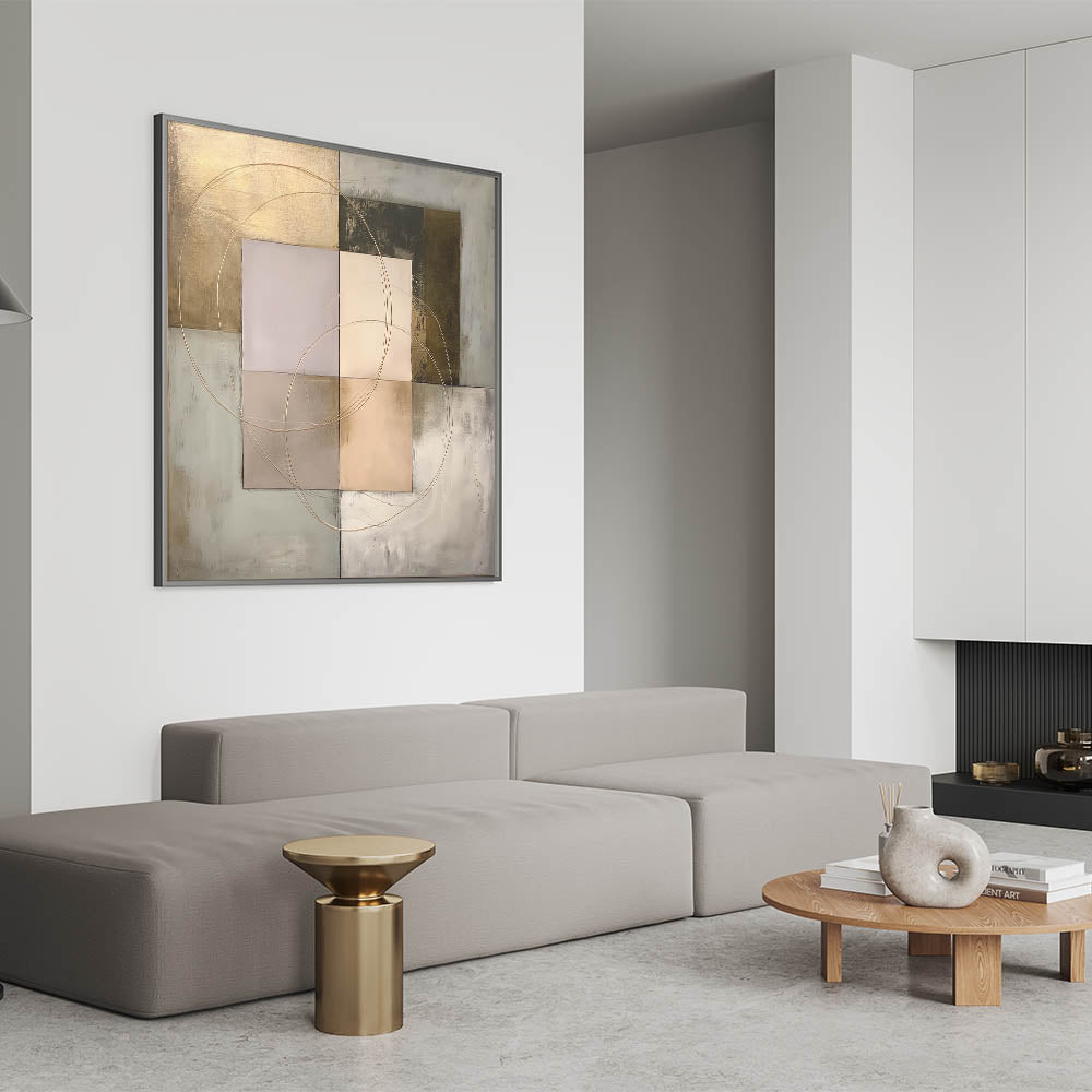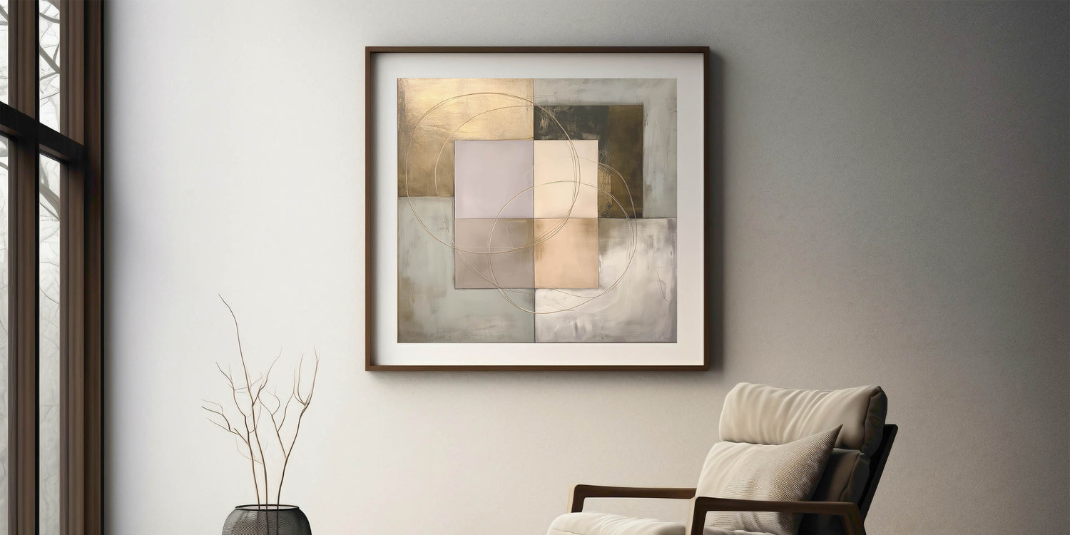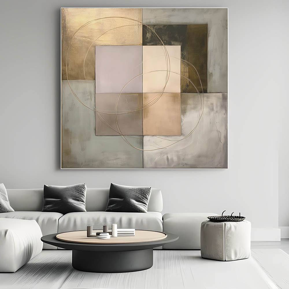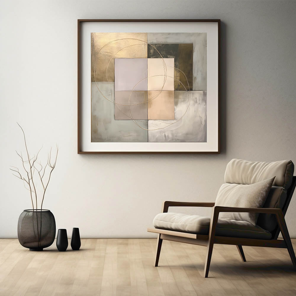 Abstract Geometric Wall Art - Neutral Squares with Gold Circular Details