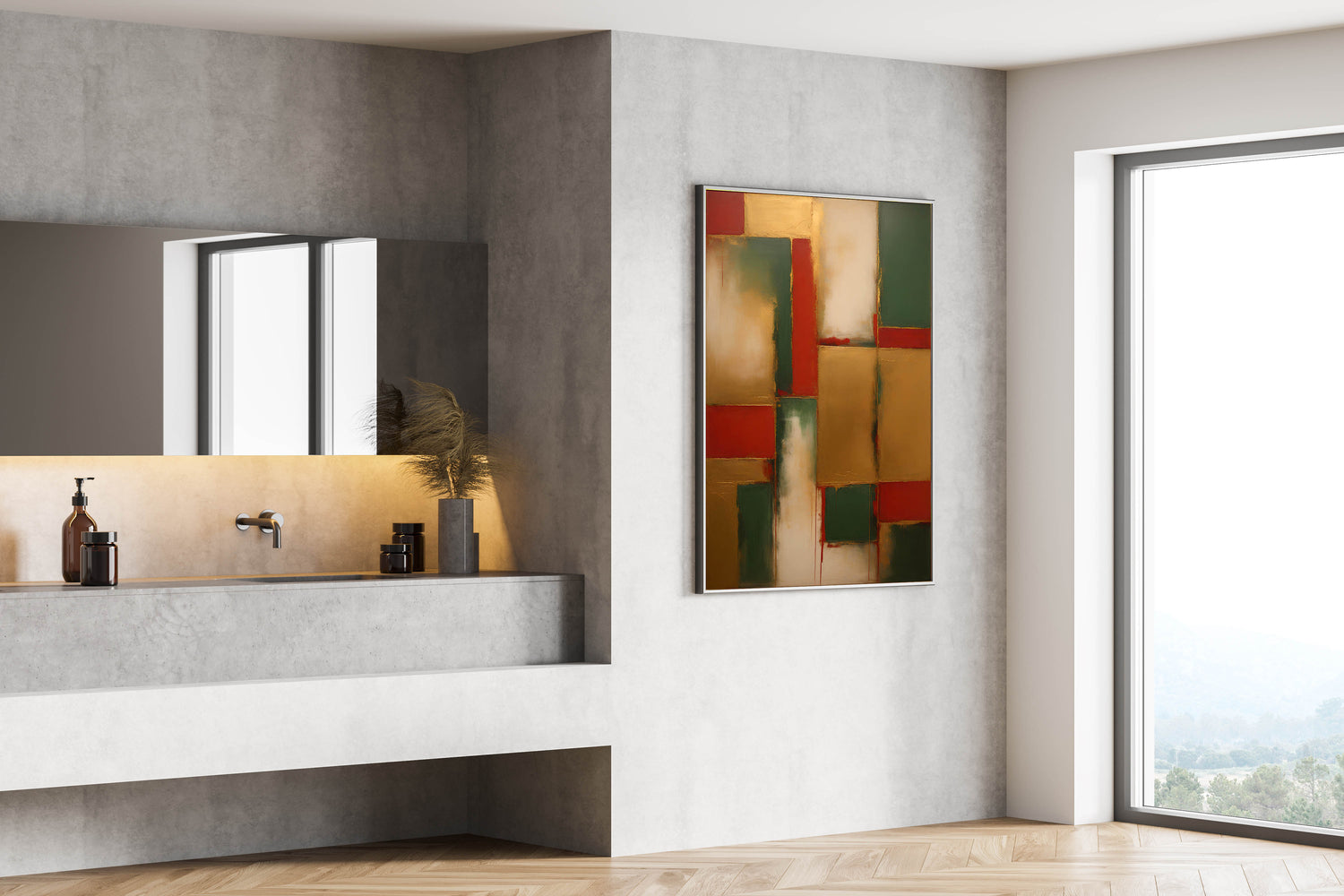 Infuse your space with vibrant colors and a touch of modern sophistication with this geometric abstract wall art. Featuring bold blocks of gold, red, and green, this design captures the eye with its striking contrast and elegant composition. The structured layout of the color blocks creates a balanced yet dynamic aesthetic, making it an excellent choice for contemporary or transitional interiors. The metallic gold accents add a luxurious feel, enhancing the depth and texture of the artwork.