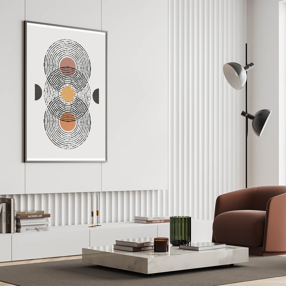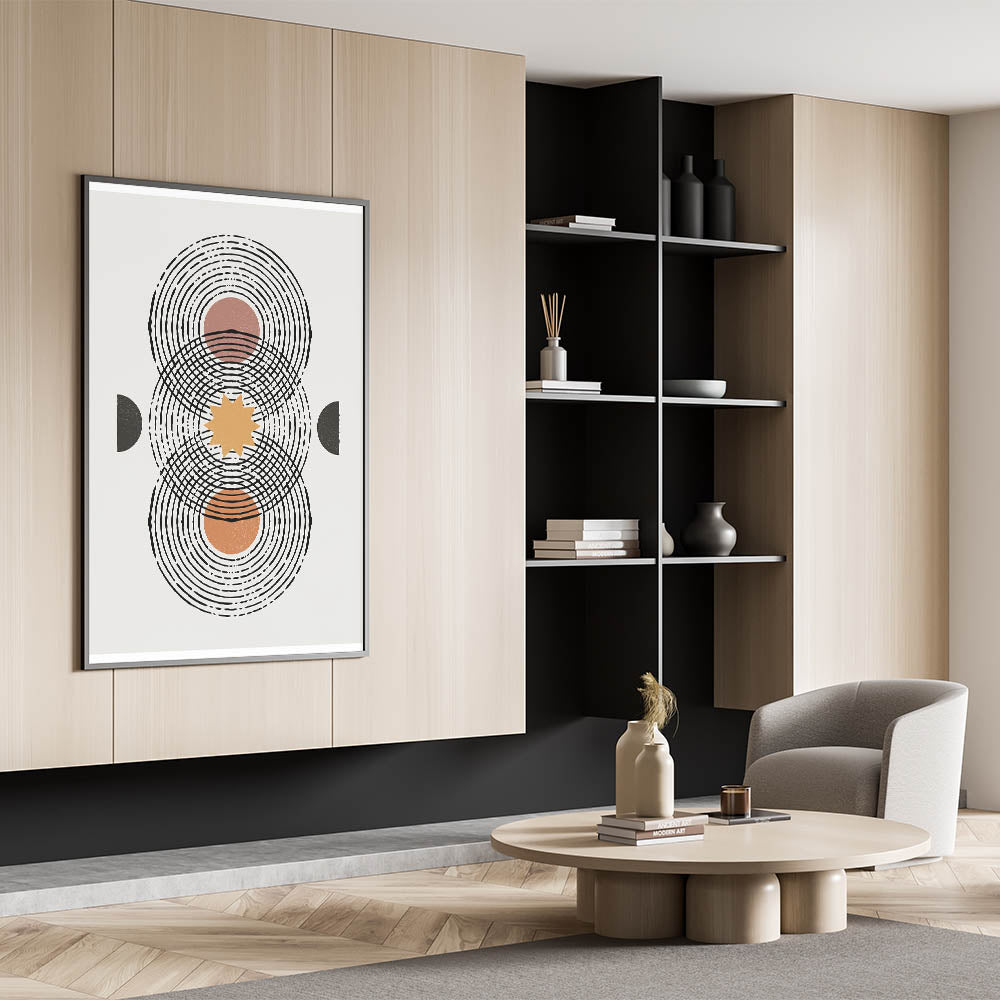 Add a touch of sophistication to your space with this abstract minimalist artwork, featuring a captivating blend of geometric circles and a central sunburst. The design showcases a harmonious palette of earthy tones, including warm browns, oranges, and blacks, all set against a subtle off-white background. This piece is perfect for those who appreciate the intersection of modern design and minimalist aesthetics.