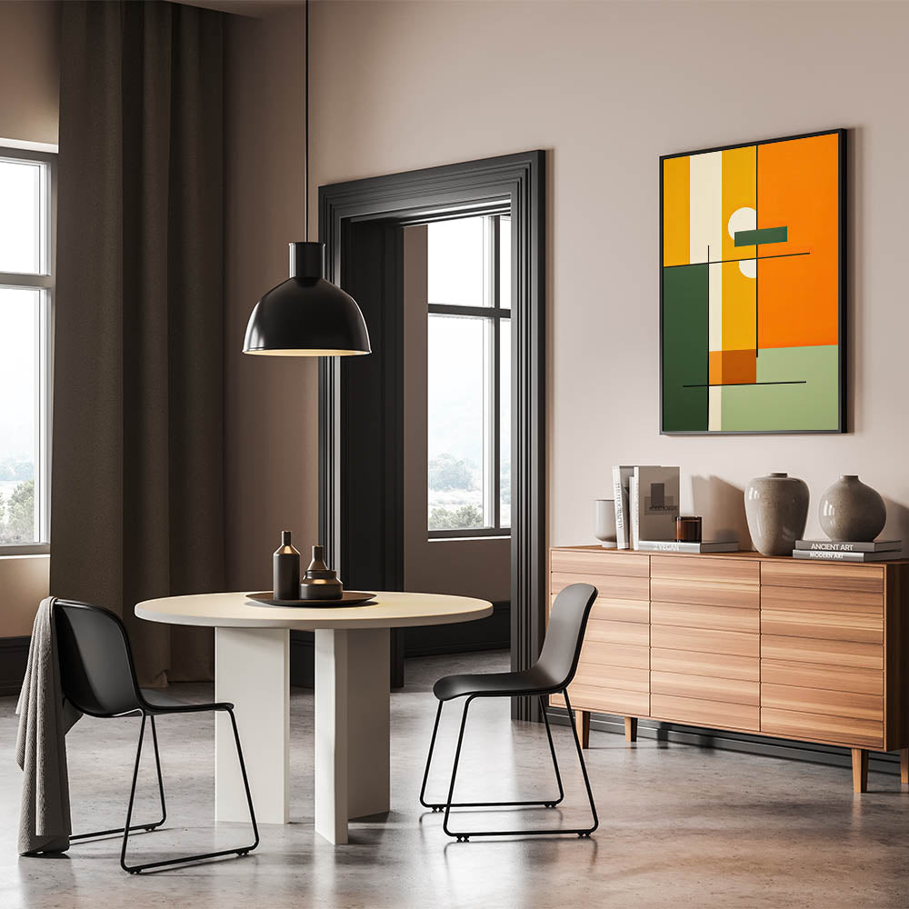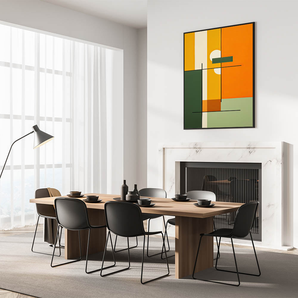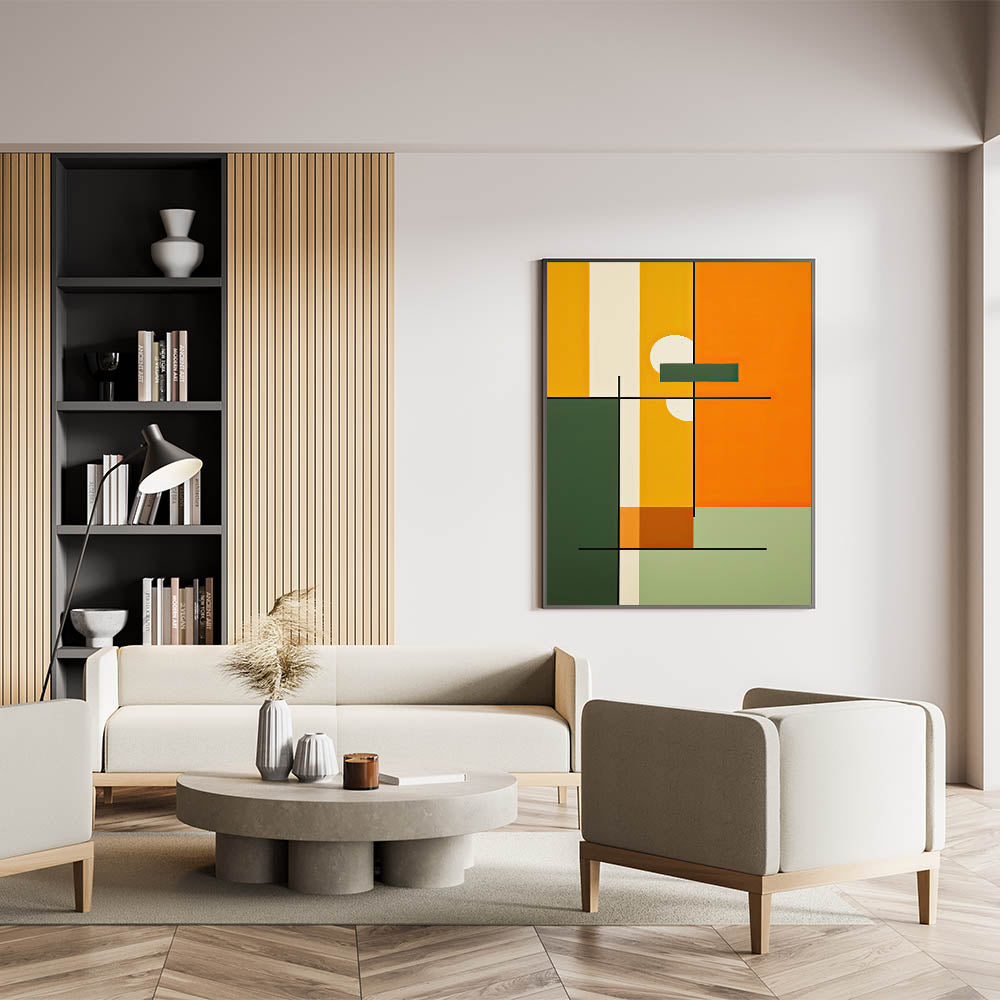 Brighten up your space with this modern minimalist art featuring a striking geometric design in vibrant orange, green, and yellow tones. The clean lines and sharp contrasts make this abstract minimalist painting a perfect addition to any contemporary or minimalist setting. Its bold yet simple composition creates a balanced, sophisticated look that enhances the elegance of your room.