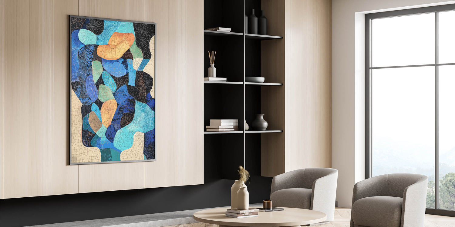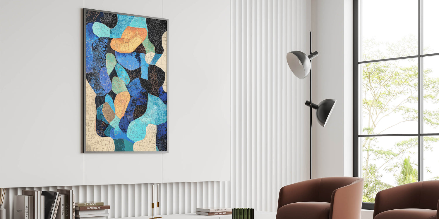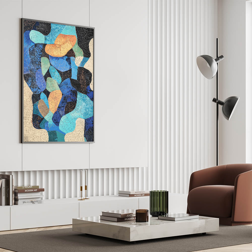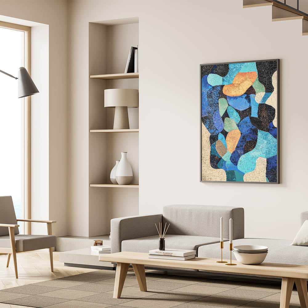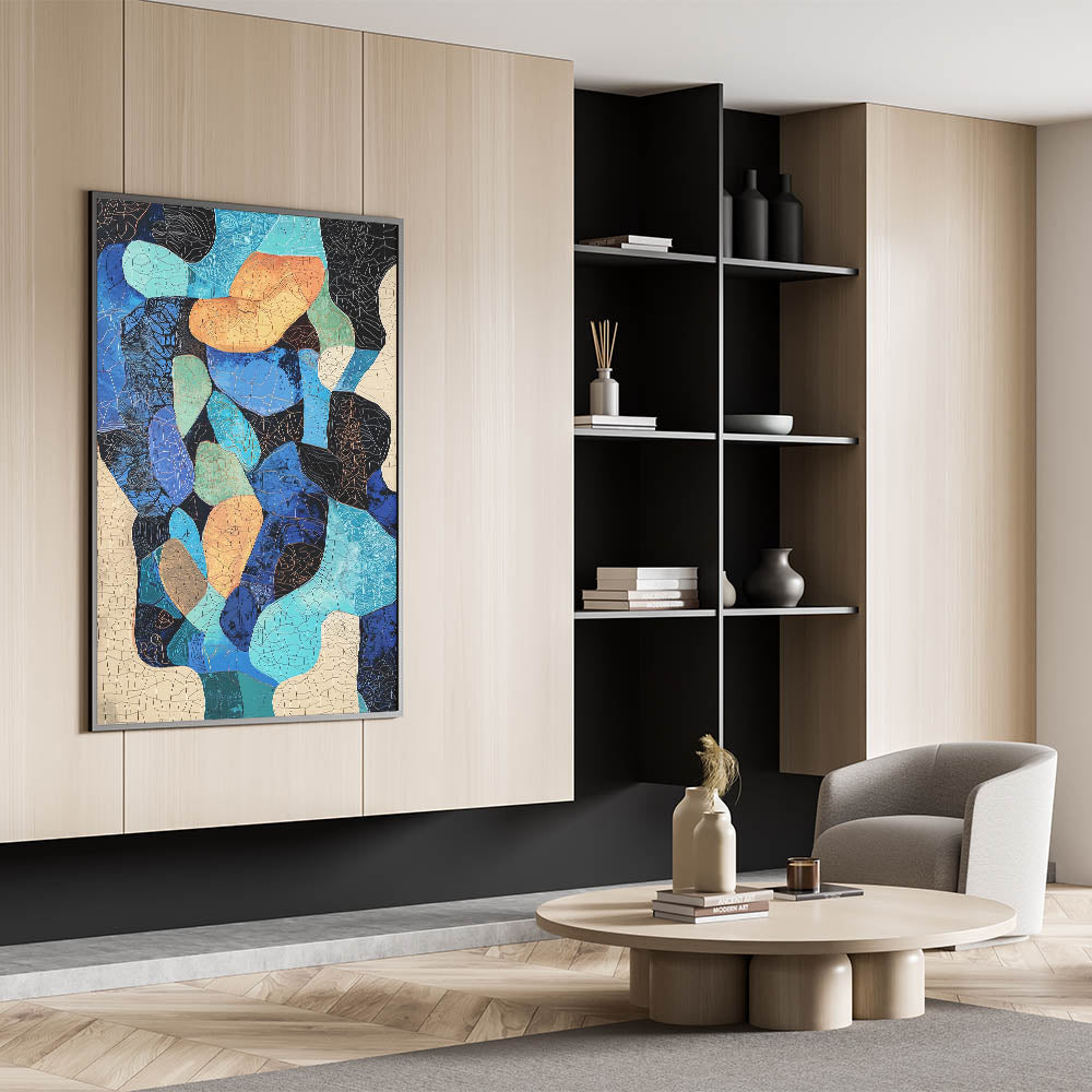 Transform your space with this bold and vibrant abstract mosaic-inspired wall art. Featuring a dynamic arrangement of blue, teal, orange, and black shapes with intricate textures, this piece creates a sense of movement and energy. The cracked mosaic detailing adds depth and dimension, making it a captivating choice for modern and eclectic interiors.