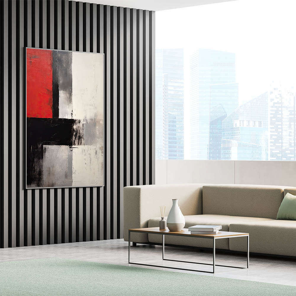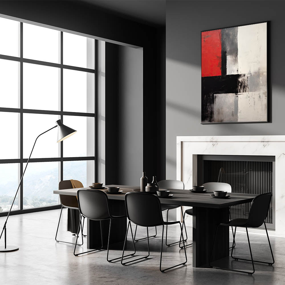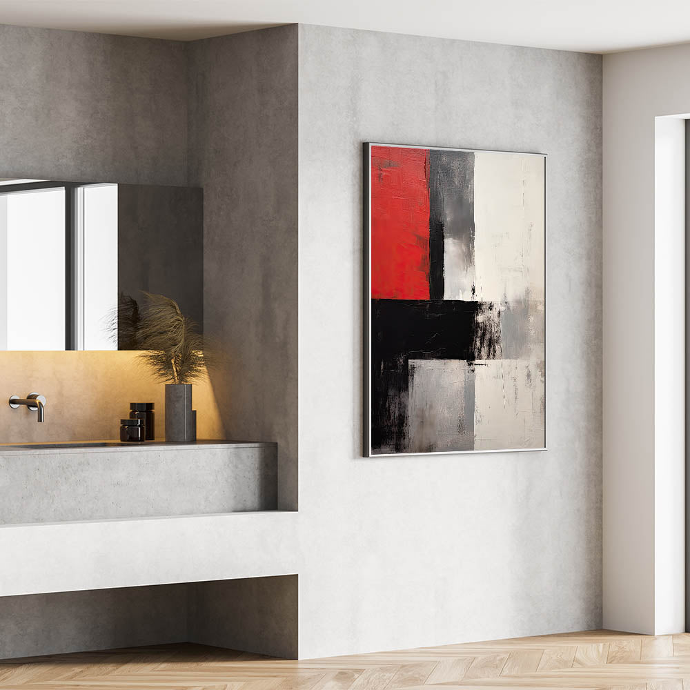 Make a statement with this striking minimalist wall art that features bold geometric shapes in red, black, white, and gray. This abstract minimalist painting combines powerful colors with a clean, structured design to create a captivating visual experience. Its sharp contrasts and contemporary style make it ideal for those seeking a piece that embodies minimal art style while adding energy and sophistication to any room.