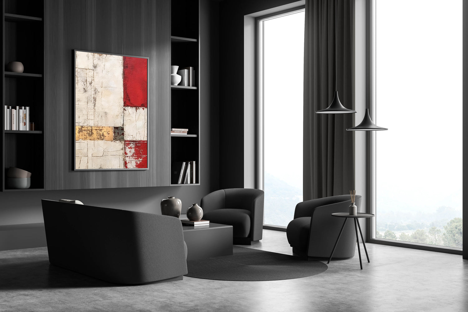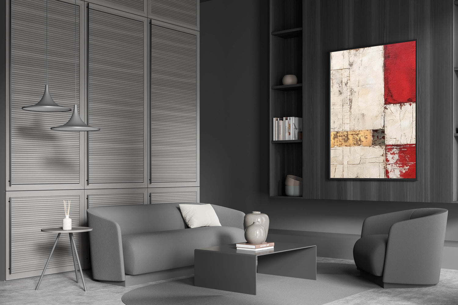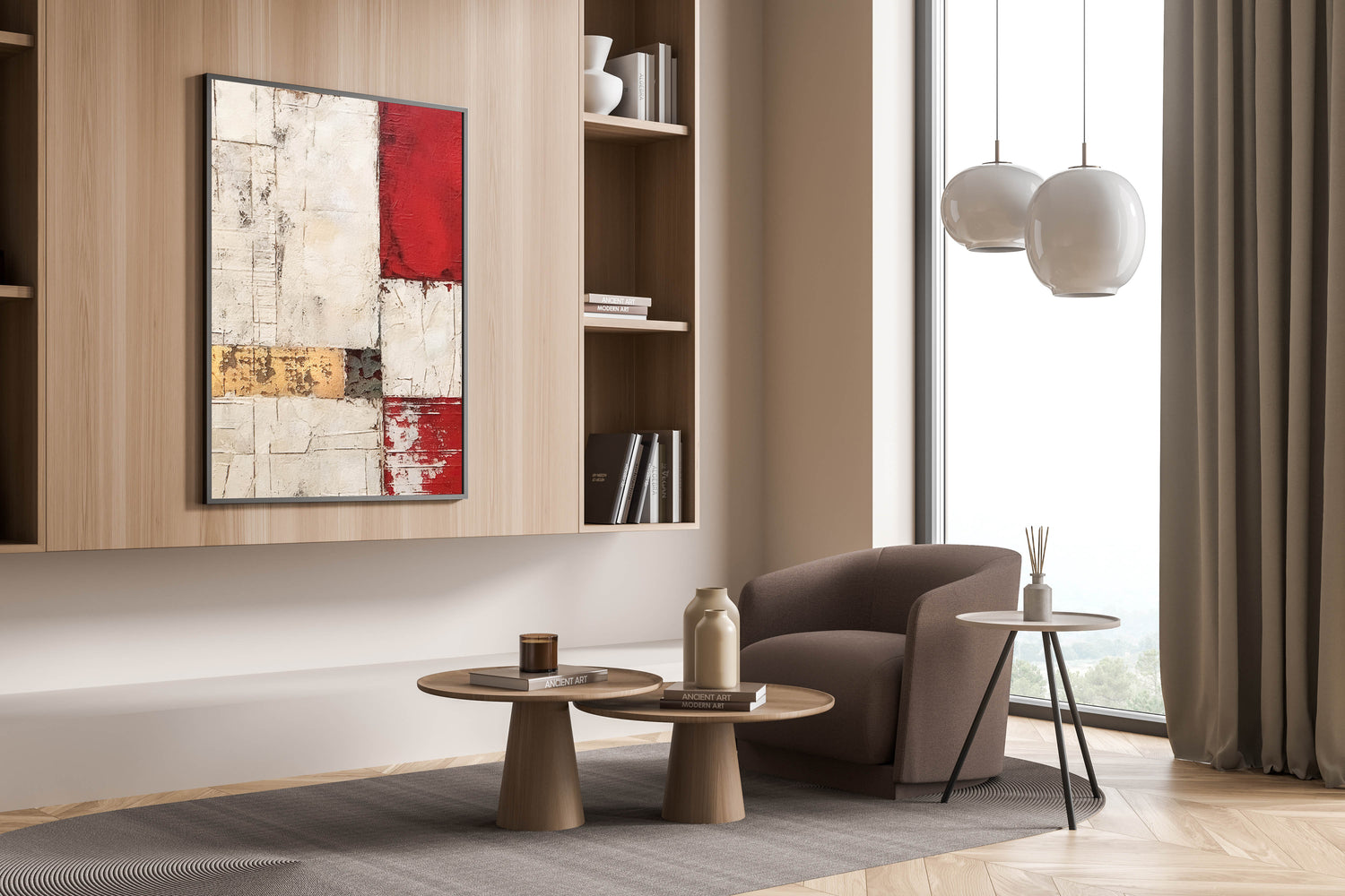 Add a striking, modern touch to your space with this bold geometric abstract strokes art. Featuring a rich palette of red, white, and gold, this piece brings warmth and sophistication to any room. The textured design and geometric patterns create visual interest, making it a perfect choice for living rooms, offices, or contemporary spaces that need a pop of color and style.