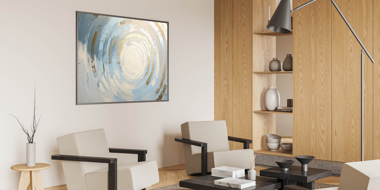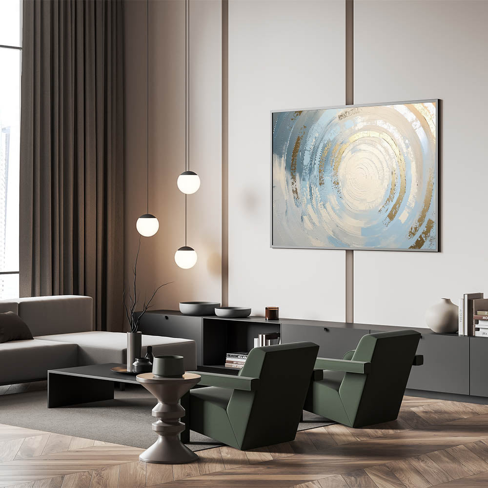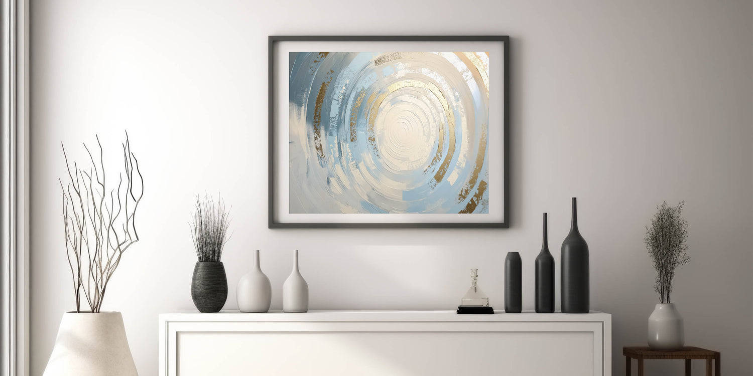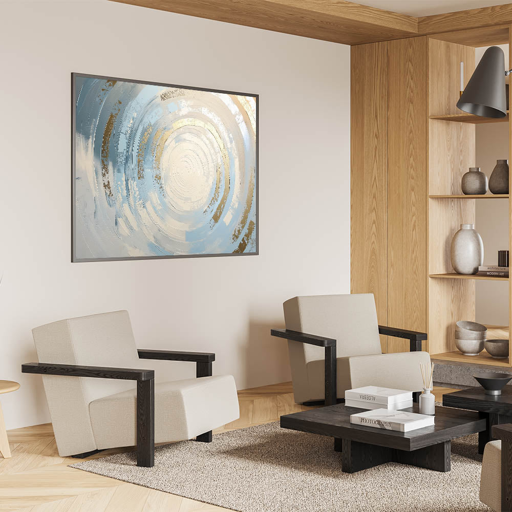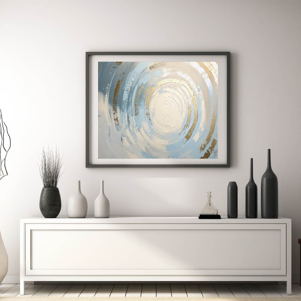 Enhance your home with this contemporary abstract canvas featuring mesmerizing concentric circles in soft blue, gold, and white tones. This geometric abstract design offers a modern aesthetic, blending clean lines with dynamic movement. Perfect for creating a calming and stylish atmosphere, this artwork complements living rooms, bedrooms, or office spaces.