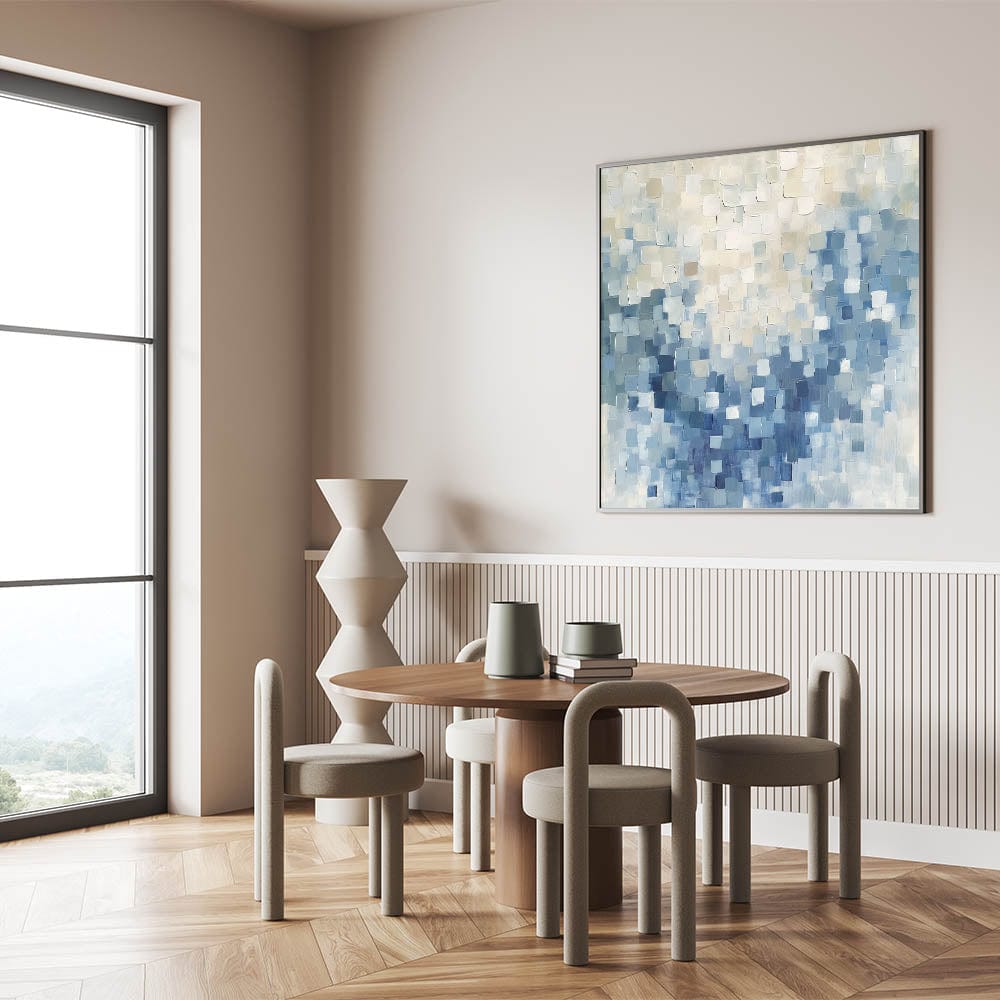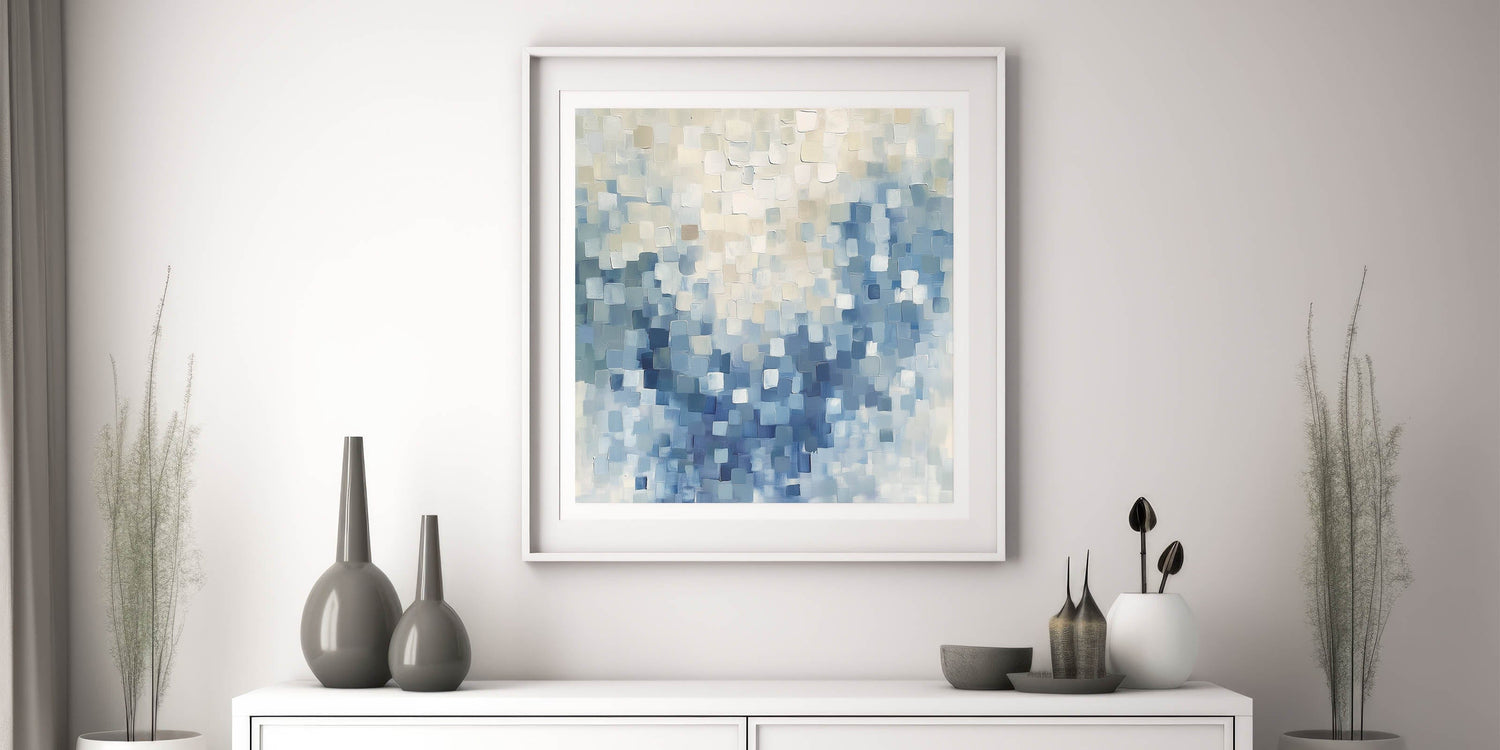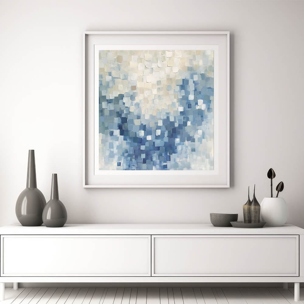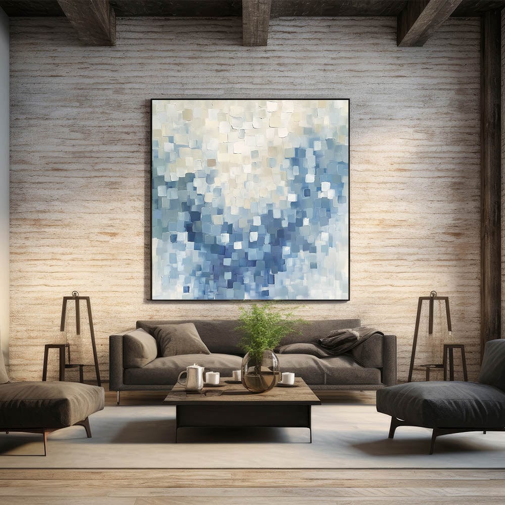 Elevate your interior with the calming presence of this contemporary abstract canvas titled “Mosaic Motion in Soft Blues.” Soft-edged squares float across the surface in layers of gray blue, sky blue, and creamy whites, creating a peaceful yet modern rhythm. This minimalist abstract wall art makes a subtle but impactful statement in any room.