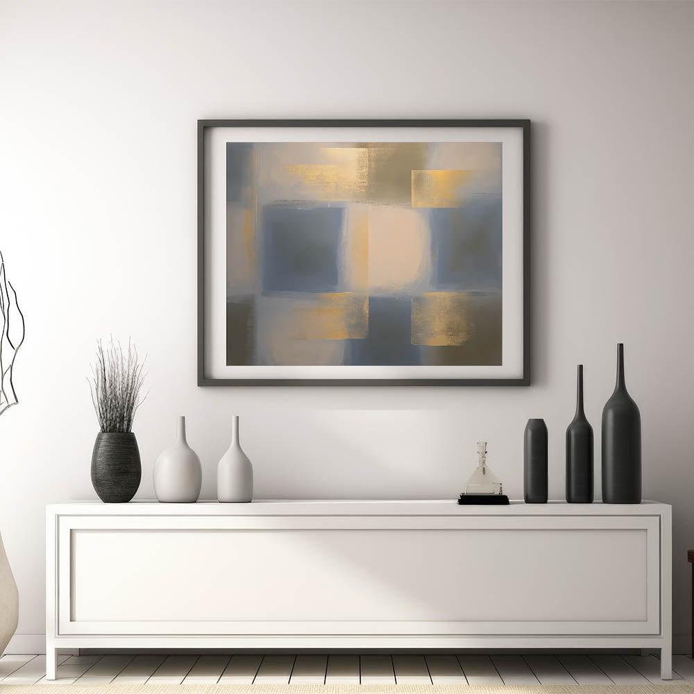Enhance your home with this captivating Geometric Abstract Wall Art, a modern masterpiece designed to bring sophistication and depth to your walls. Featuring layered rectangular shapes in a calming palette of muted blue, gold, and light gray, this piece offers a serene yet striking visual experience.