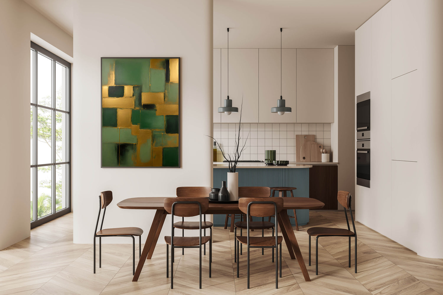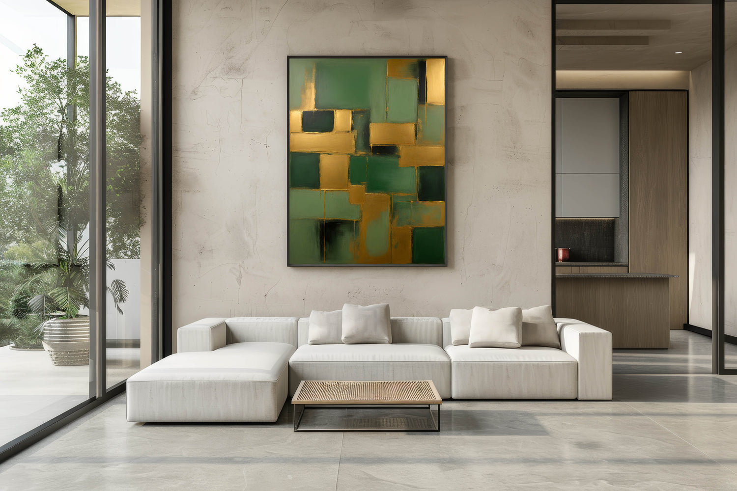 Add a touch of sophistication and luxury to your decor with this stunning deep green and gold geometric abstract art. The design features bold, layered rectangles with textured strokes and dripping gold accents, creating a dynamic and elegant visual appeal. The harmonious blend of green tones and metallic gold gives this artwork a refined and upscale look, making it a perfect fit for modern, eclectic, or nature-inspired interiors.