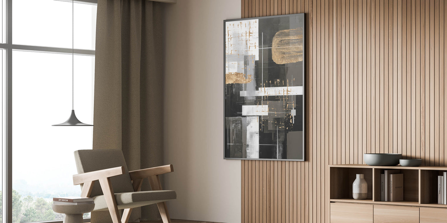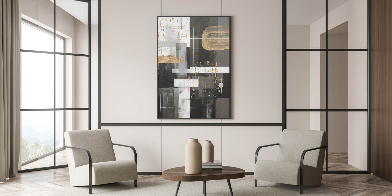 Elegant Geometric Modern Abstract Wall Art - Black, White, Gold Canvas