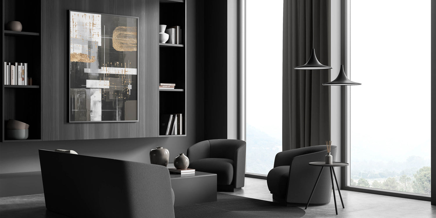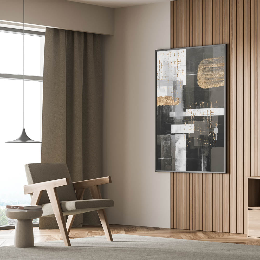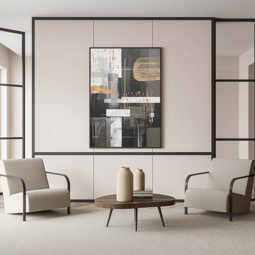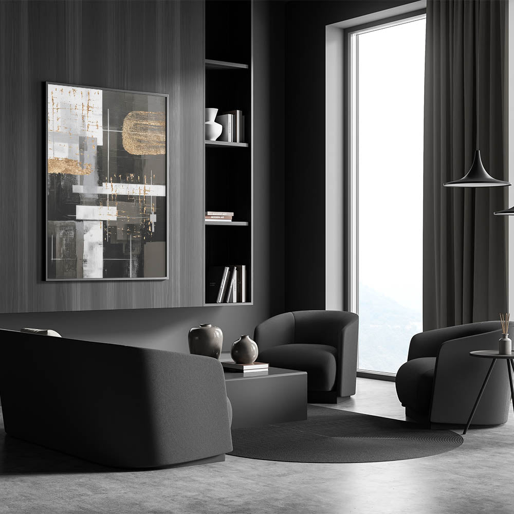 Introduce an elegant touch to your home decor with this stunning piece of modern abstract wall art. This geometric abstract design features a sophisticated blend of black, white, and gold tones, creating a striking visual impact that will elevate any space.