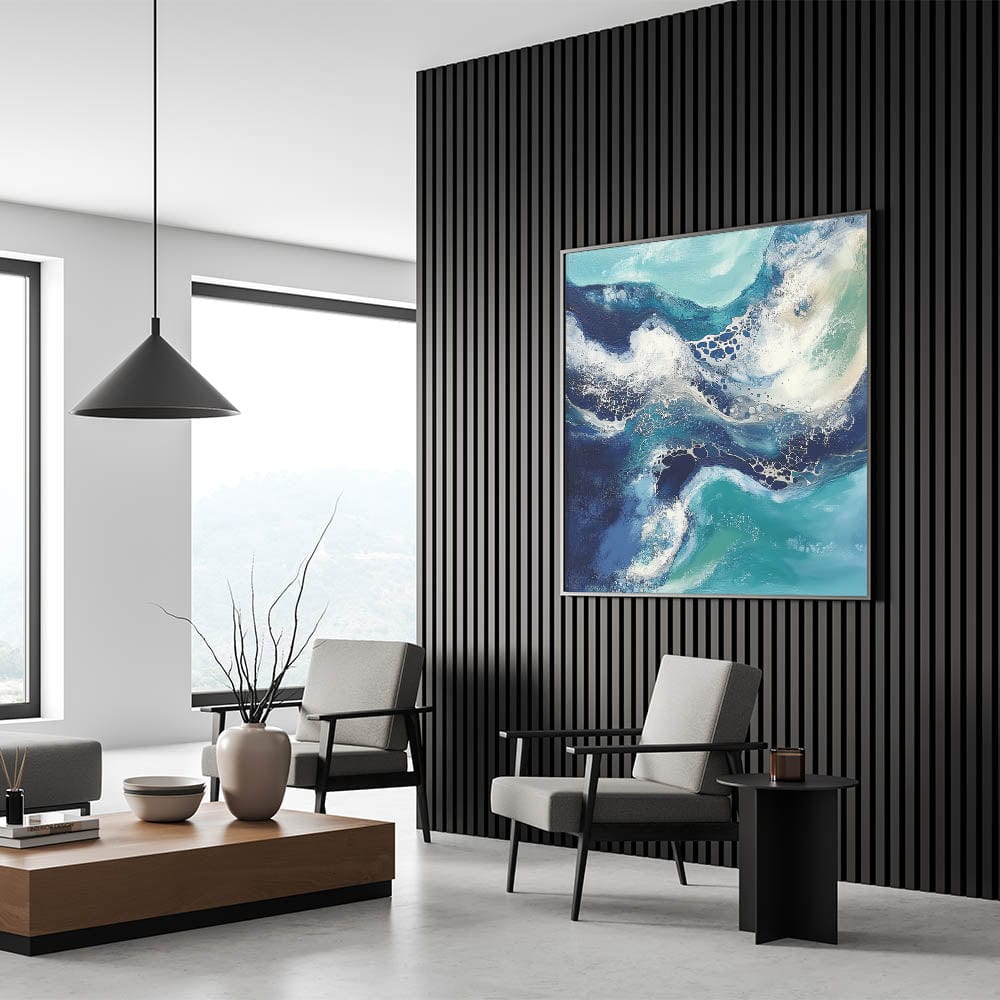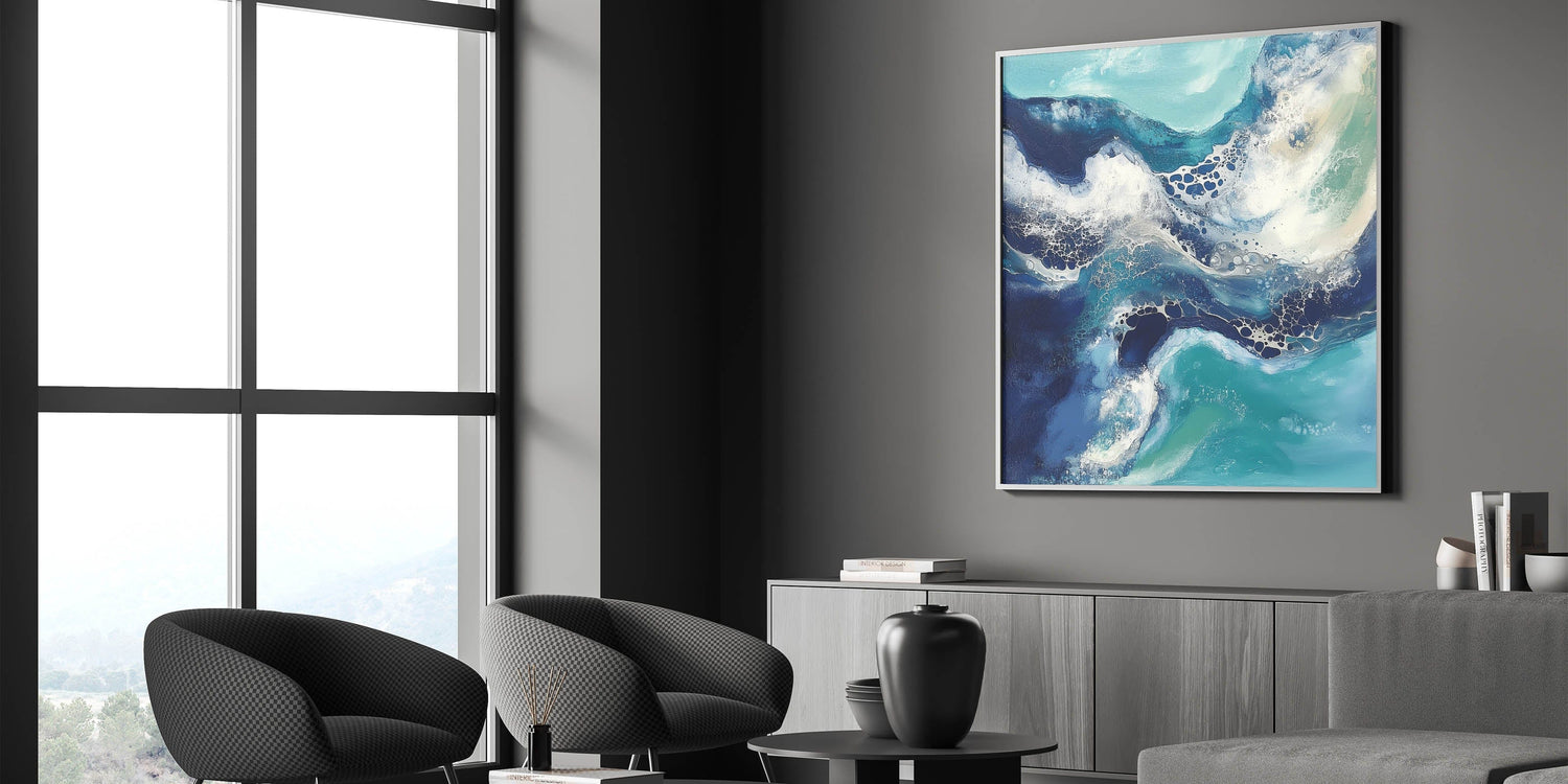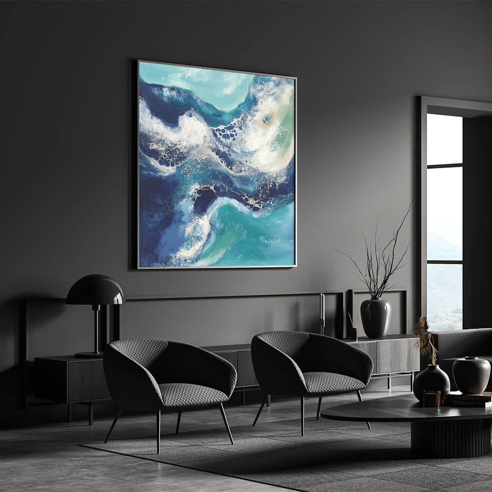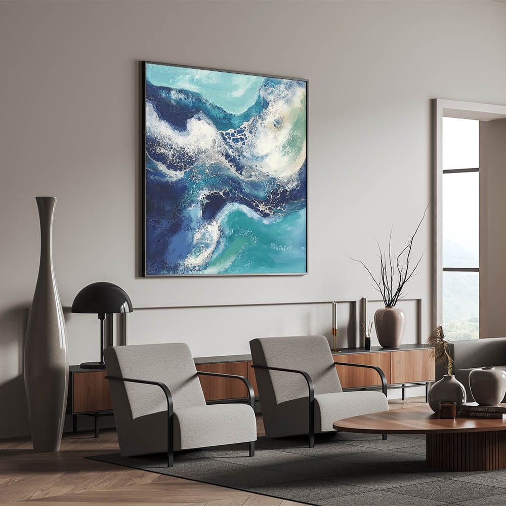 Experience the energy of the sea in motion with this fluid acrylic wall decor. Vivid shades of turquoise, aqua, navy blue, and white create an ocean-like composition that bubbles and flows across the canvas. Perfect for modern homes and beach-inspired interiors.