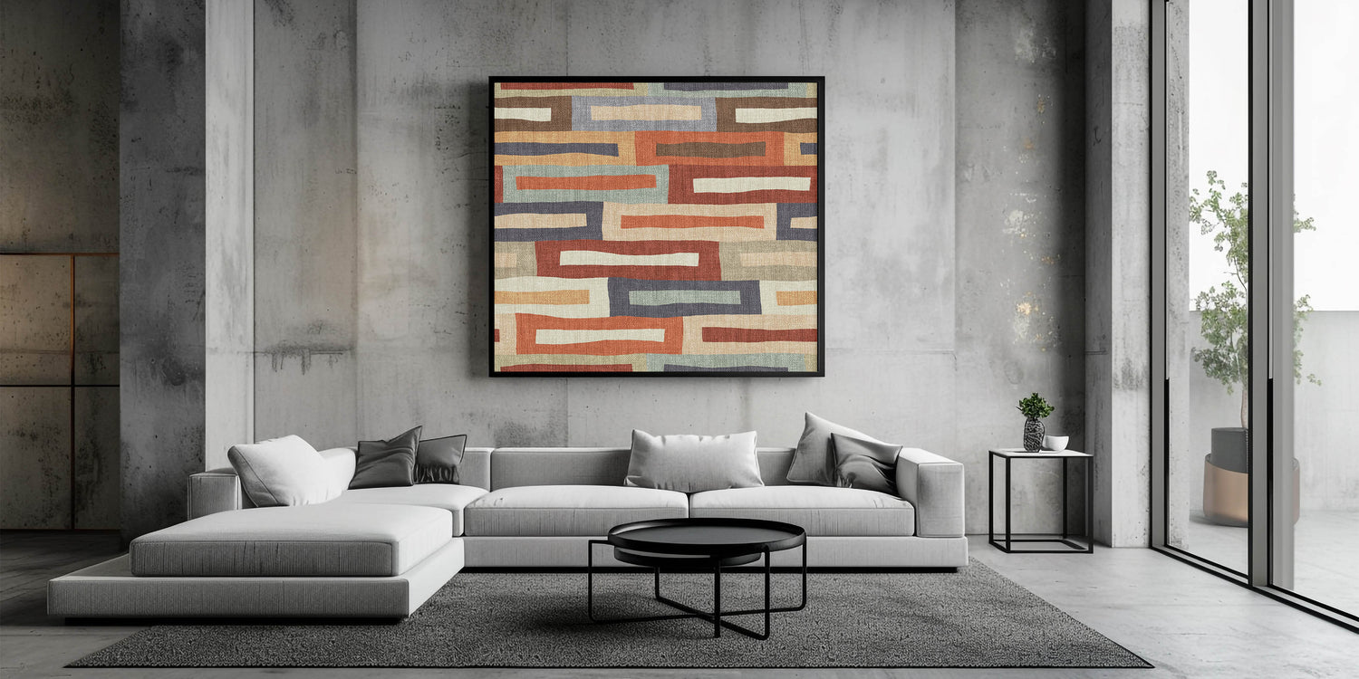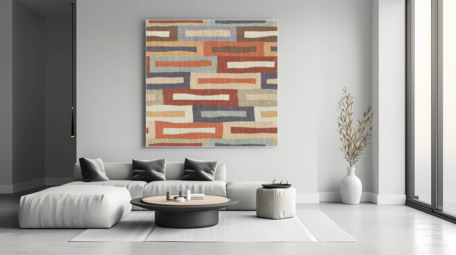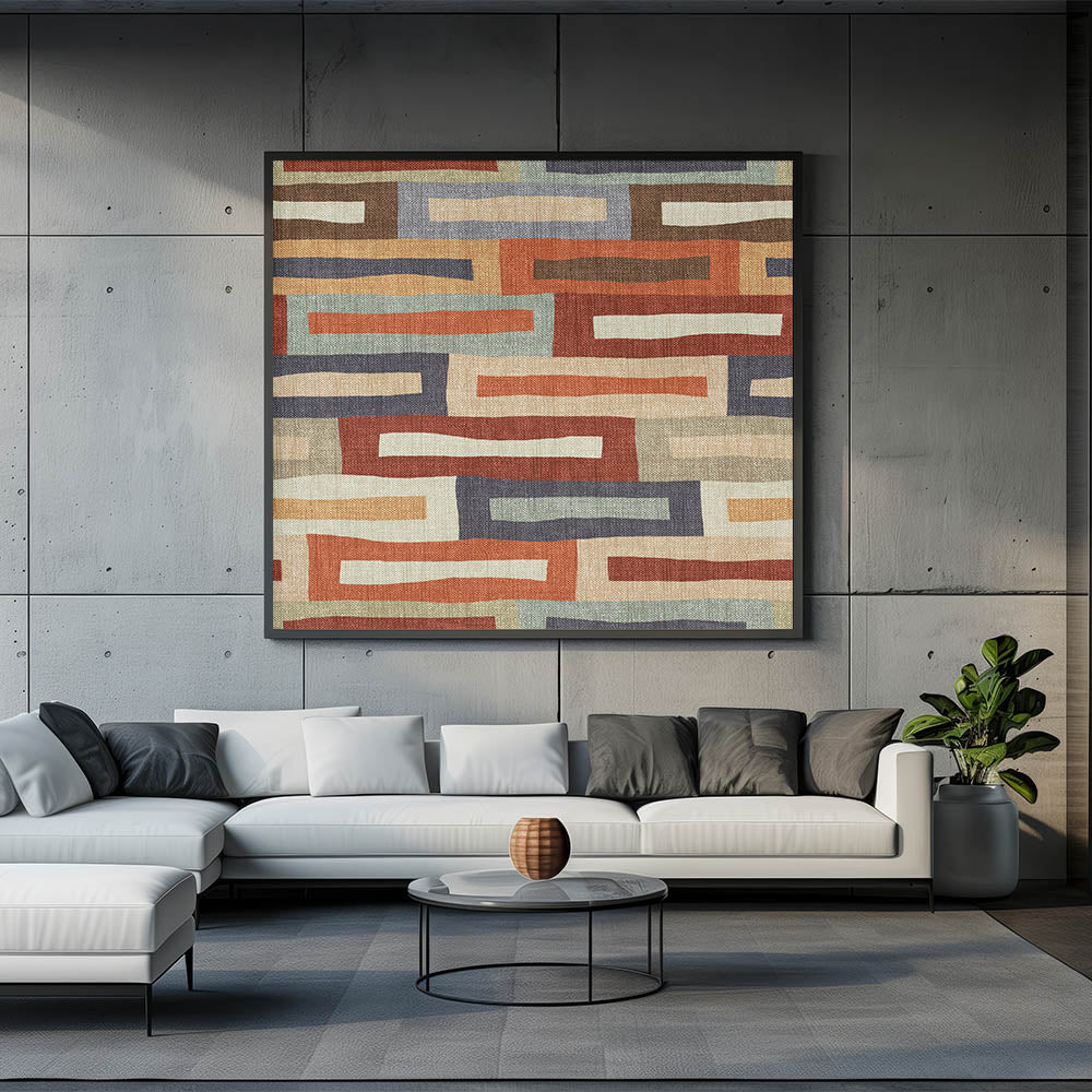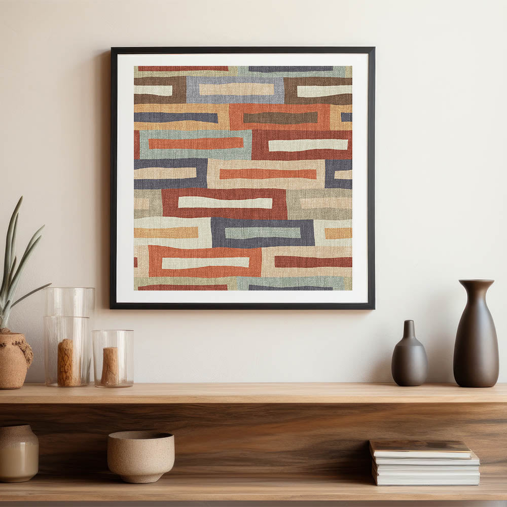 Add bold personality and warmth to your walls with our Framed Abstract Art for Sale. This design showcases layered rectangular forms in earthy tones—burnt orange, mustard, teal, navy, and beige—creating a rhythmic mid-century inspired layout. Ideal for eclectic, boho, or retro-modern interiors. Make a statement that never goes out of style.