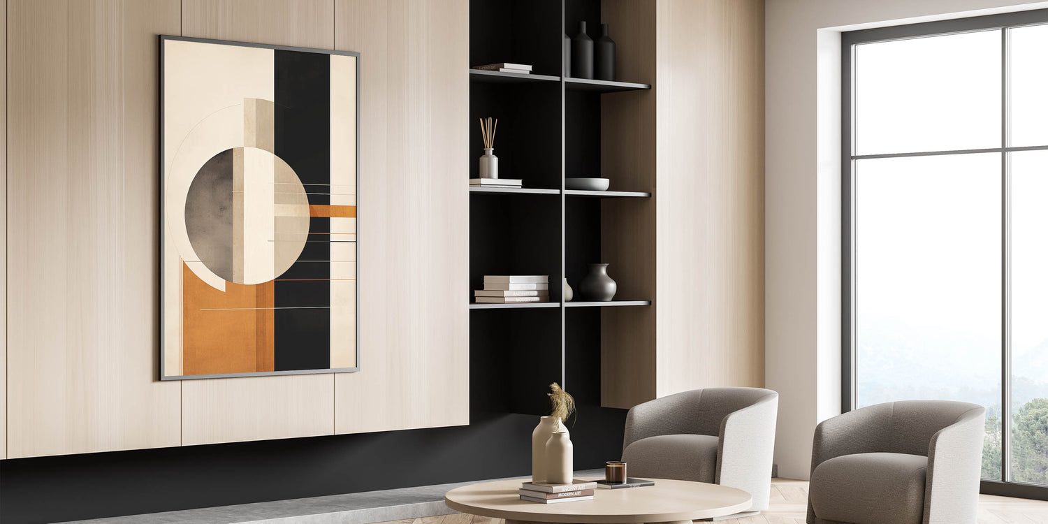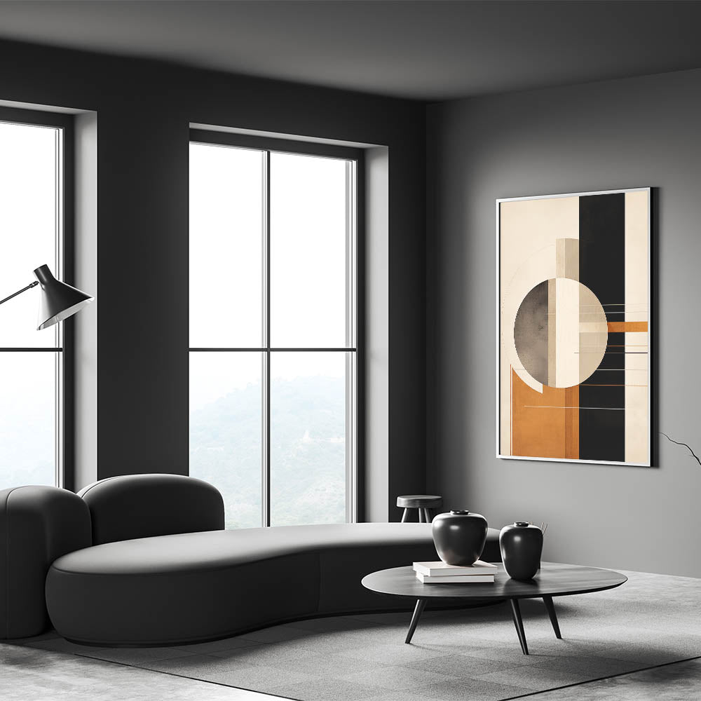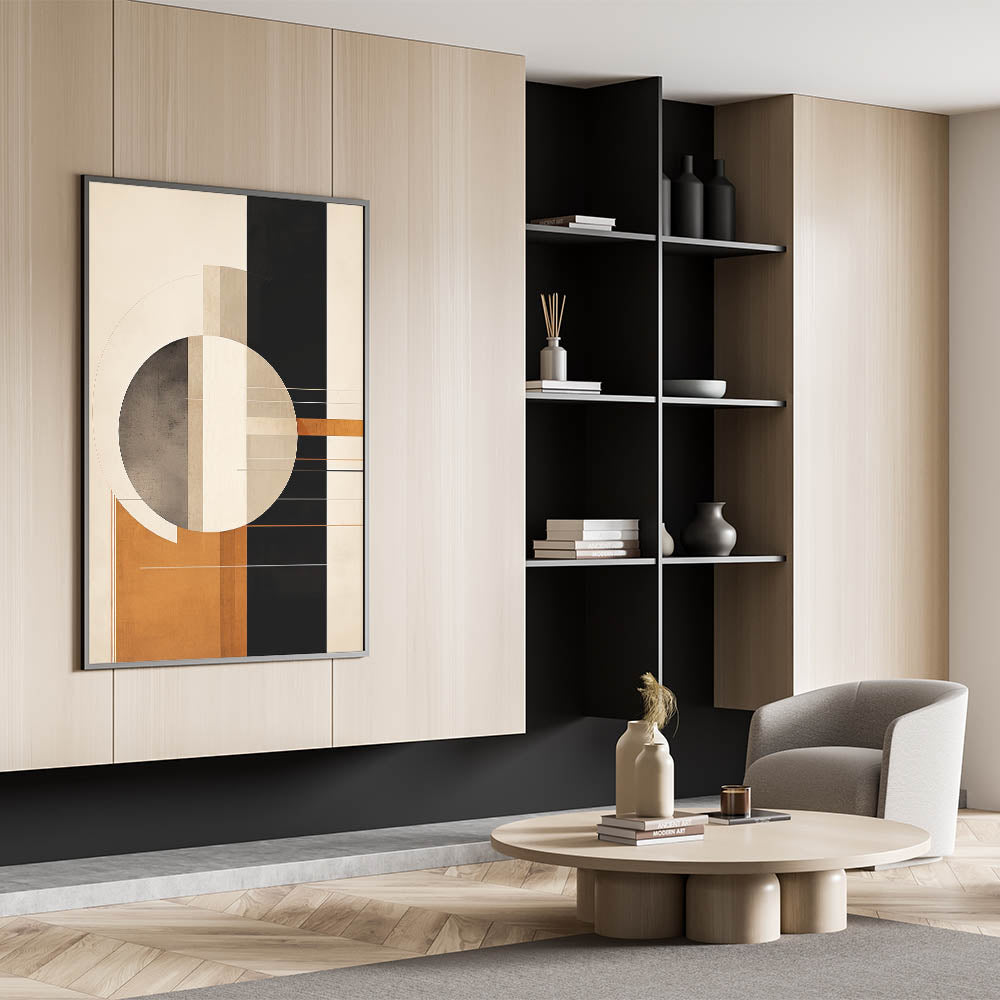 Enhance your space with this bold geometric abstract art featuring a balanced blend of black beige and warm orange tones. The design combines circles rectangles and linear accents creating a modern composition that adds depth and sophistication to any room. This minimalist piece is ideal for contemporary interiors bringing warmth and structure with its harmonious color palette and clean lines.