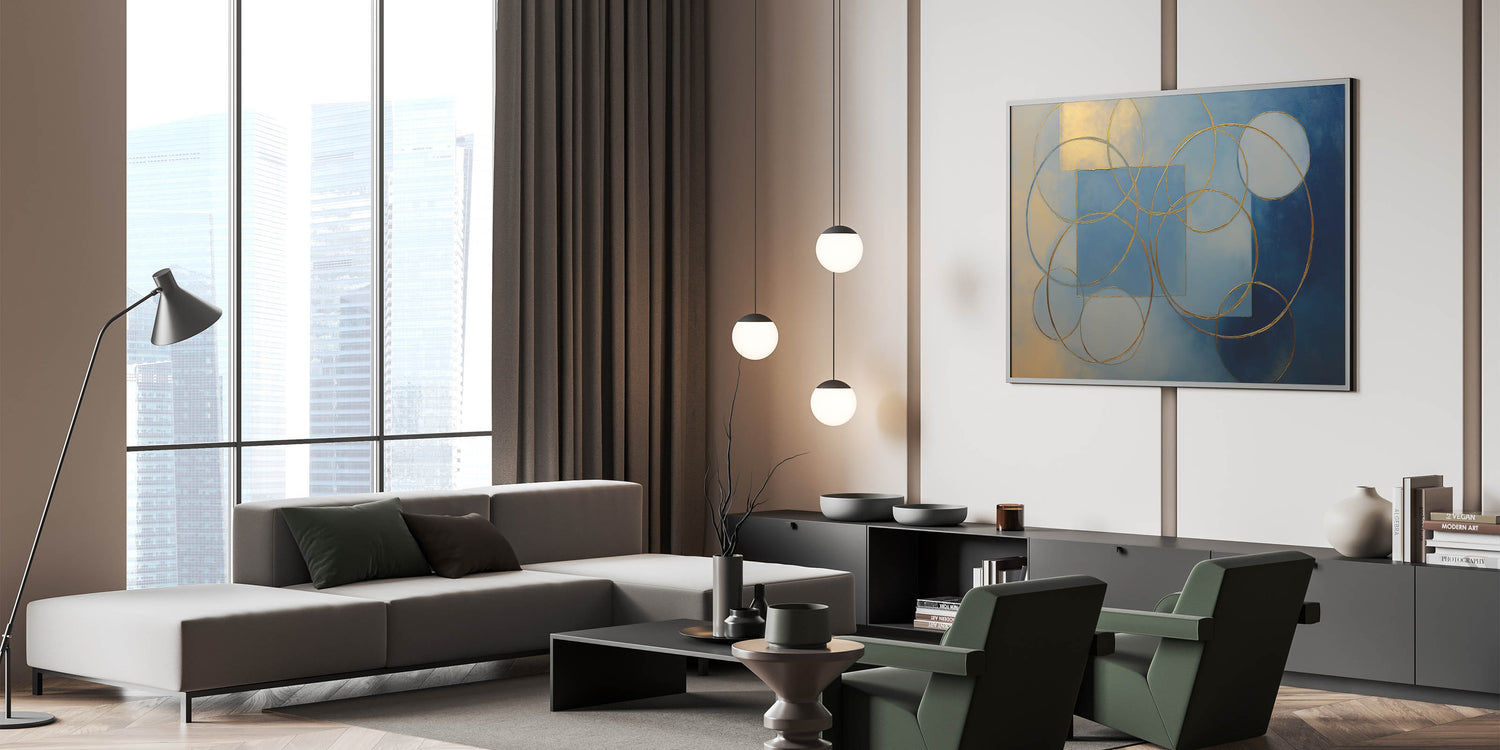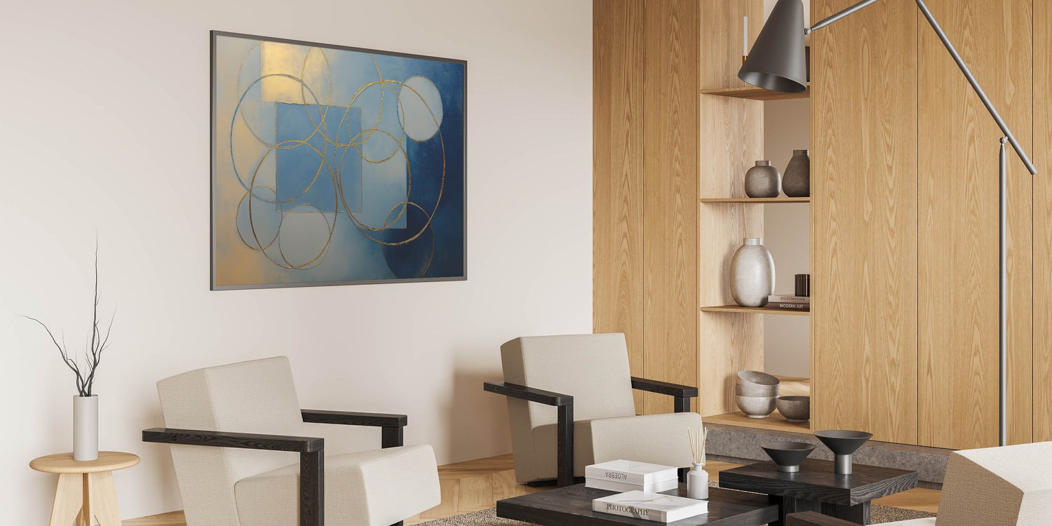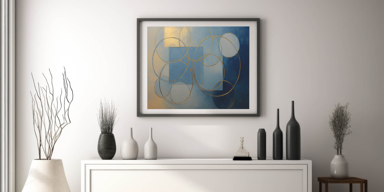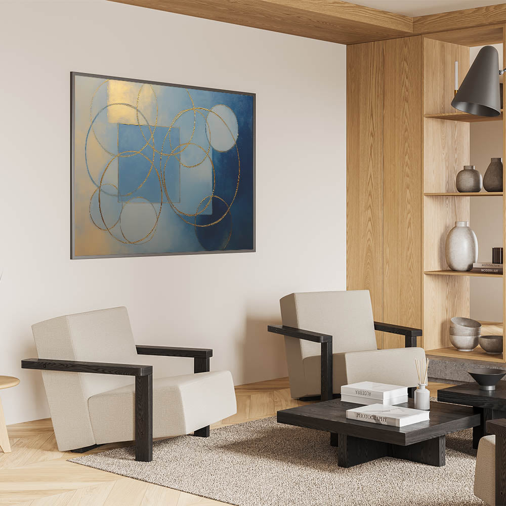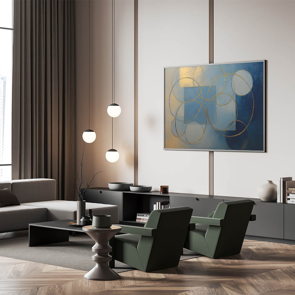 This abstract art for living rooms highlights the beauty of geometric simplicity and vibrant contrasts. Its luxurious gold detailing and rich blue hues make it an excellent choice for art lovers seeking a modern, sophisticated touch for their interiors.