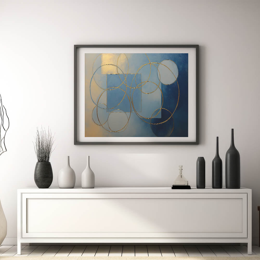 Enhance your decor with this elegant Geometric Abstract Wall Art, featuring a sophisticated interplay of gold-outlined circles and squares on a rich blue and soft beige background. This modern design merges clean lines with dynamic shapes, creating a bold yet calming focal point.