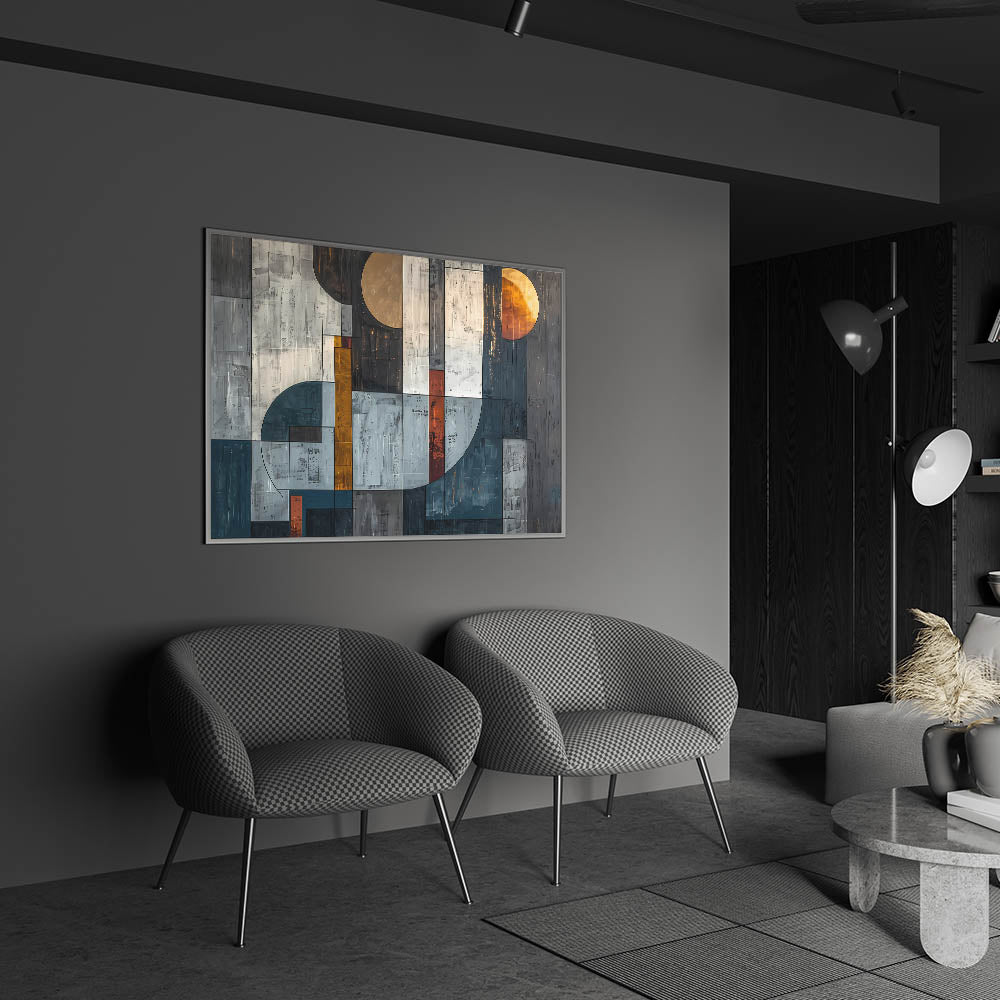 This geometric abstract piece is perfect for those who appreciate modern design and bold color contrasts. The combination of deep navy, muted gray, and vibrant orange creates an eye-catching visual experience, adding a touch of contemporary elegance to any room.
