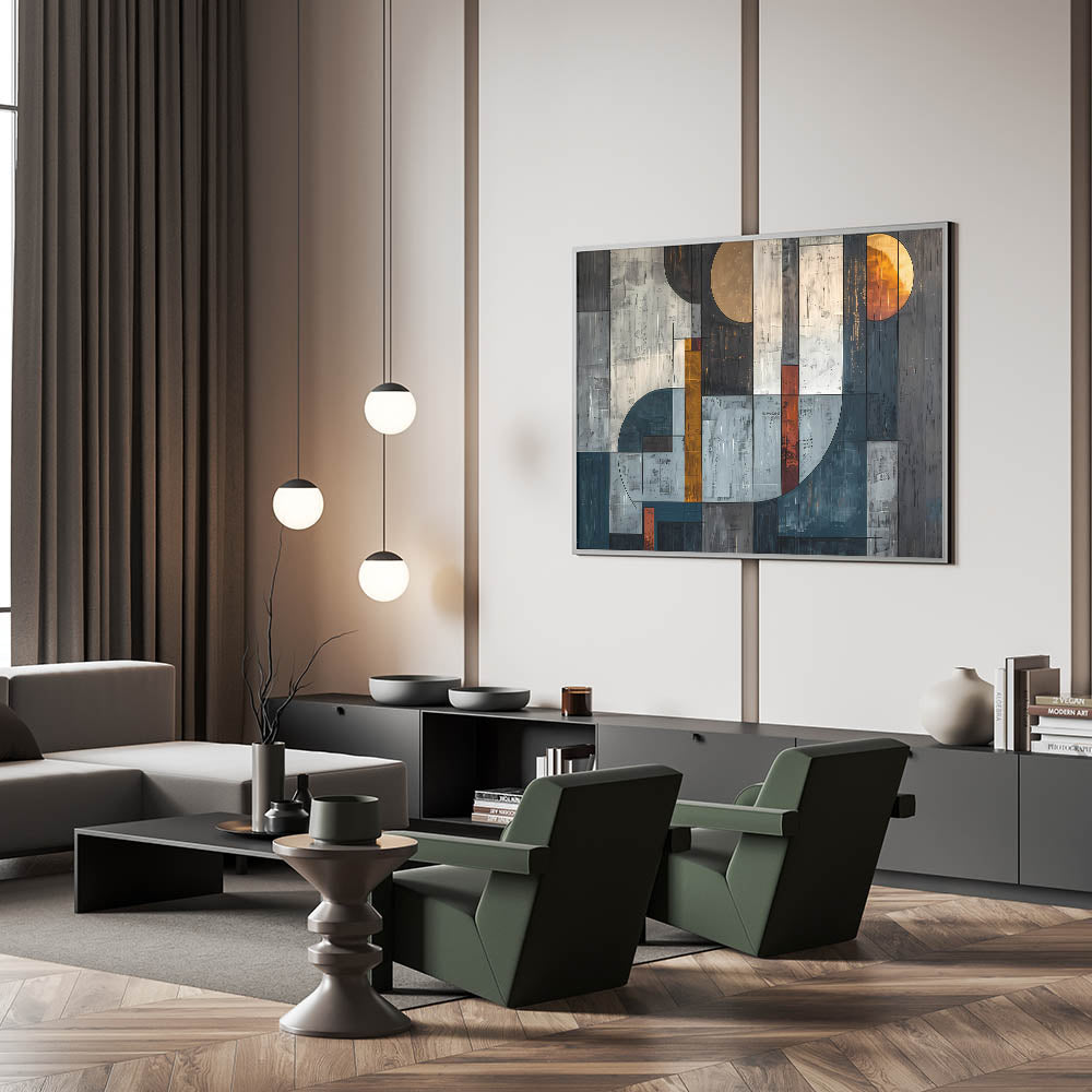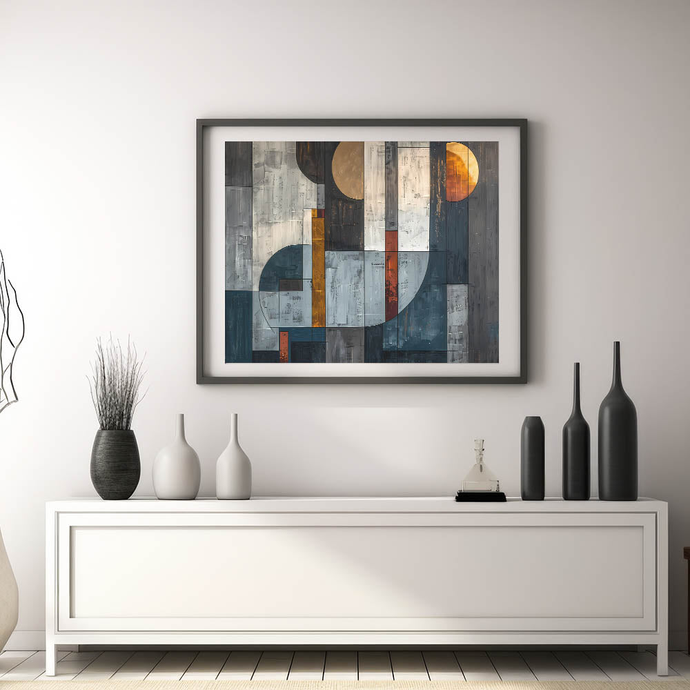 Elevate your décor with this stunning geometric abstract artwork, showcasing a dynamic blend of navy, gray, and beige tones with bold accents of burnt orange. The intricate composition features an array of rectangles, curved lines, and circular shapes, creating a harmonious balance between structure and fluidity. The rich color palette and layered textures bring depth and sophistication, making it a captivating focal point for any contemporary space.
