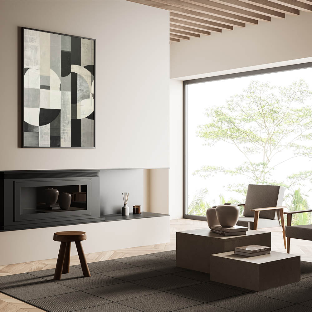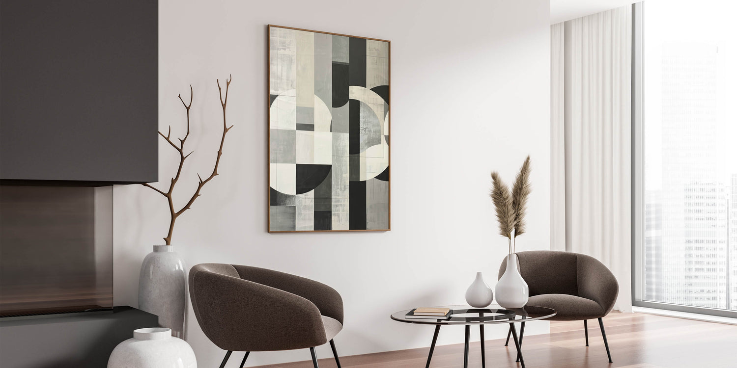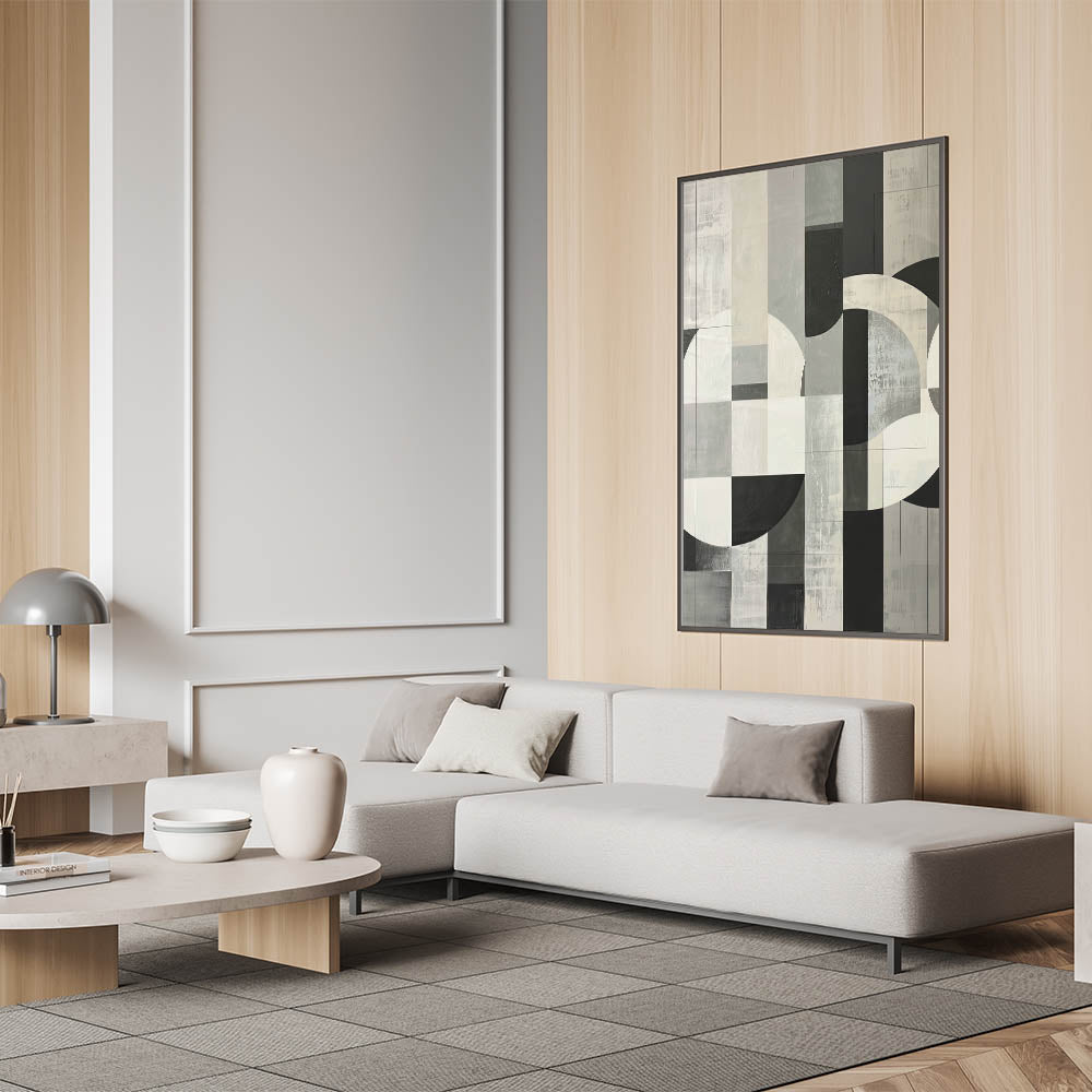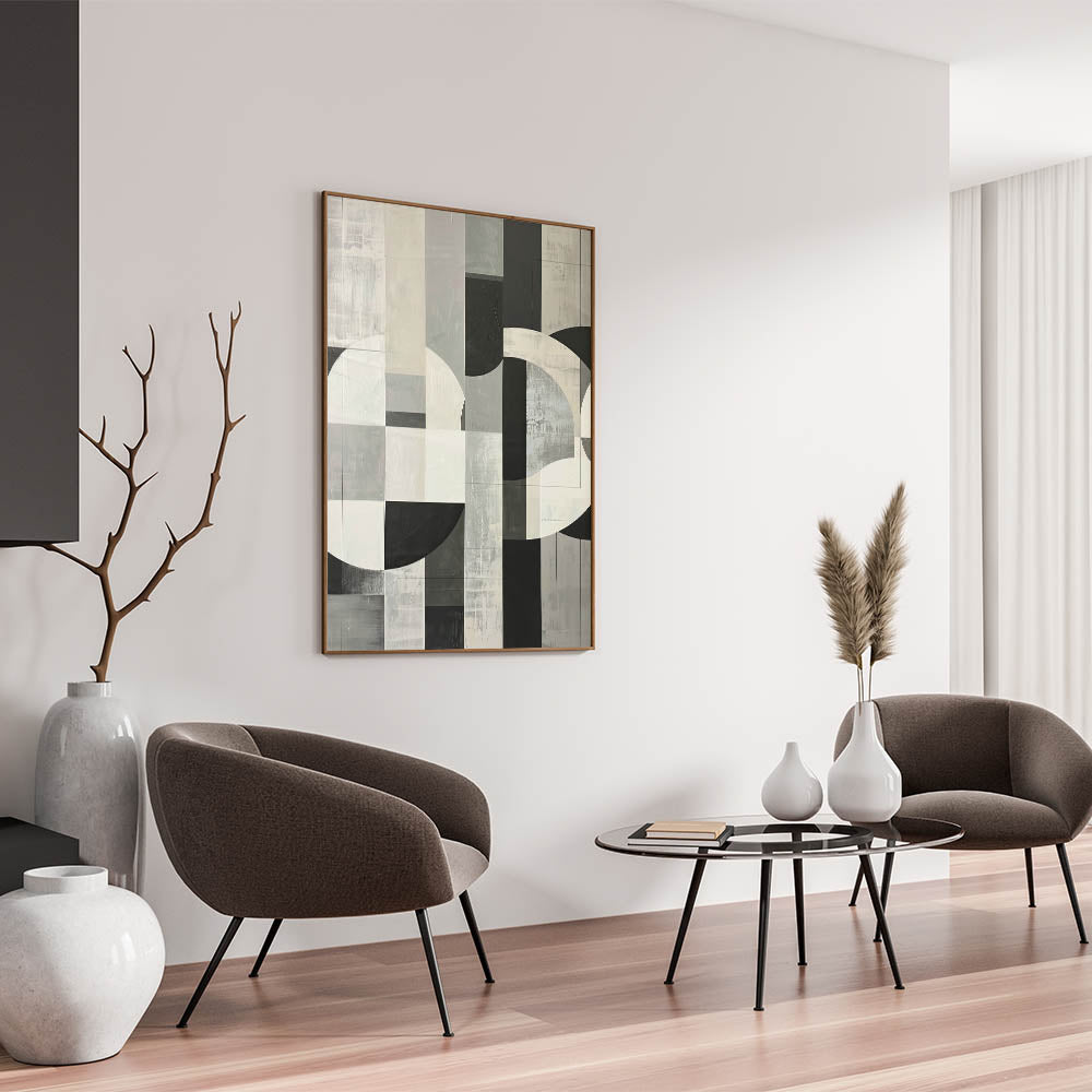 Enhance your decor with this minimalist geometric art print, featuring a sophisticated arrangement of black, white, and gray tones. The intersecting shapes and textured finish add depth and structure, making this piece an ideal focal point for modern and minimalist interiors. This artwork’s monochromatic palette and layered patterns create a balanced, timeless appeal that effortlessly complements any space.