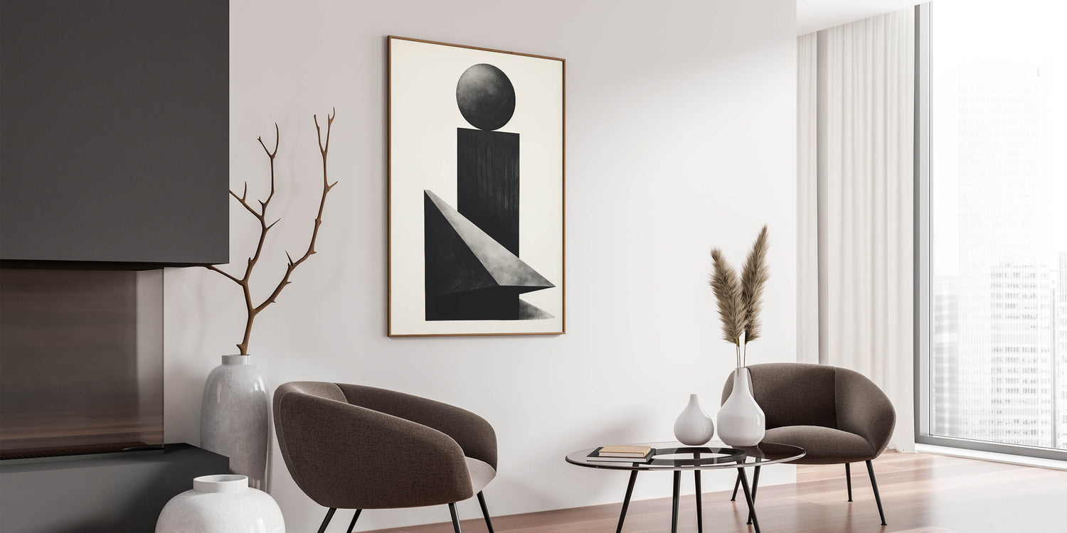 Introduce a bold, modern touch to your decor with this geometric minimalist wall art. Featuring clean shapes—a sphere, rectangle, and triangle—in a striking black and white palette, this artwork captures the essence of minimalism with its balanced composition. Perfect for contemporary interiors, this piece brings a touch of sophistication and structure, making it ideal for those who appreciate the beauty of simple forms and high contrast.
