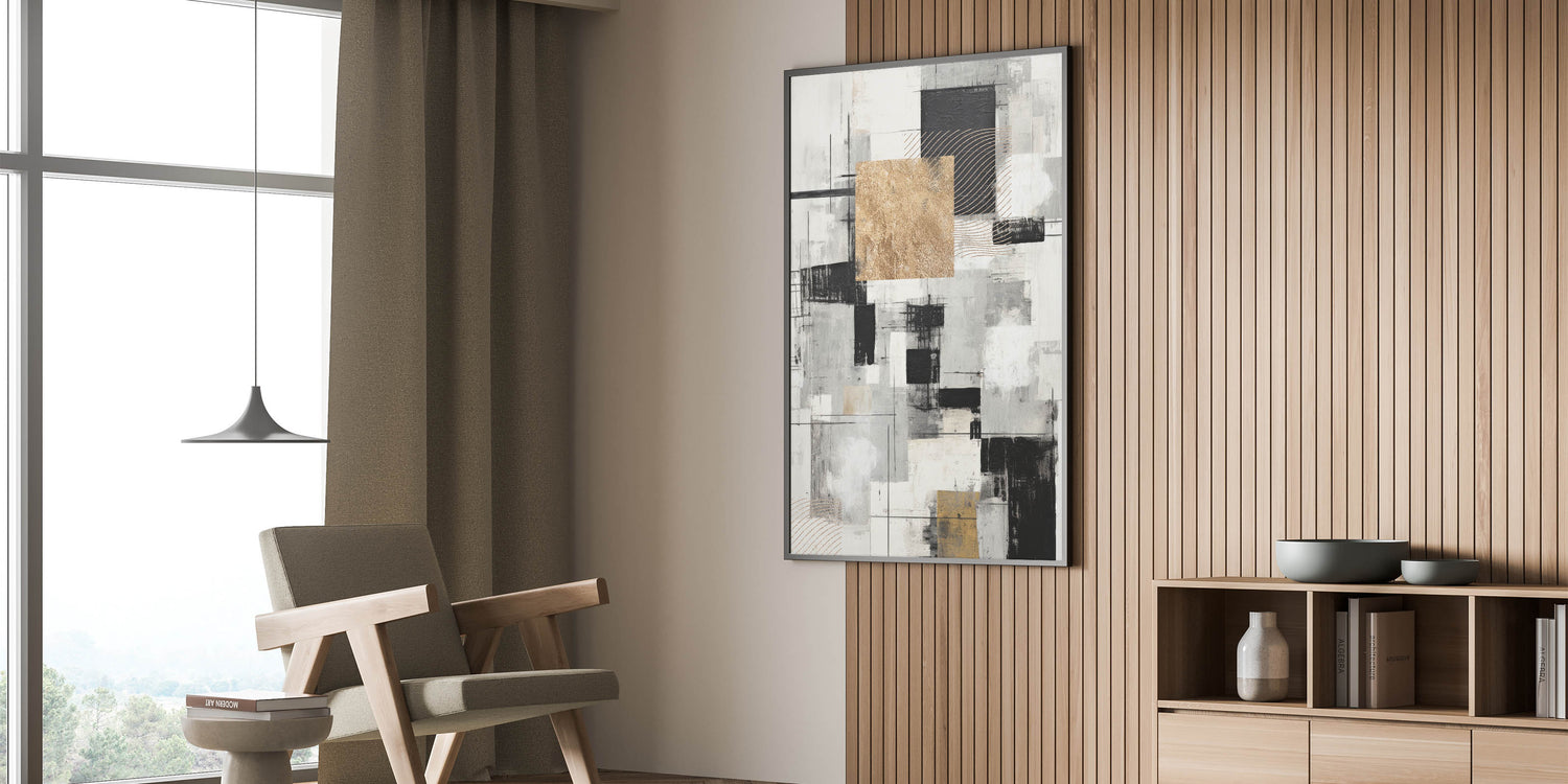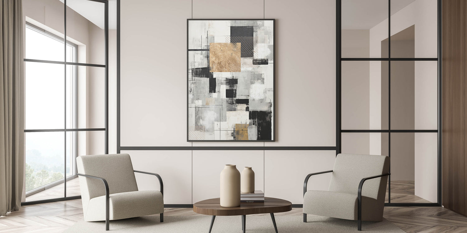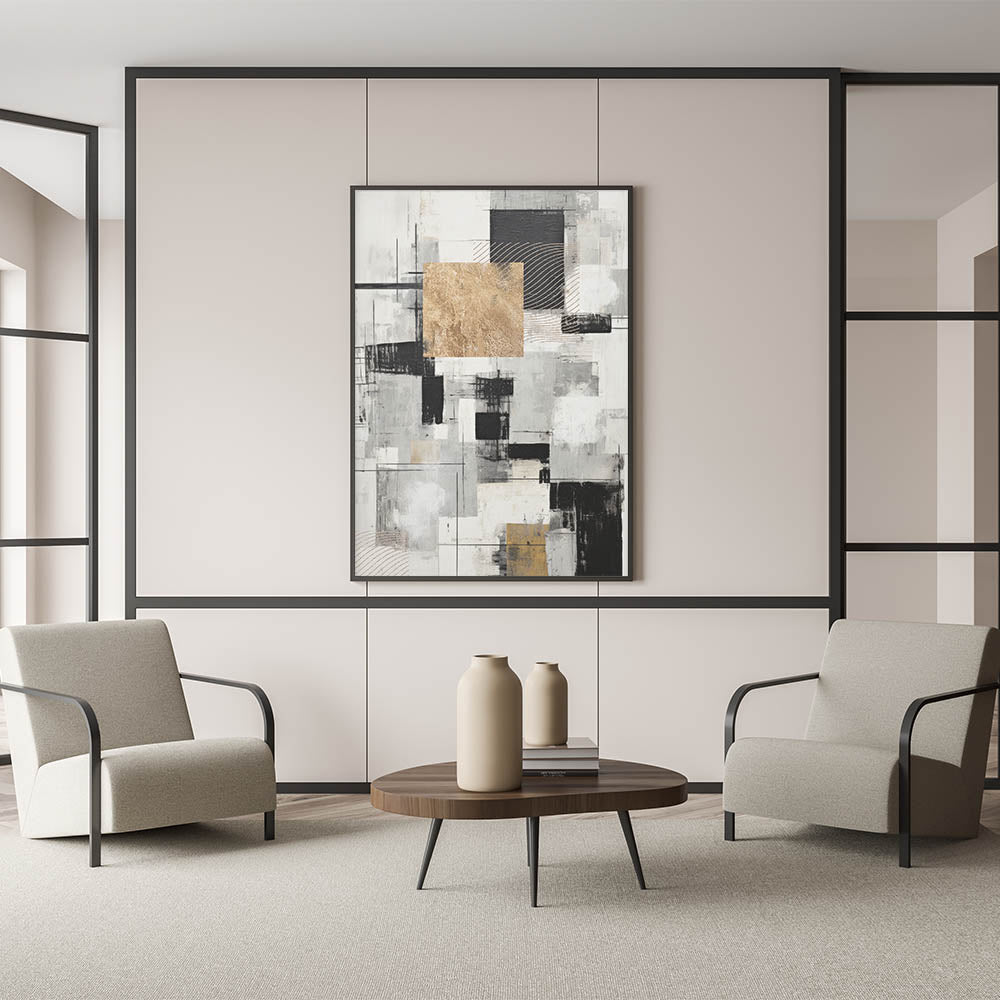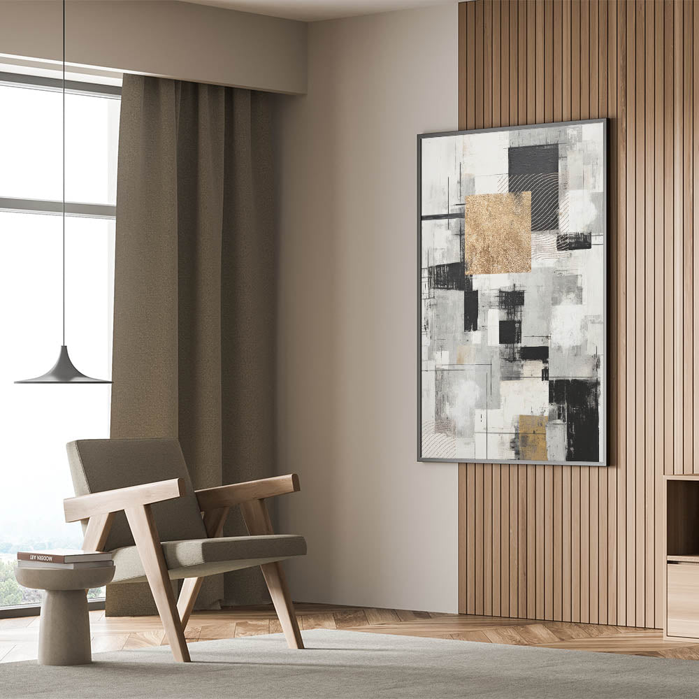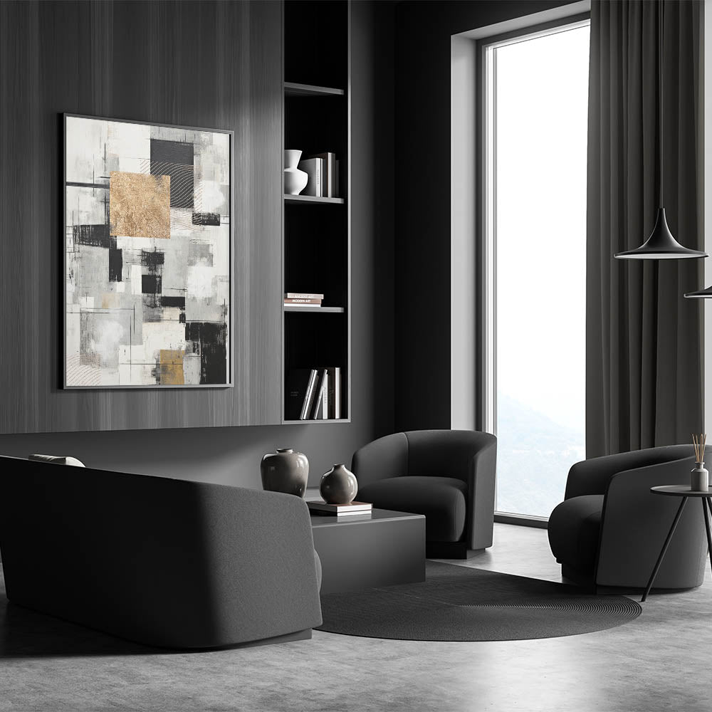 Transform your space with this geometric modern abstract wall art, featuring a sophisticated blend of black, gold, and gray tones. The composition is a dynamic interplay of squares, lines, and textured elements that create a striking visual contrast. The use of gold accents adds a touch of luxury, while the monochrome palette ensures versatility, making it suitable for various interior styles.
