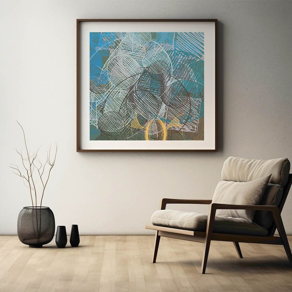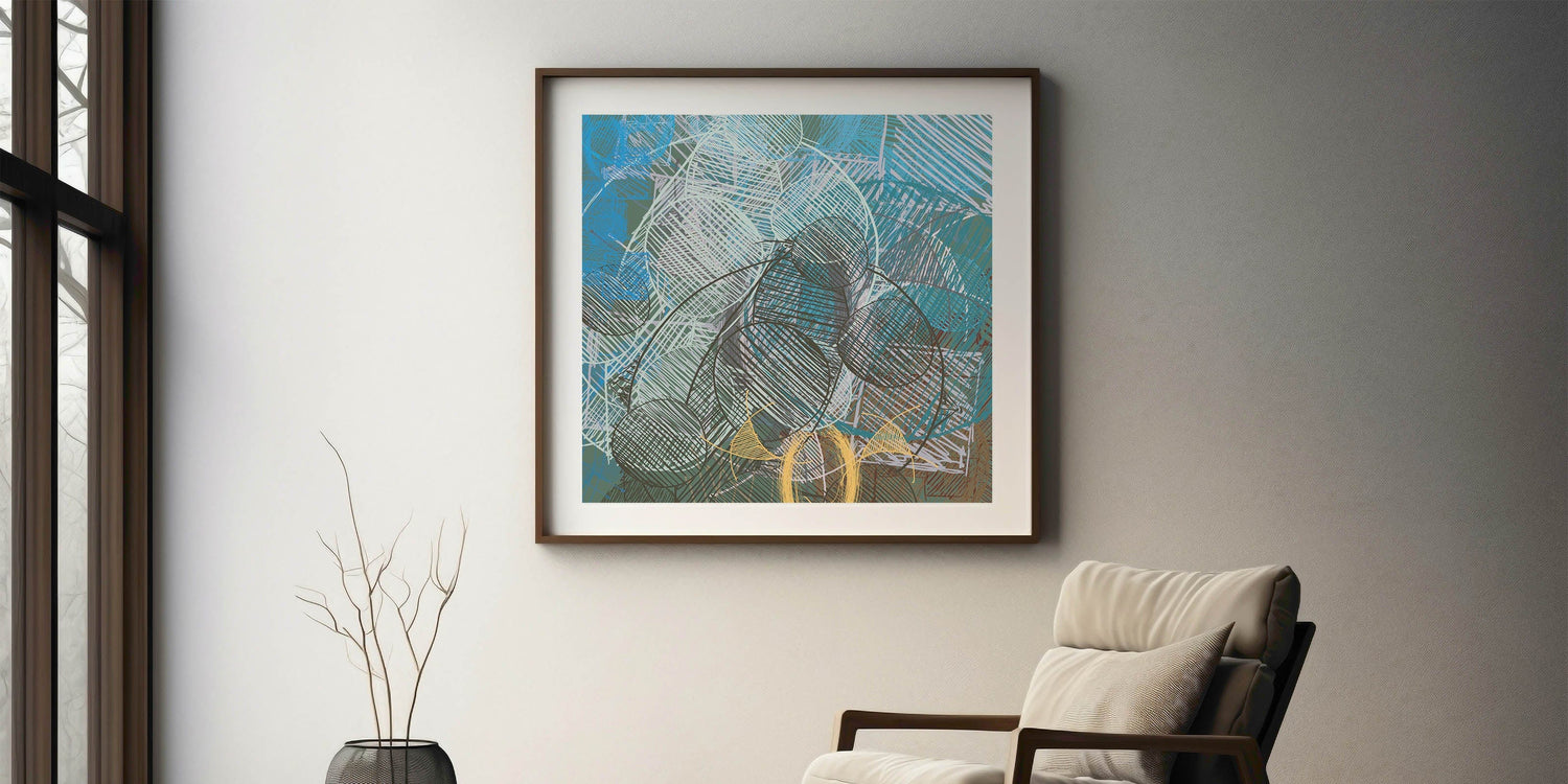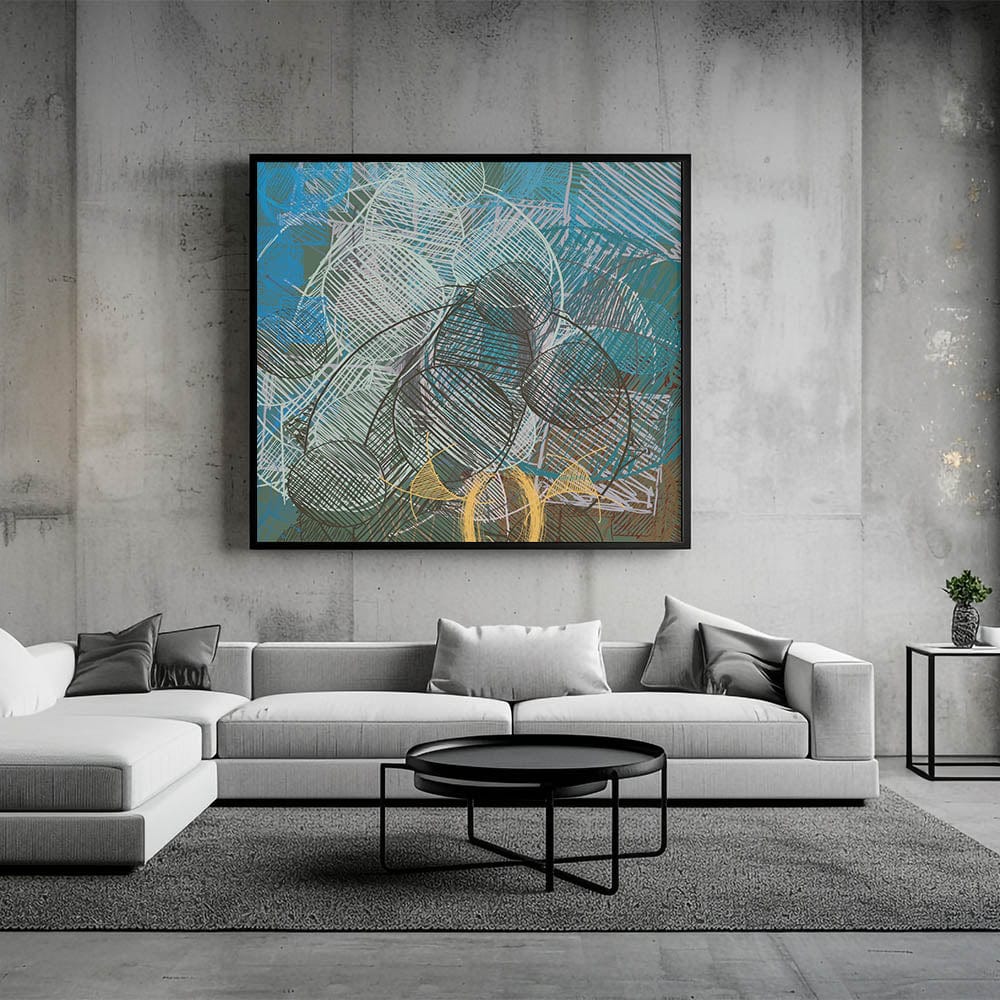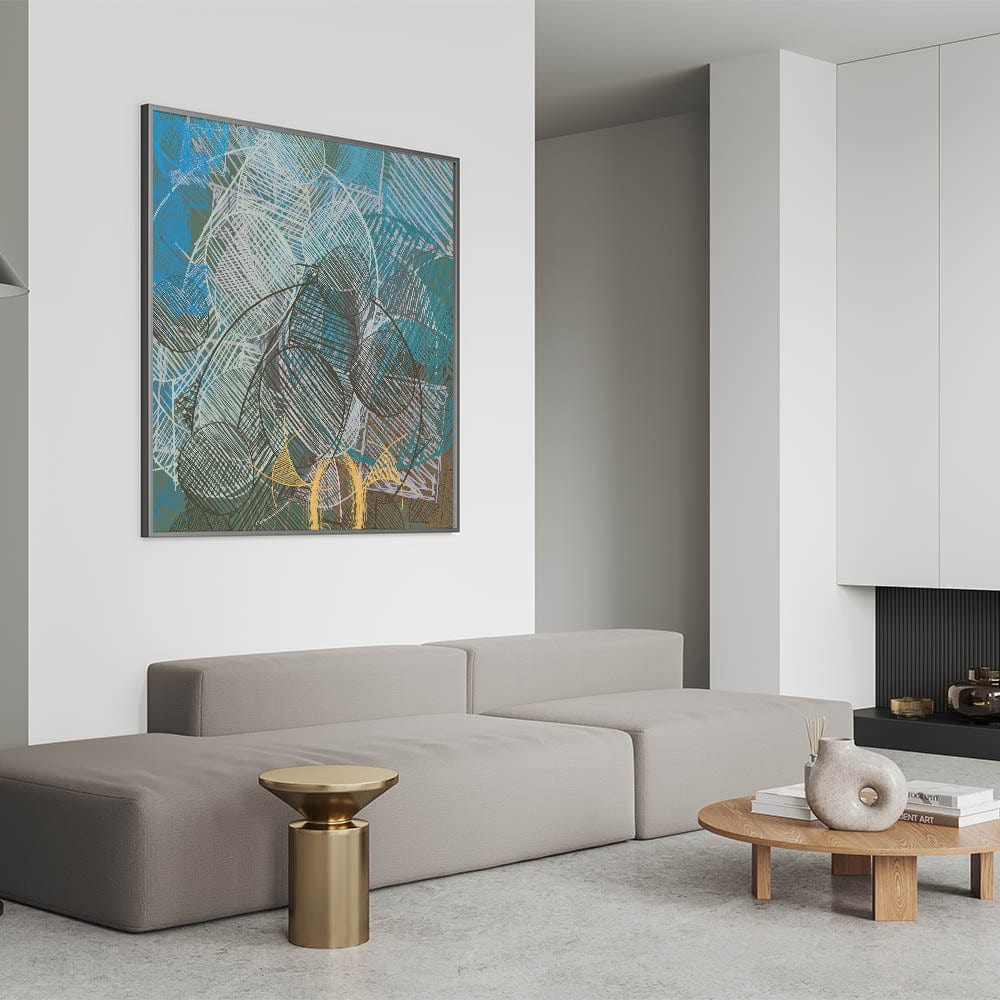 Elevate your space with this moody modern wall art, a dynamic fusion of deep blues, greens, and gold accents. This abstract wall art blends geometric precision with artistic fluidity, creating an intriguing balance between structure and motion. The layered patterns add depth, making it an eye-catching focal point for any room.