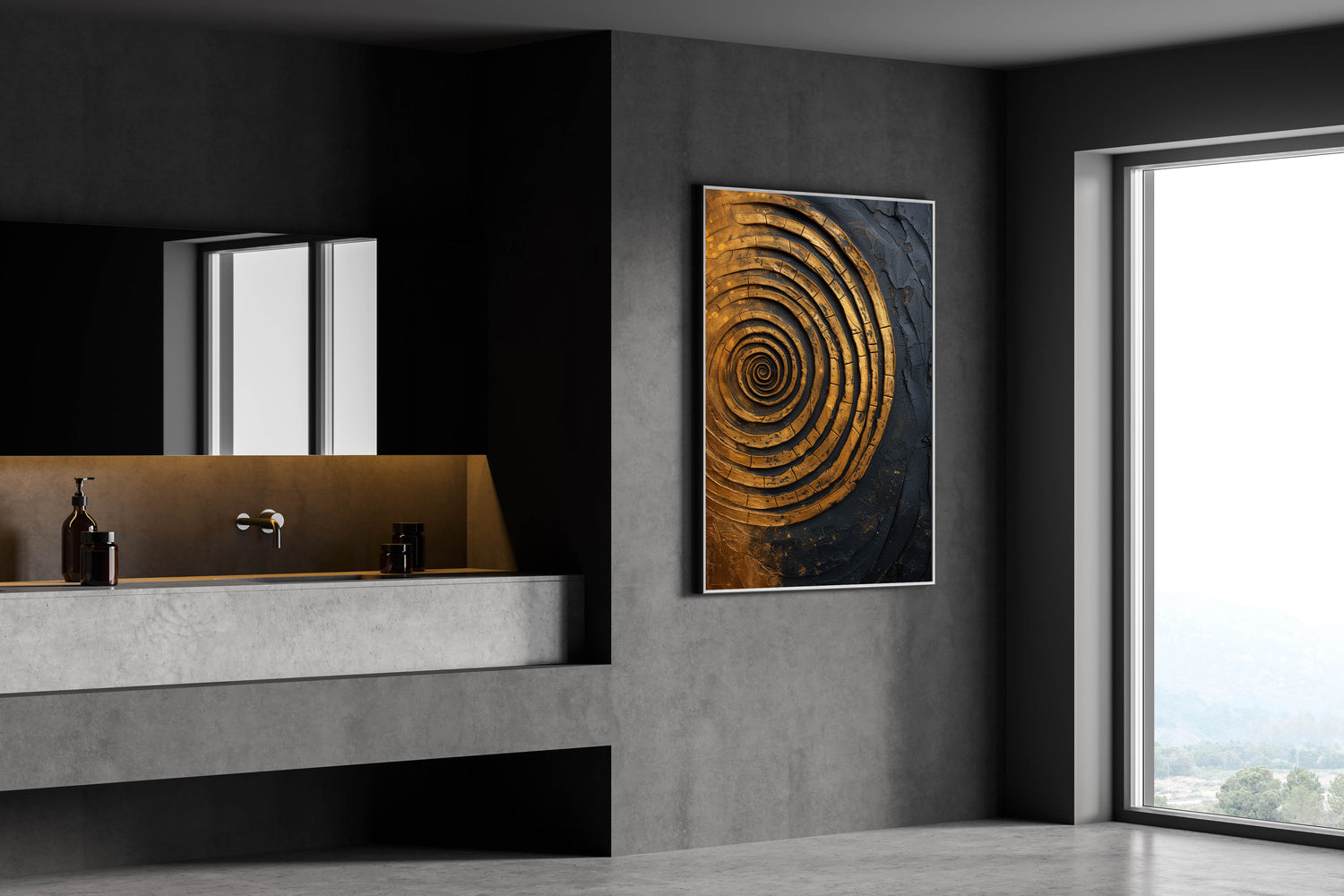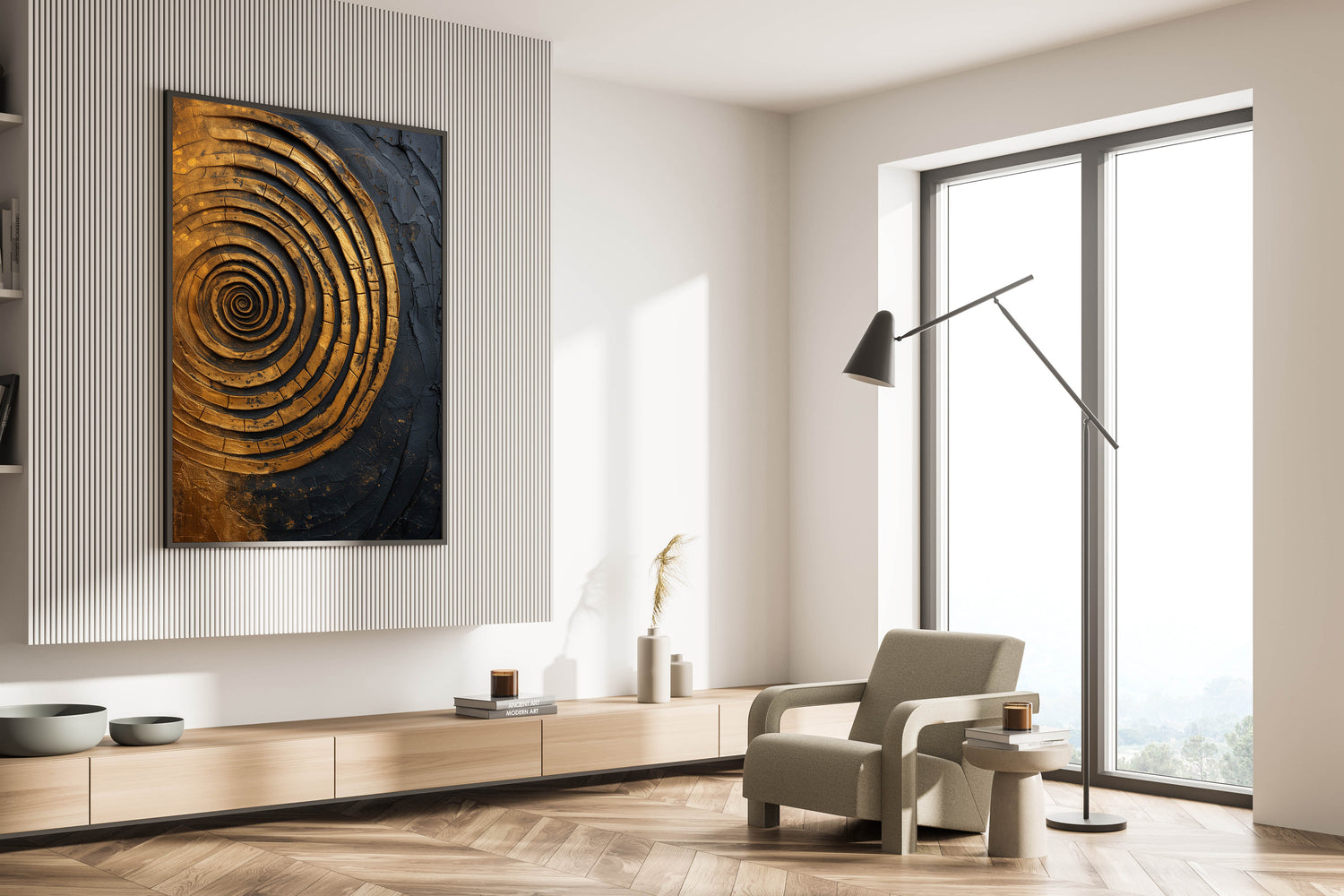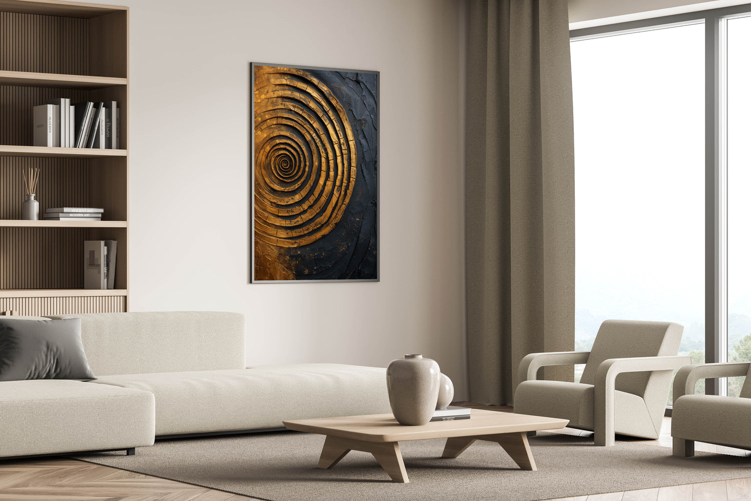 Transform your space with this striking abstract line art featuring a captivating spiral design. The dynamic strokes of metallic gold create a mesmerizing pattern against a deep black backdrop, blending contemporary style with artistic elegance. This wall art piece offers a bold and sophisticated aesthetic, perfect for adding depth and character to any room.