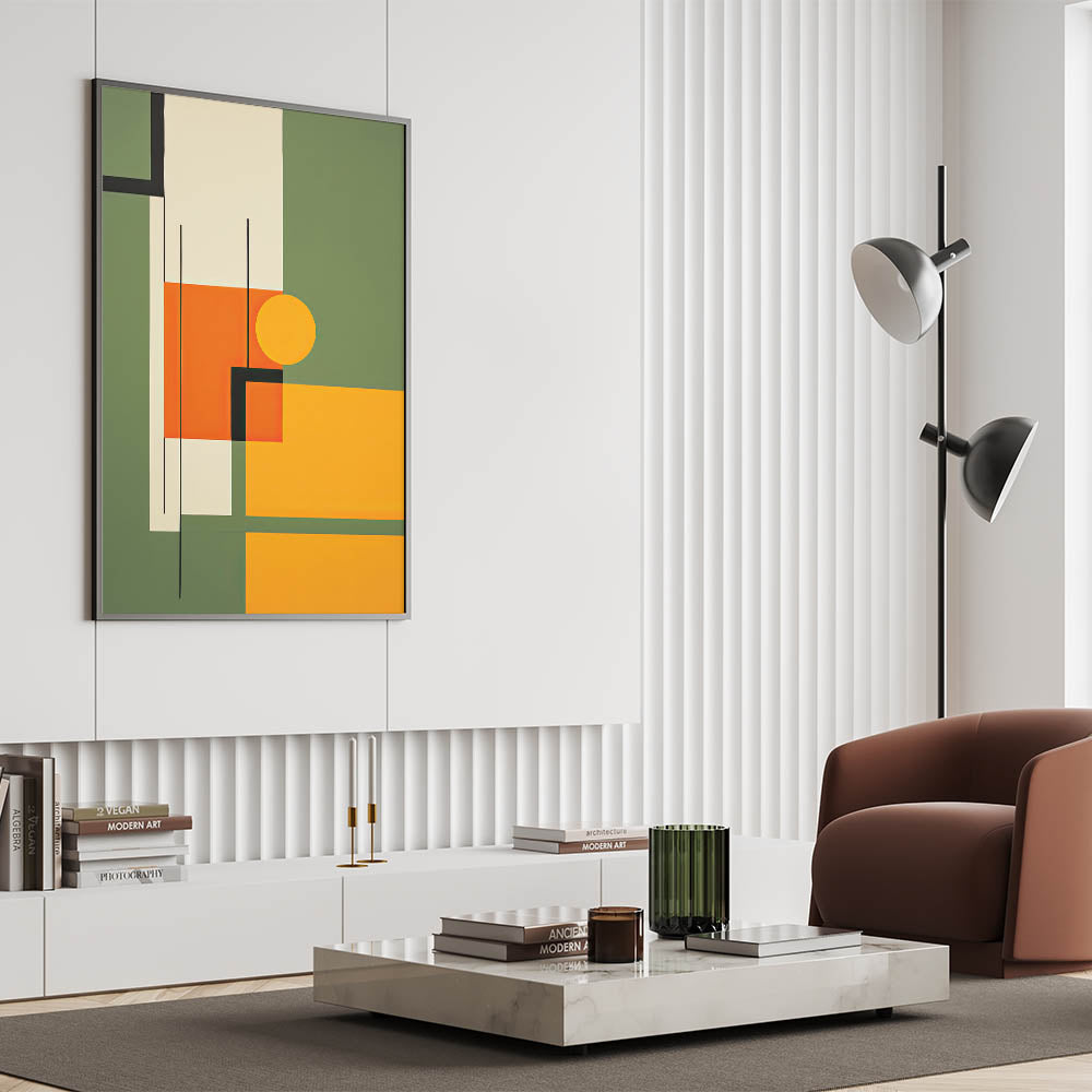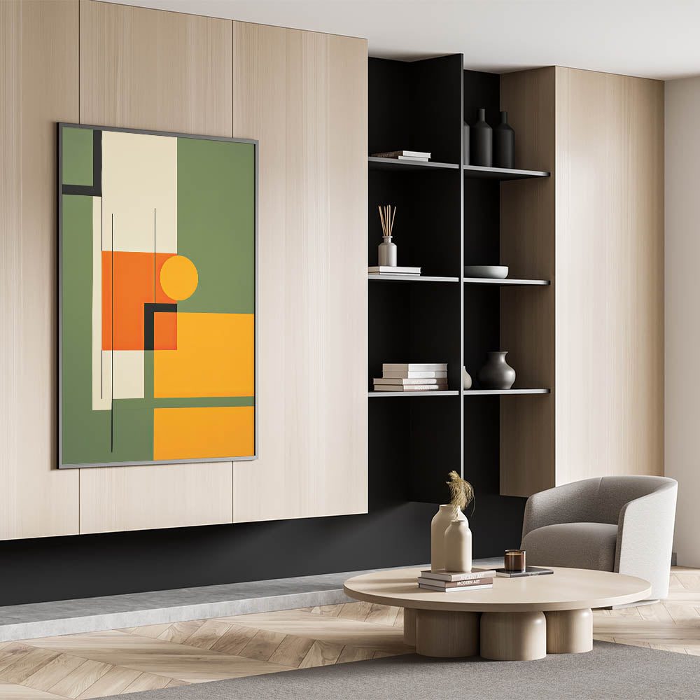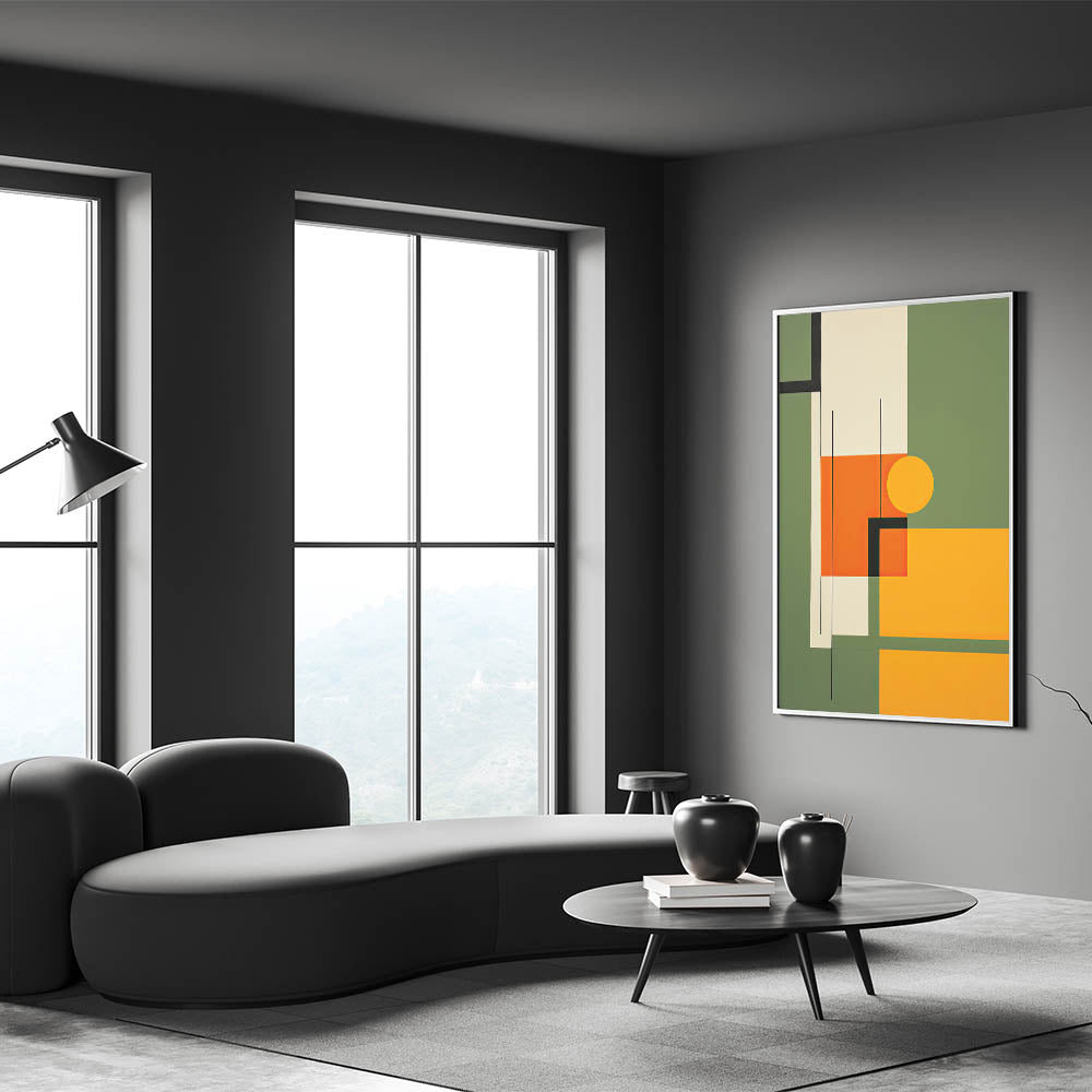 Brighten your space with this minimalist geometric art print, featuring bold shapes in green, orange, and yellow. The design incorporates a striking arrangement of squares, rectangles, and circles with clean lines, creating a visually balanced and modern composition. This artwork brings energy and structure to any room, making it a perfect fit for contemporary and minimalist interiors.