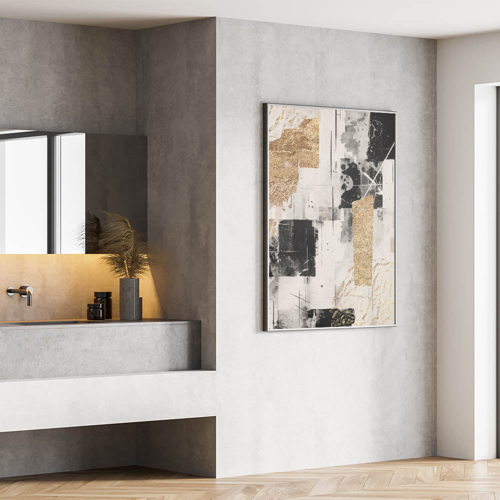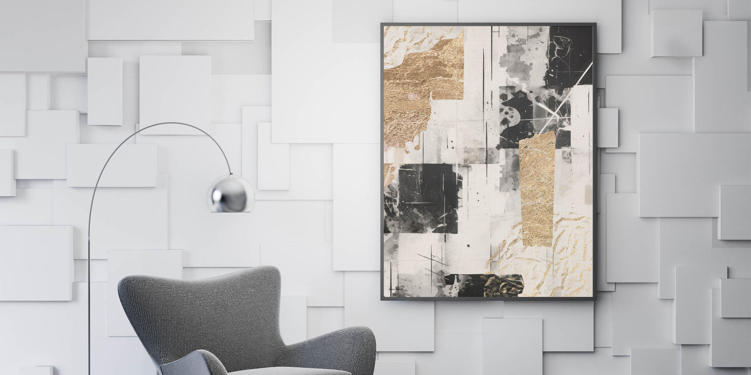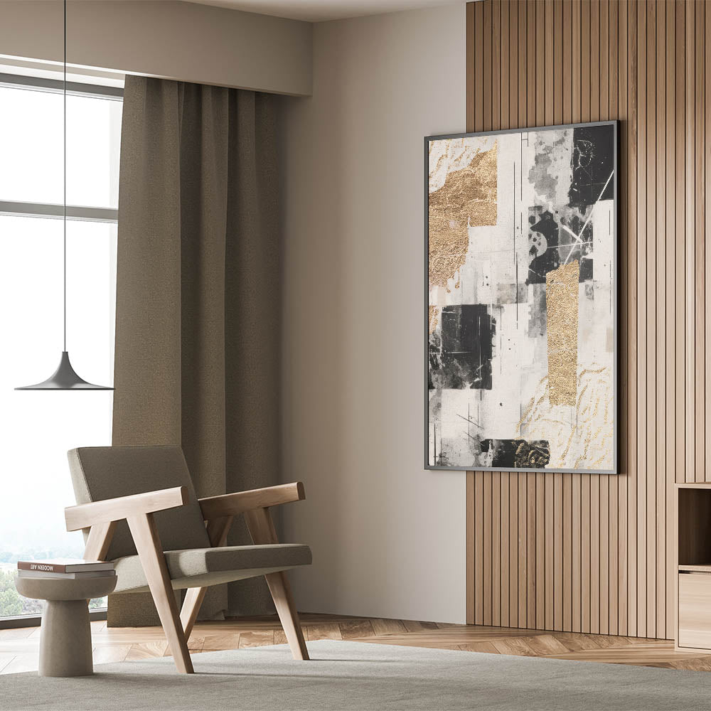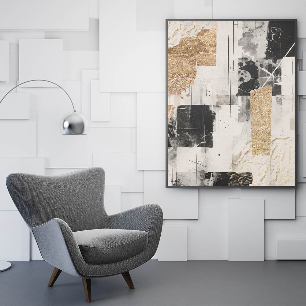 Elevate your space with this luxurious abstract wall art, featuring a sophisticated blend of black, white, and gold textures. The dynamic composition of bold geometric shapes and intricate gold accents creates a striking visual contrast, making this piece a perfect statement for any modern or contemporary interior. The rich texture adds depth and dimension, ensuring that this artwork captures attention and adds a touch of elegance to your decor.