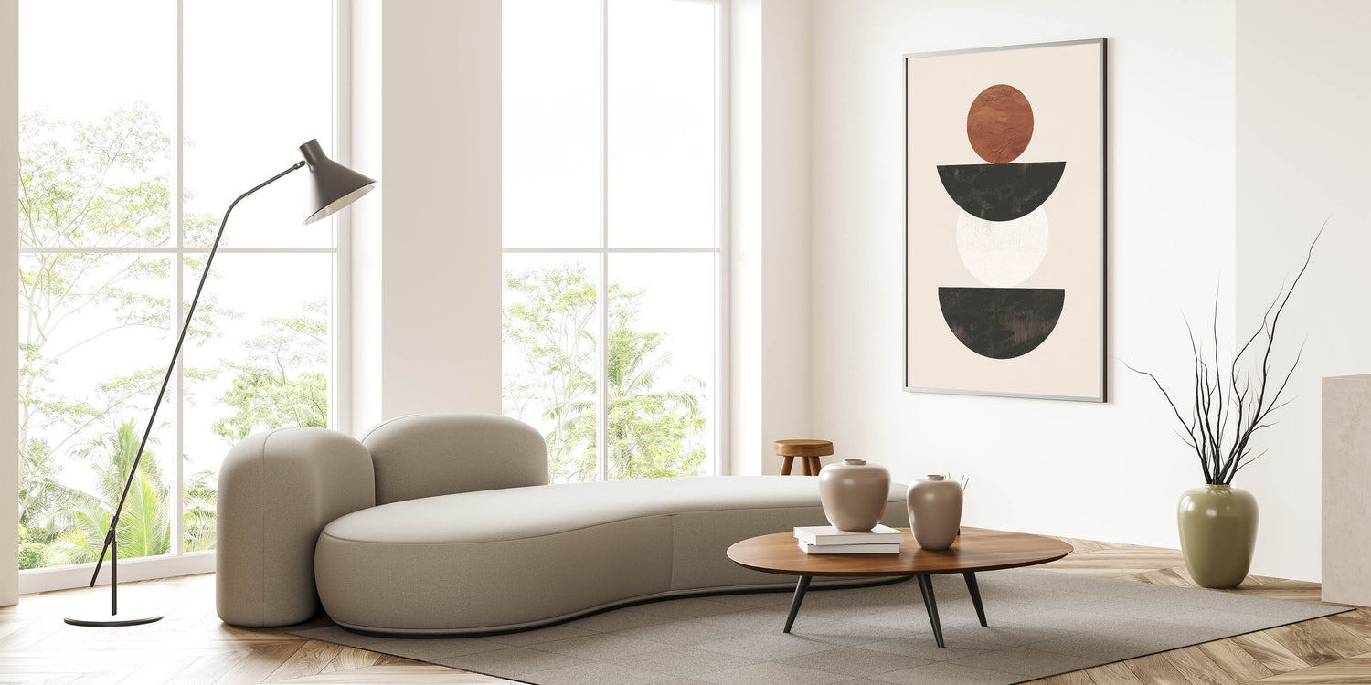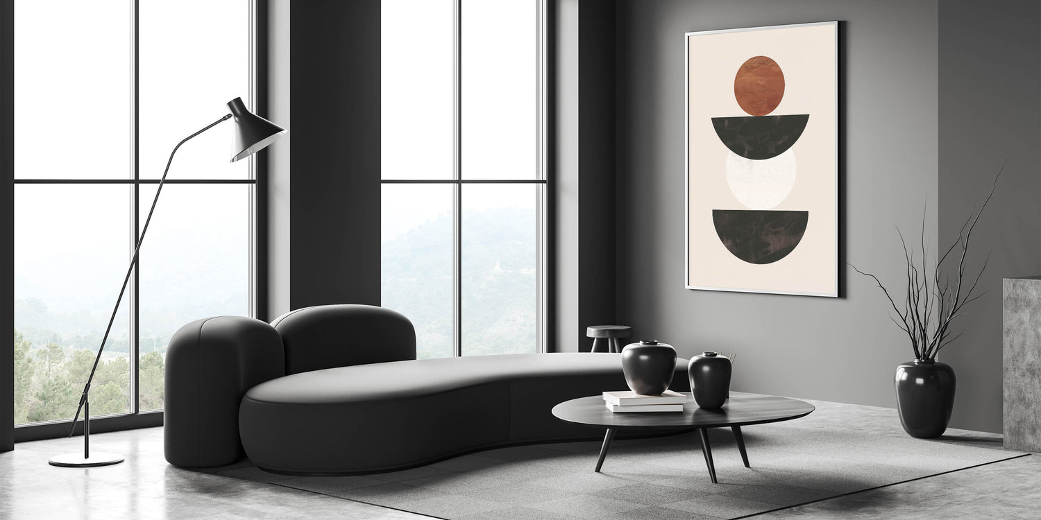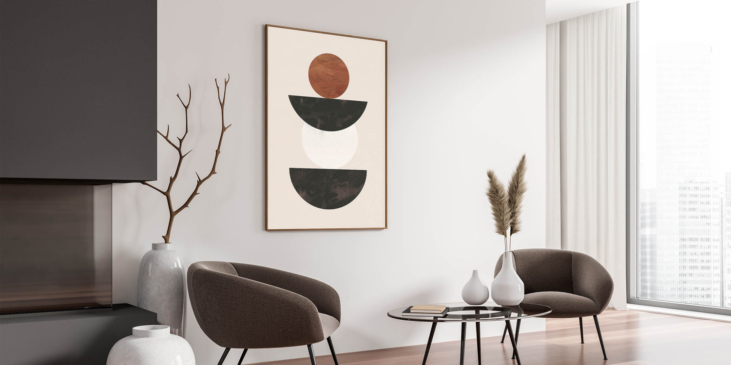 Introduce a sense of modern elegance to your space with this stunning minimalist geometric wall art. Featuring a balanced composition of black, white, and brown shapes, this piece embodies the essence of minimalist abstract art. The contrast between the earthy brown circle and the sleek black and white semicircles creates a visually striking yet simple design that complements any modern interior.