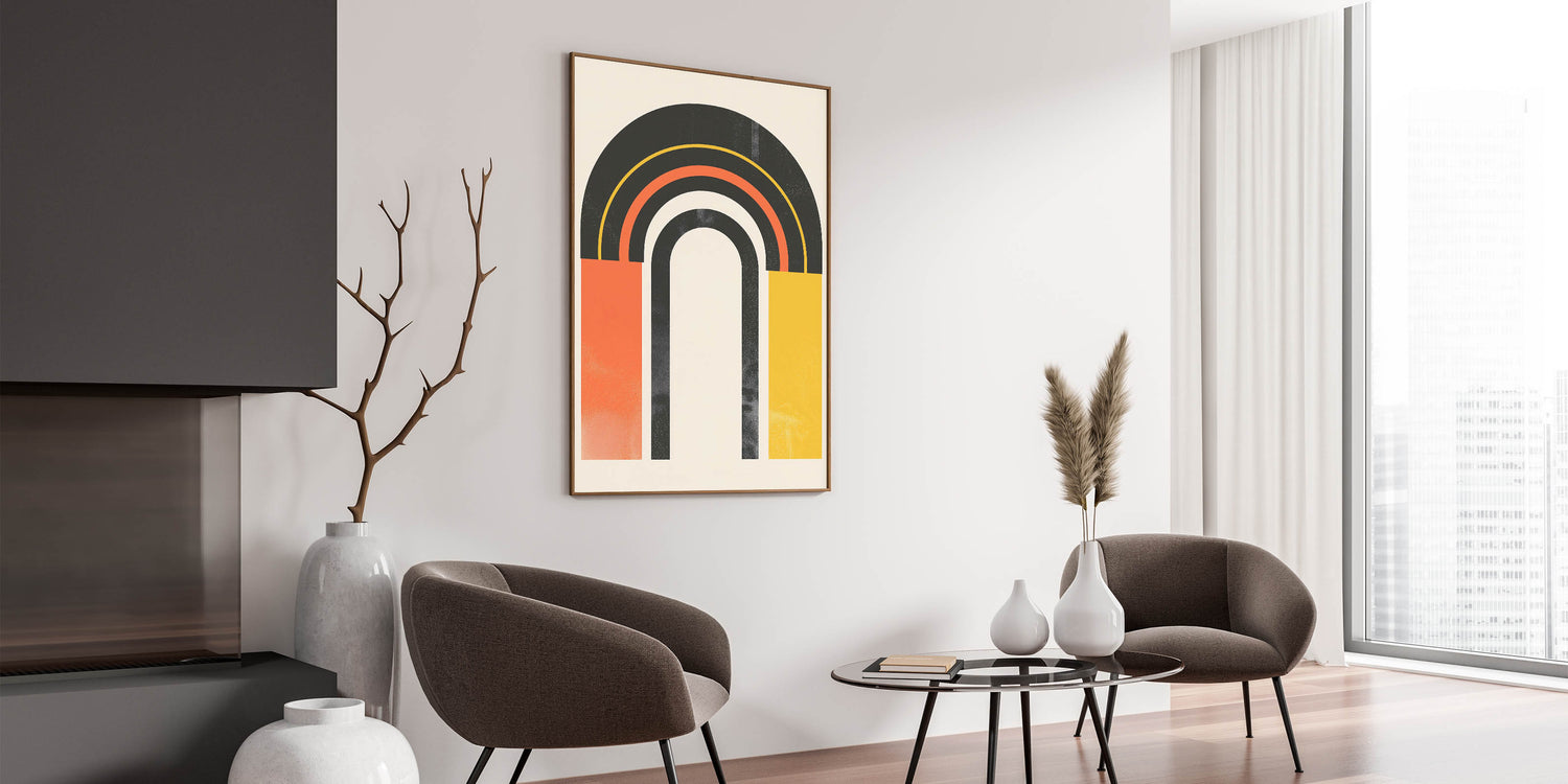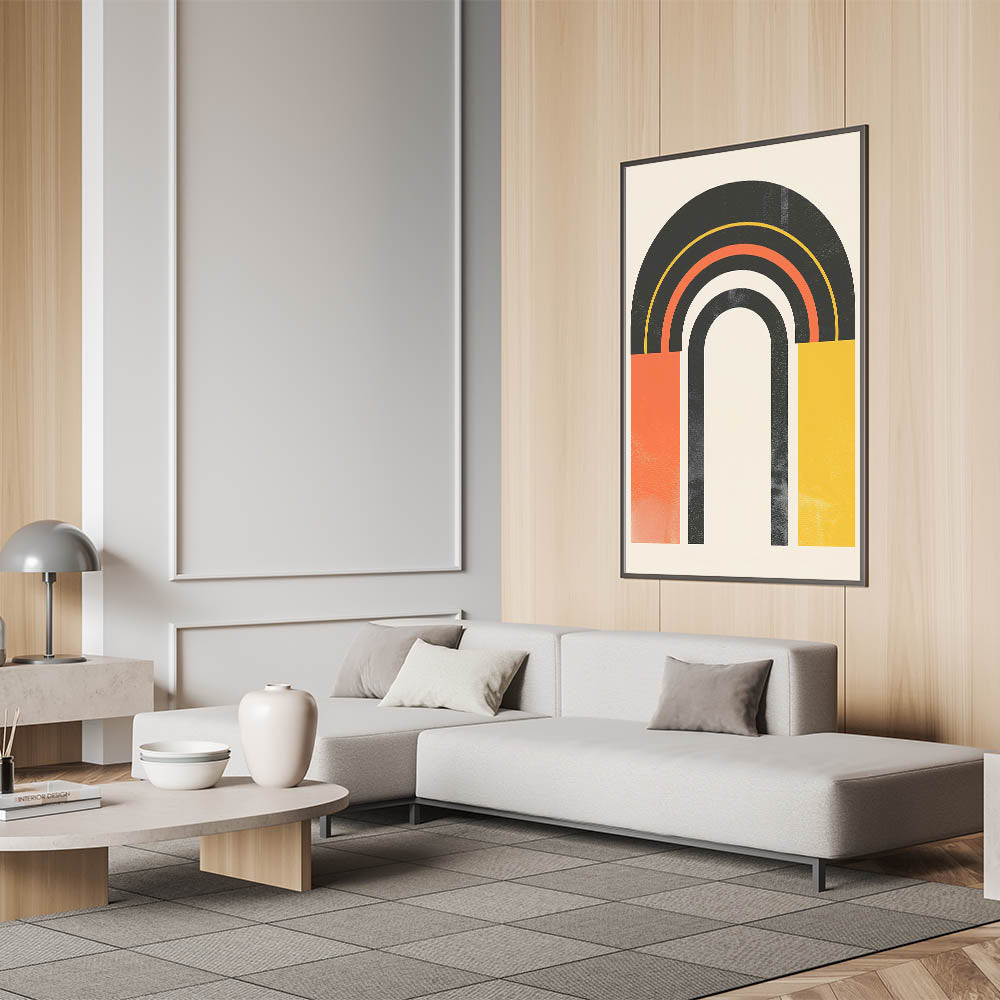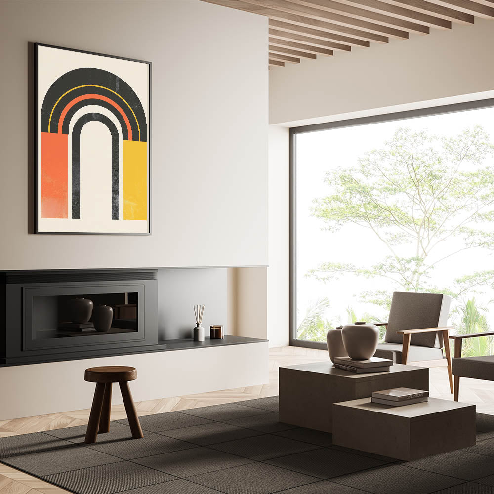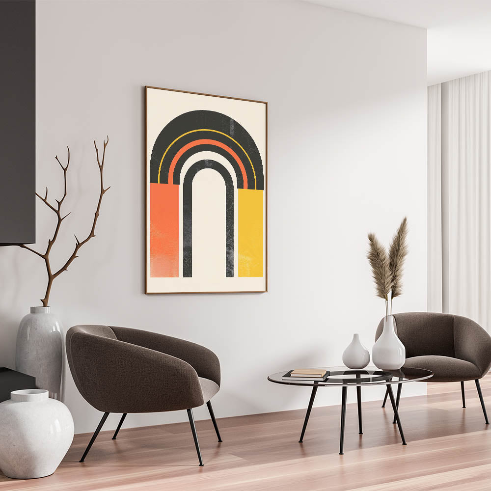 Elevate your living space with this stunning piece of Minimalist Abstract Art. This modern geometric design features bold arches in black, orange, and yellow, creating a captivating visual that perfectly balances simplicity and elegance. Whether you're looking to enhance your home or office decor, this piece adds a contemporary touch to any room.