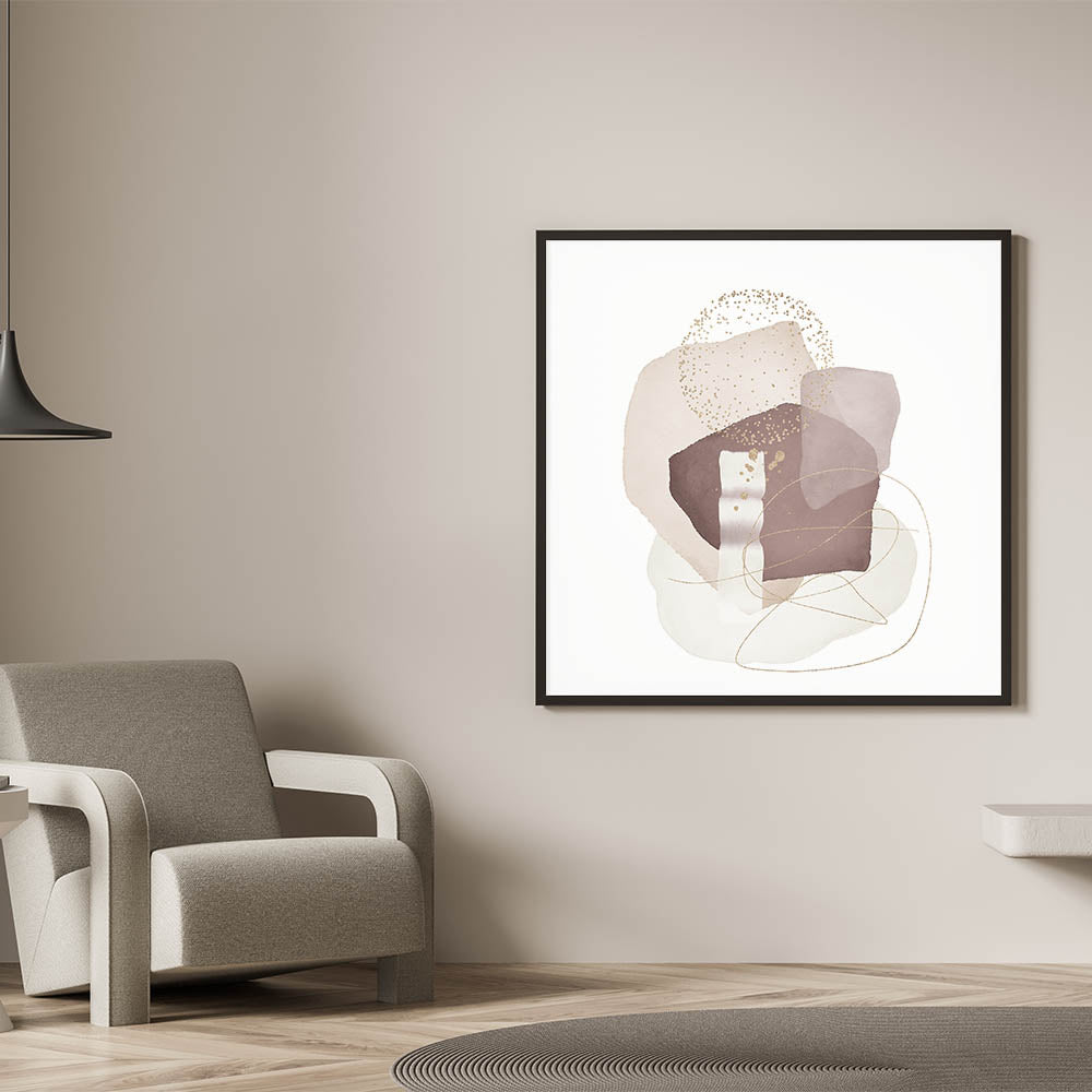 Create a serene and refined atmosphere with this geometric minimalist abstract wall art. Featuring a gentle mix of beige, brown, taupe, and soft white, this composition is elevated with golden accents that add texture and light. The soft-edged geometric shapes offer both structure and fluidity, blending seamlessly into modern interiors.