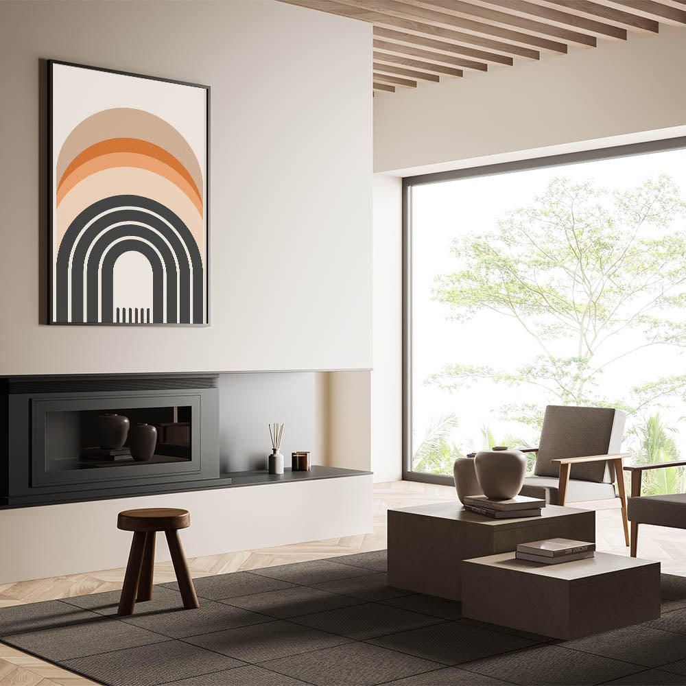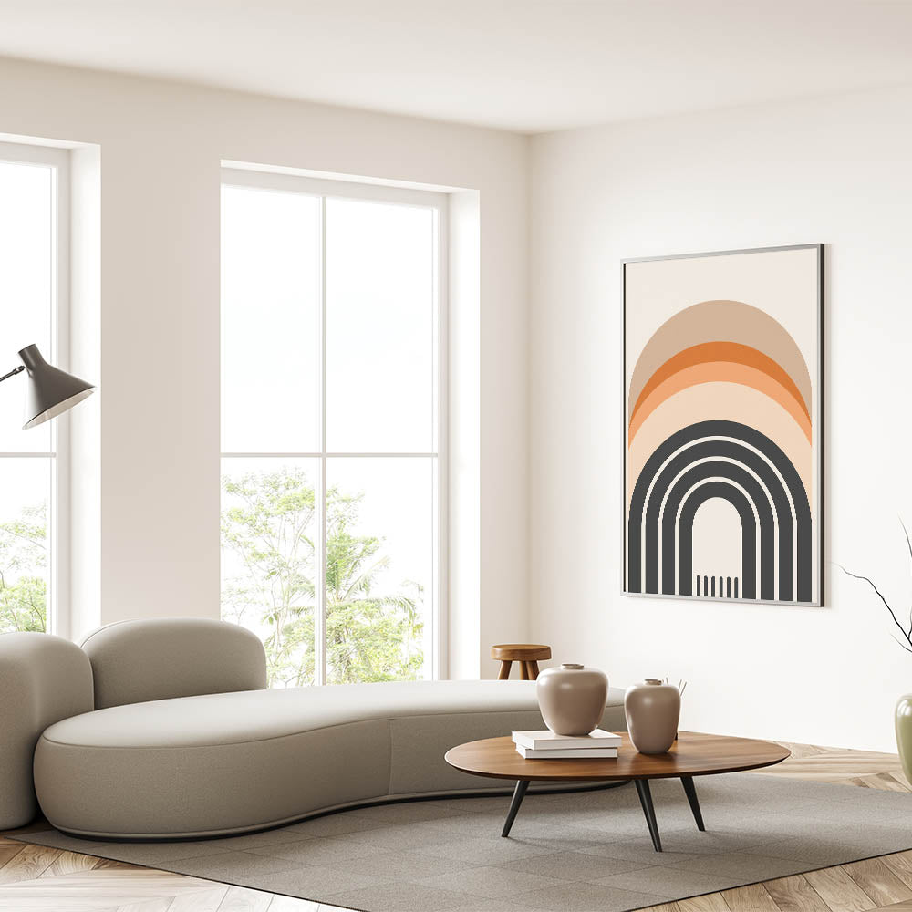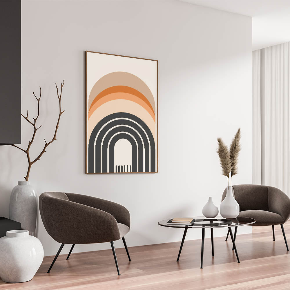 Enhance your interior with this striking minimalist geometric abstract art. Featuring a bold arch design in earthy tones of black, orange, and beige, this piece exudes modern elegance while maintaining a sense of simplicity. The layered arches create a dynamic visual that draws the eye and adds depth to your space, making it an ideal addition to contemporary decor.