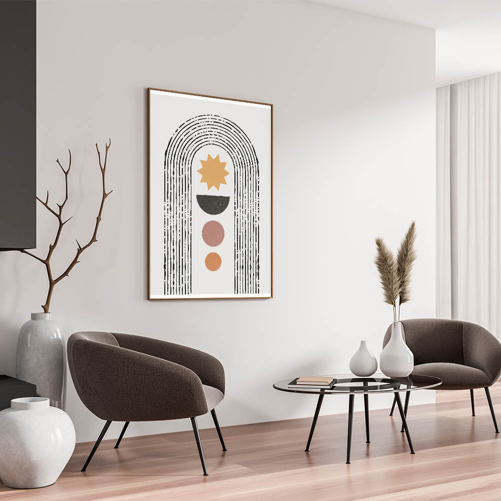 Enhance your living space with this striking piece of minimalist geometric art, featuring a bold arch, sunburst, and geometric shapes. This design blends modern simplicity with abstract elegance, creating a visually compelling piece that’s perfect for any contemporary setting. The artwork showcases a warm palette of black, brown, and orange tones against a soft off-white background, making it an ideal choice for those looking to add a touch of warmth and sophistication to their home decor.