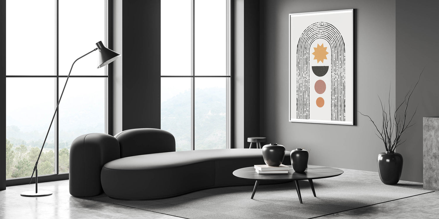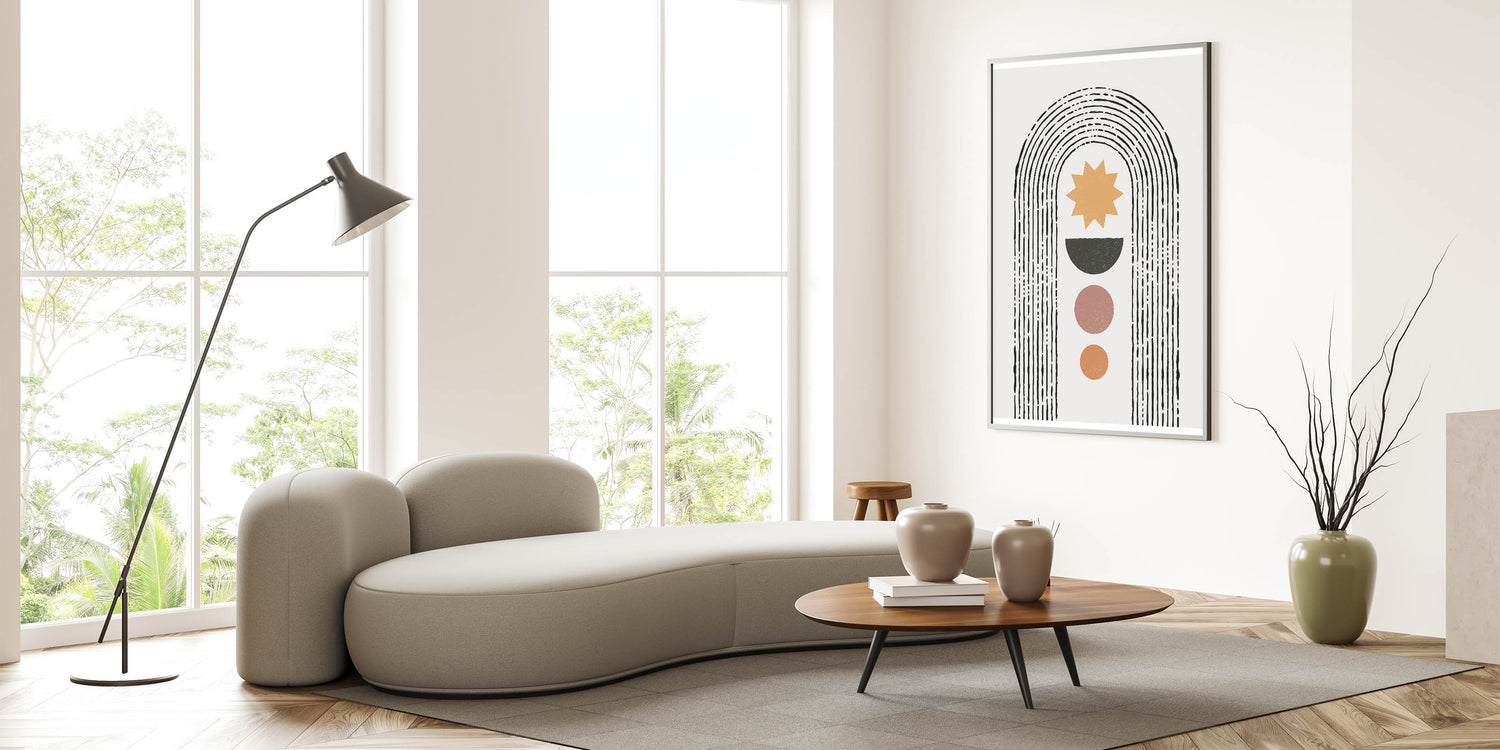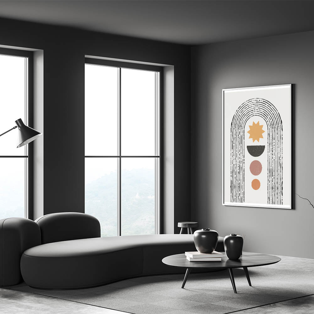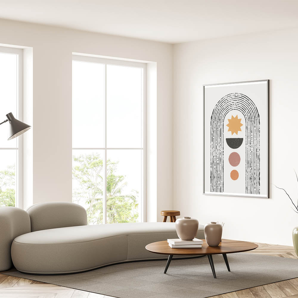• Design: Abstract geometric shapes with a sunburst, encased in a minimalist arch, perfect for modern interiors.