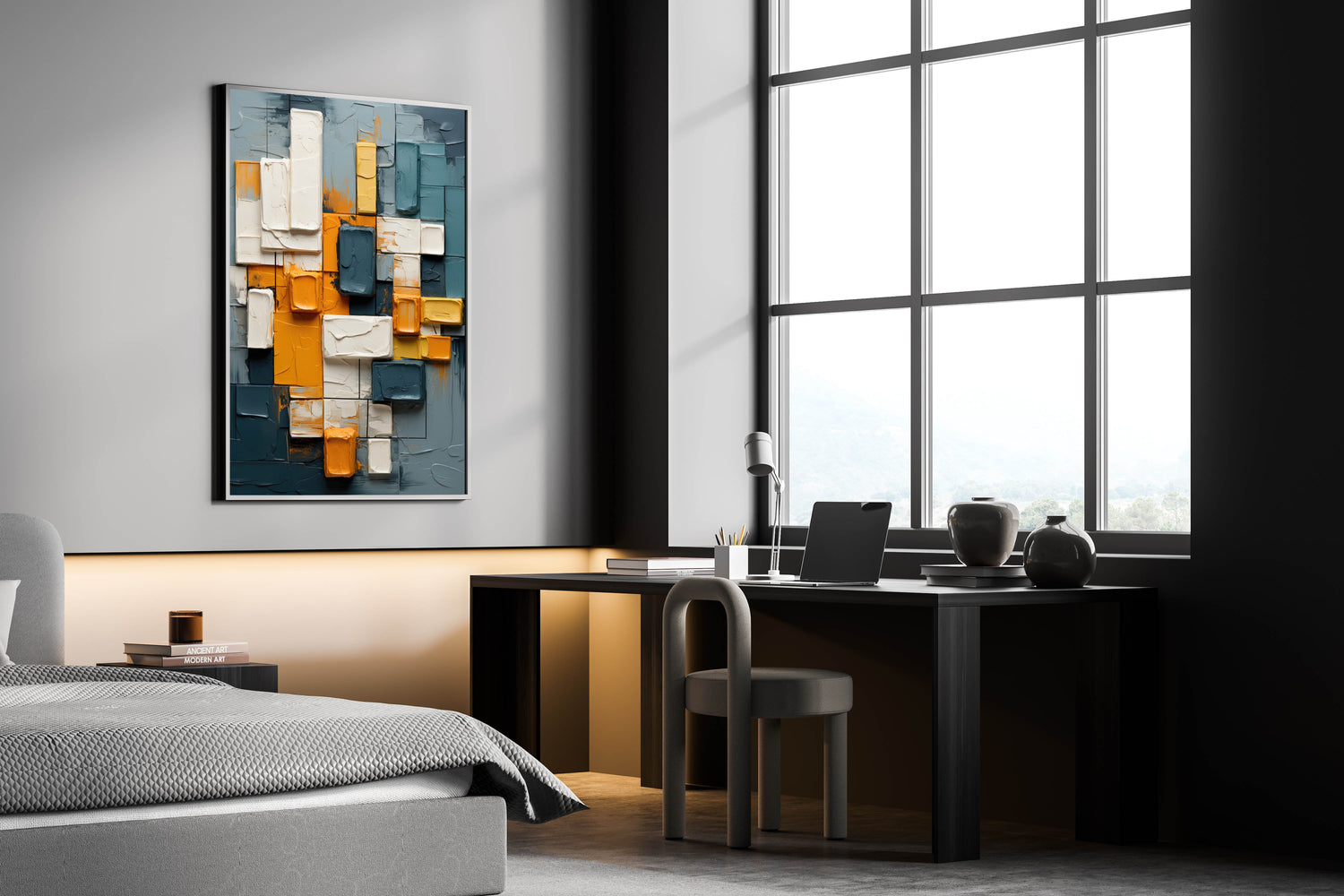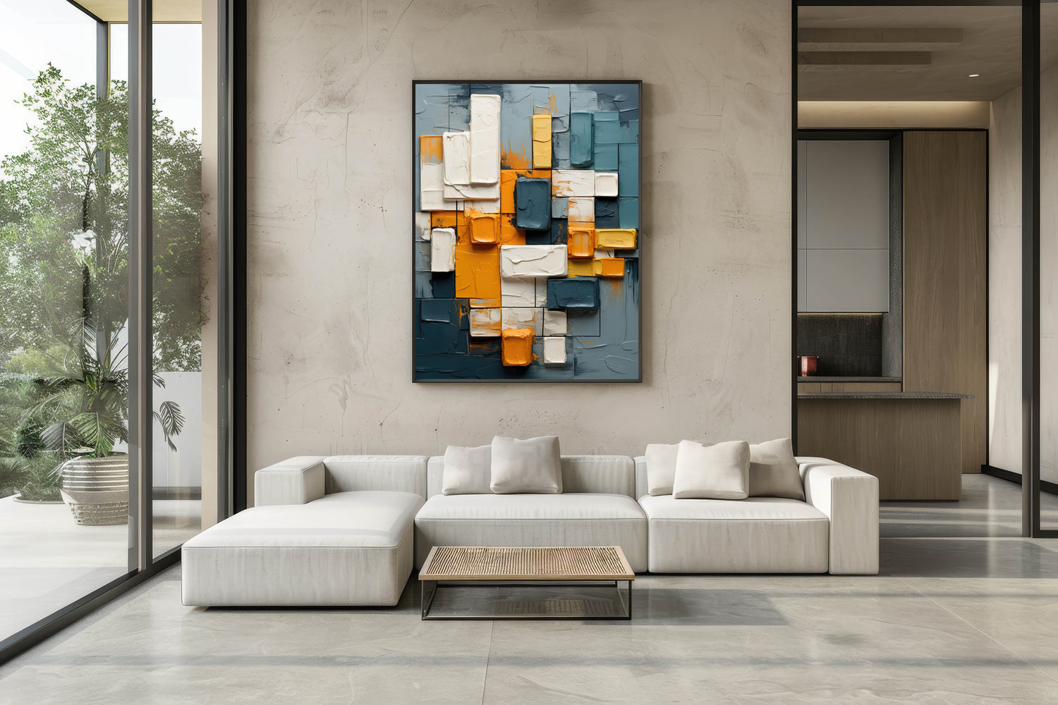 This striking modern abstract artwork features a captivating arrangement of textured blocks in shades of teal, mustard yellow, and white. The geometric composition and bold color palette create a dynamic visual experience, making this piece a perfect focal point for contemporary interiors. The mix of matte and glossy textures adds depth and dimension, giving the artwork a sculptural quality that draws the eye.
