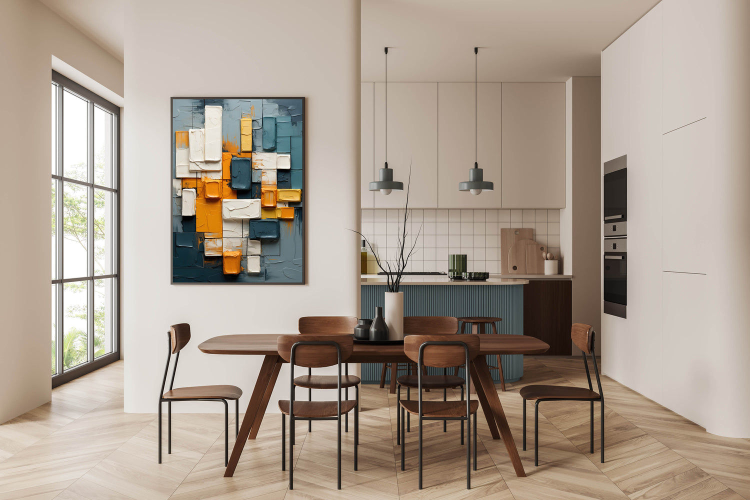 The modern abstract blocks art piece brings a fresh and vibrant look to your walls. Its unique design and blend of colors make it an excellent choice for those looking to add a touch of contemporary flair and sophistication to their decor.