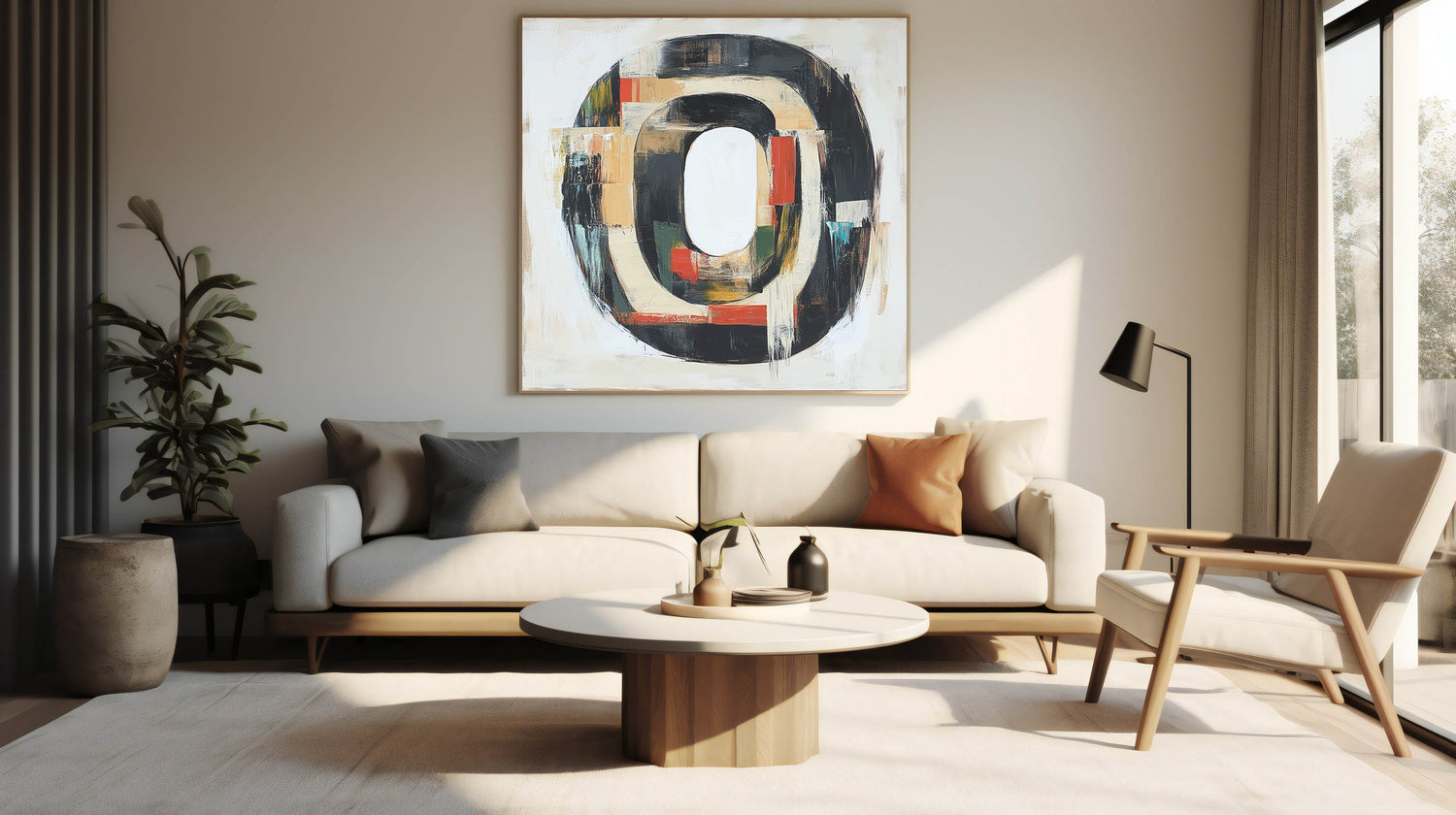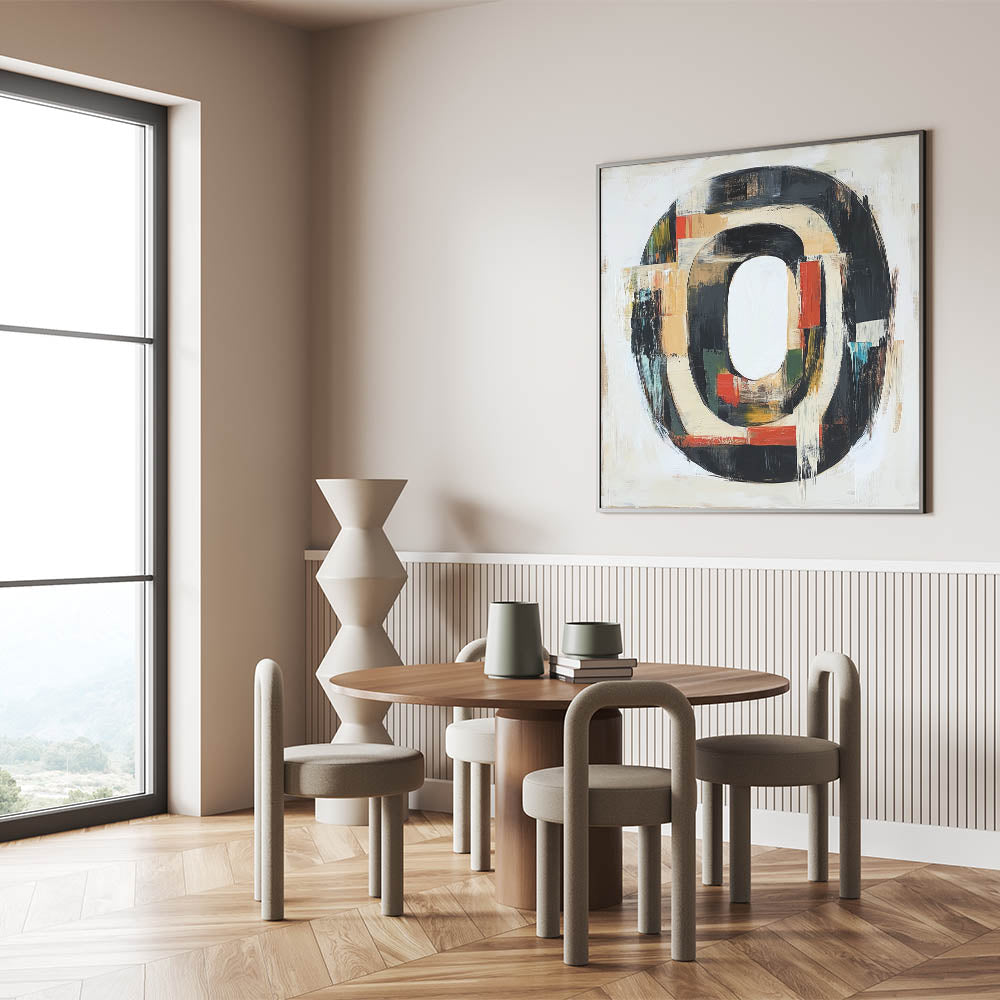 Elevate your space with this Abstract Expressionist Art for Home Decor, blending geometric balance with artistic expression. This Original Abstract Expressionist Painting features a structured circular design in black, beige, red, and green, creating a bold yet sophisticated statement piece. The Expressionist Canvas Wall Art combines textured brushstrokes with neutral and warm tones, perfect for contemporary interiors.