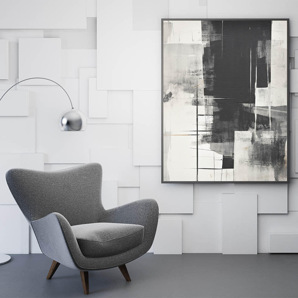 Transform your space with this striking piece of modern abstract wall art. Featuring a bold black and white color palette, this artwork showcases a minimalist geometric design that exudes contemporary sophistication. The sharp contrast between the deep black and soft white tones creates a dramatic and visually compelling piece that commands attention in any room.