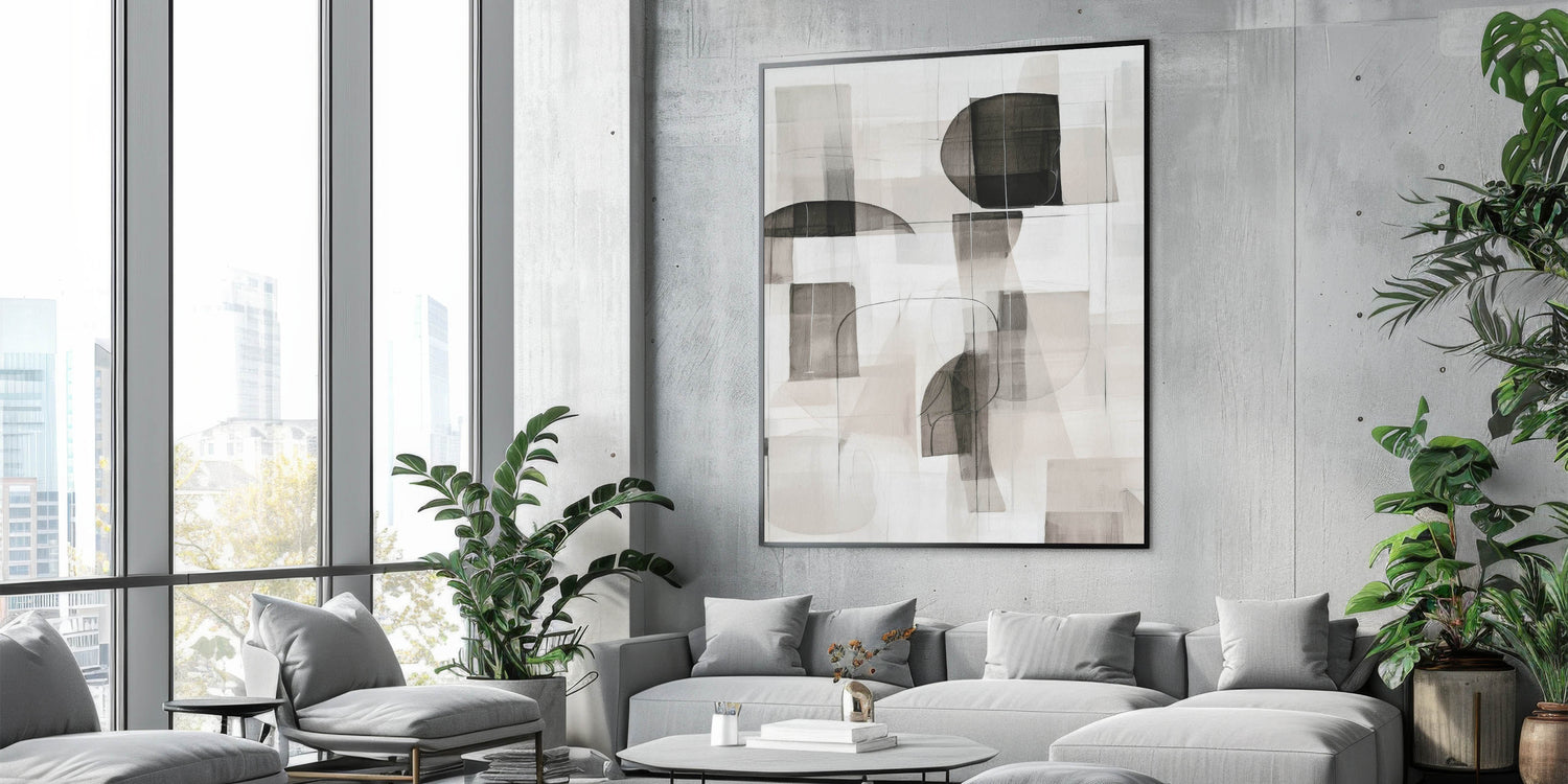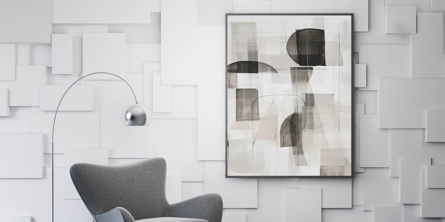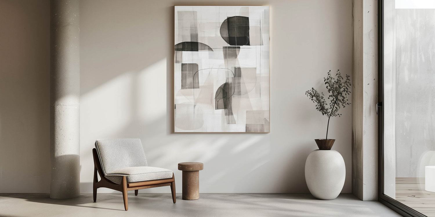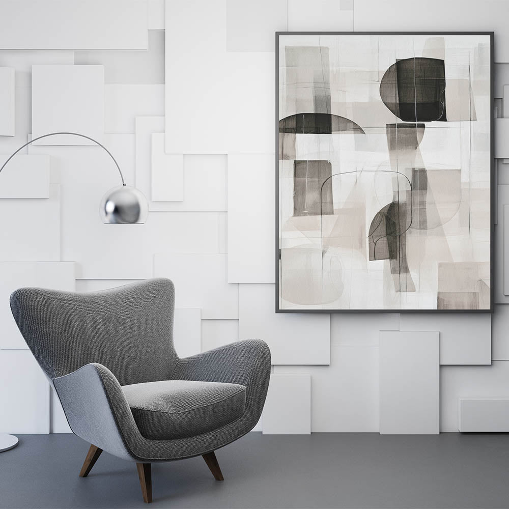 - Design: Modern abstract painting with minimalist geometric patterns in soft black and white hues.