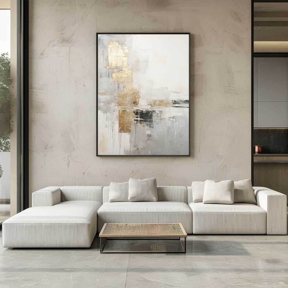 Infuse your space with a sense of refined elegance with this modern abstract wall art, featuring subtle gold and gray geometric layers. The delicate interplay of metallic gold accents with soft grays and whites creates a sophisticated and serene atmosphere, perfect for enhancing the aesthetic appeal of any room.