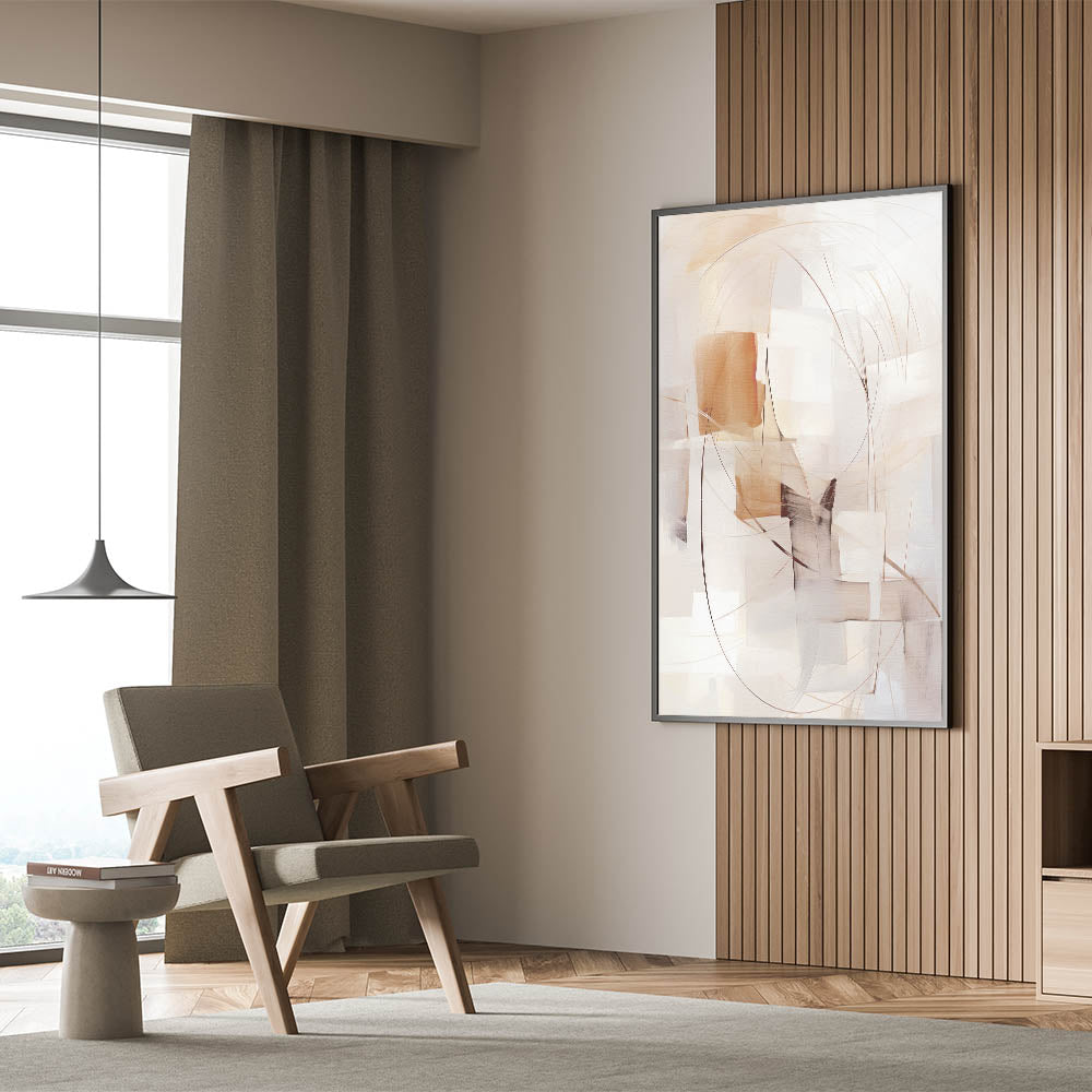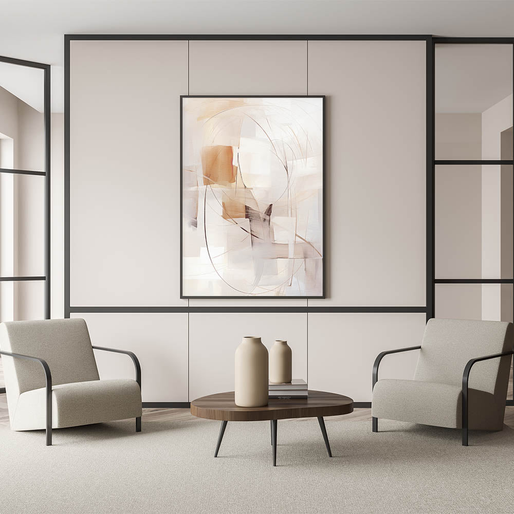 Enrich your space with this captivating piece of modern abstract wall art. This artwork features a delicate blend of warm tones, including soft beiges, warm browns, and subtle whites, intertwined in a minimalist geometric design. The flowing lines and balanced composition create a sense of movement and harmony, making it a perfect addition to both contemporary and traditional interiors.