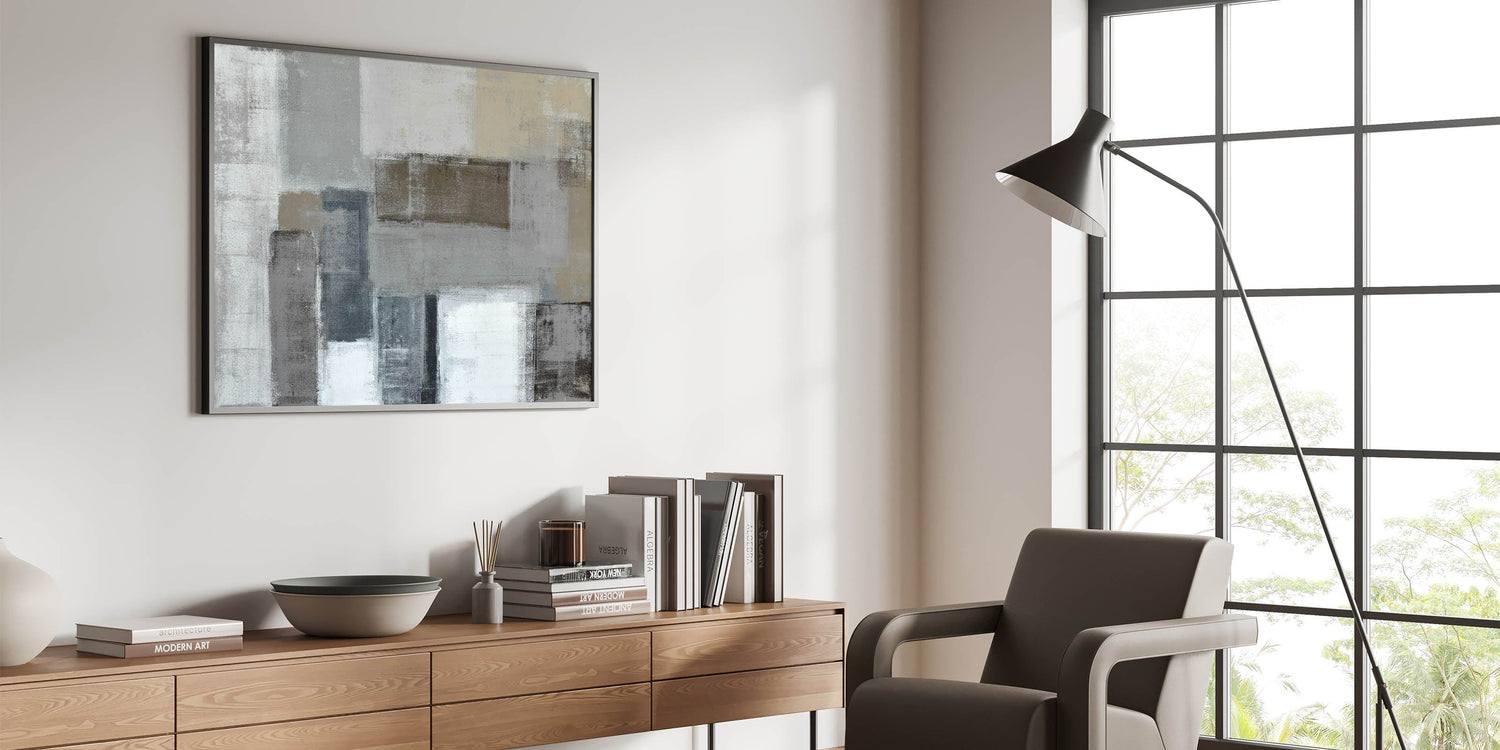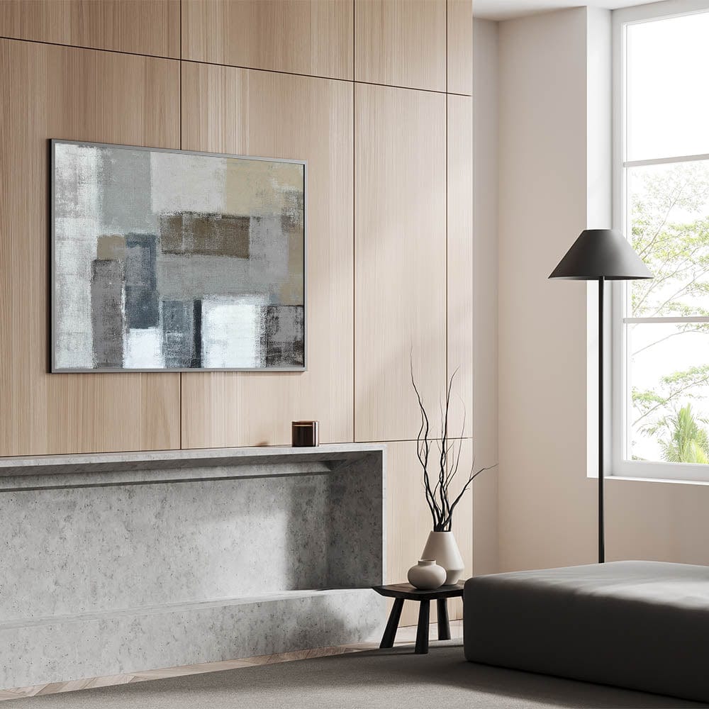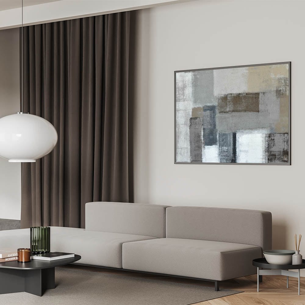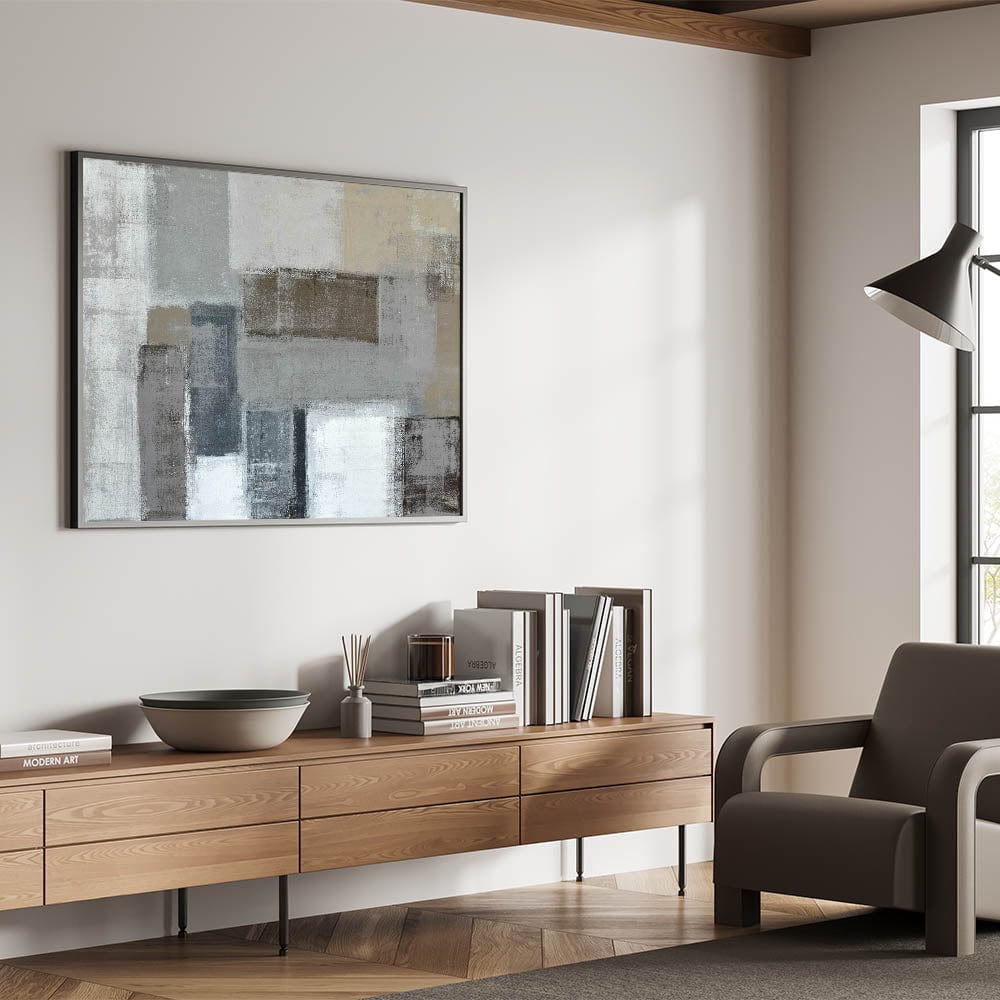Add an elegant touch to your space with this modern art print, a refined blend of gray, white, beige, and dark brown tones. The geometric shapes and subtle textures create a structured yet artistic aesthetic, making this abstract canvas wall art perfect for contemporary and industrial interiors. The neutral color palette ensures versatility, allowing it to complement various décor styles.