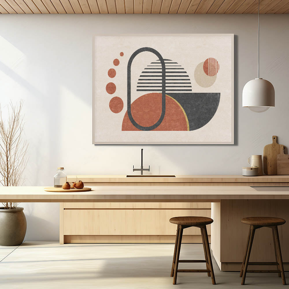 Introduce a touch of contemporary elegance to your space with this "Modern Geometric Abstract Art." This canvas print features a captivating composition of geometric shapes and lines in black, red, beige, and gold hues. Perfect for modern interiors, this artwork blends minimalist strokes with abstract patterns, creating a visually dynamic and sophisticated atmosphere.