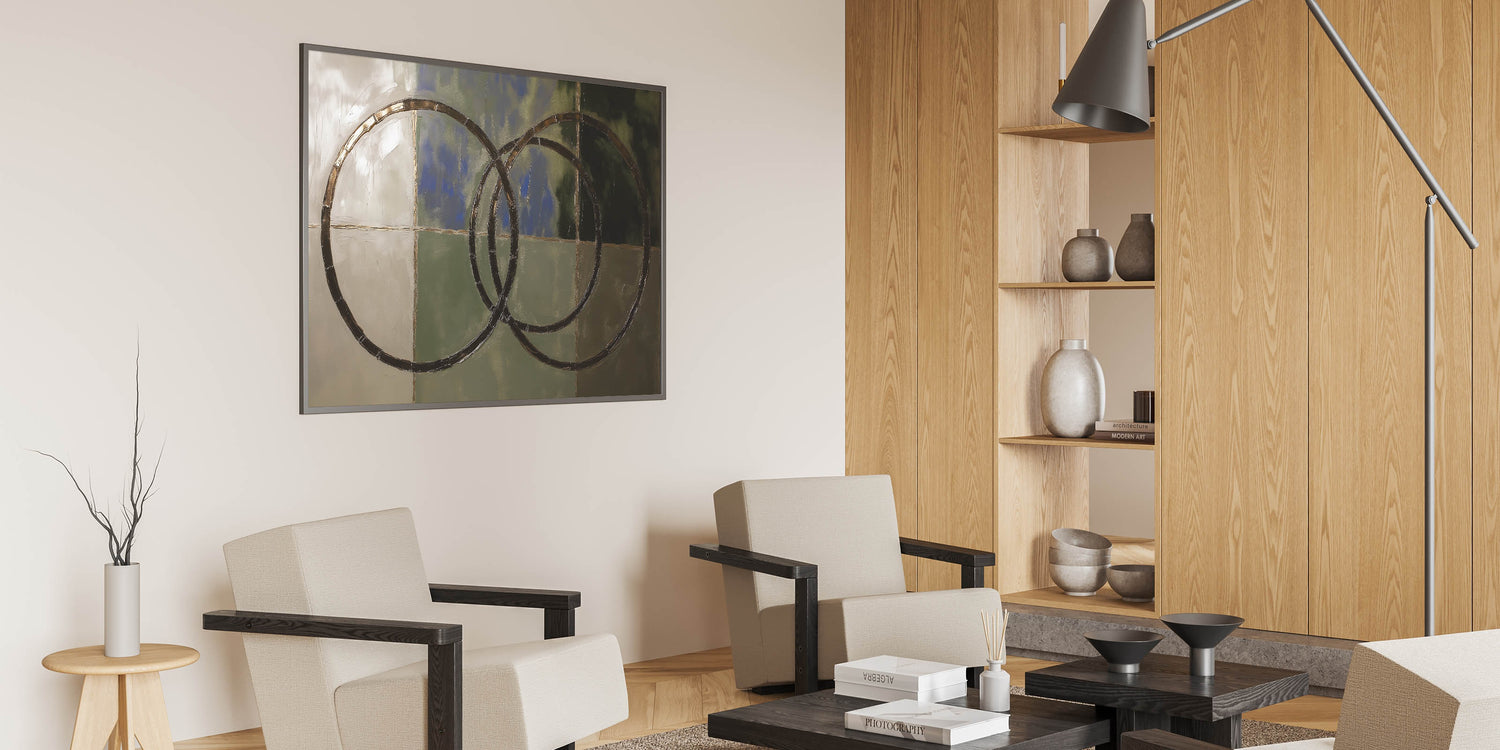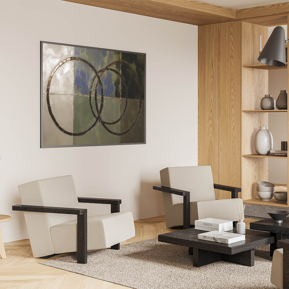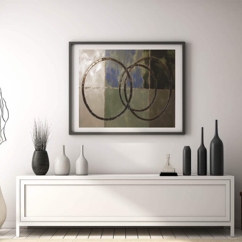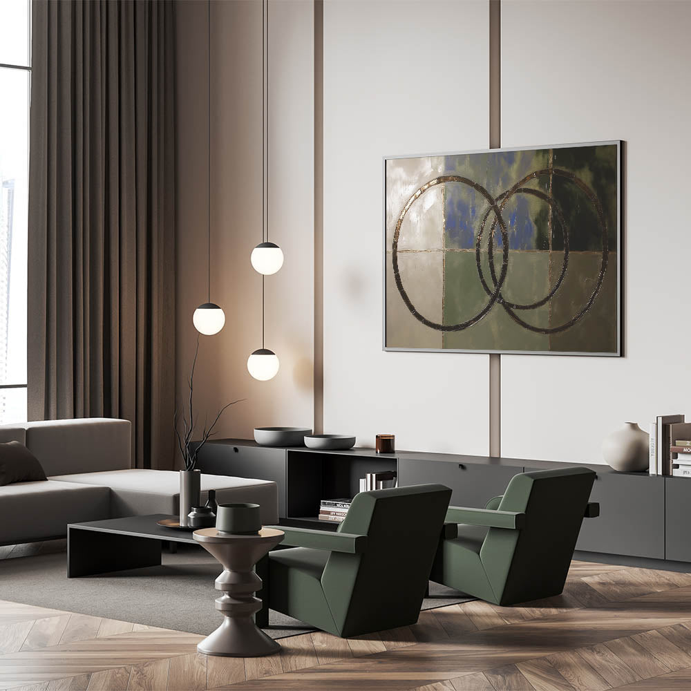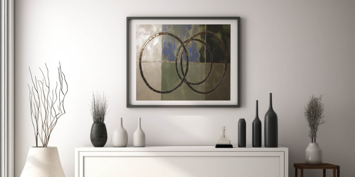 Enhance your home with this Modern Geometric Art Print, featuring an elegant composition of intersecting rings over a split-tone background of soft greens and muted blues. This Contemporary Abstract Canvas combines simplicity and depth, making it the perfect centerpiece for modern home decor or a statement piece in your living room.